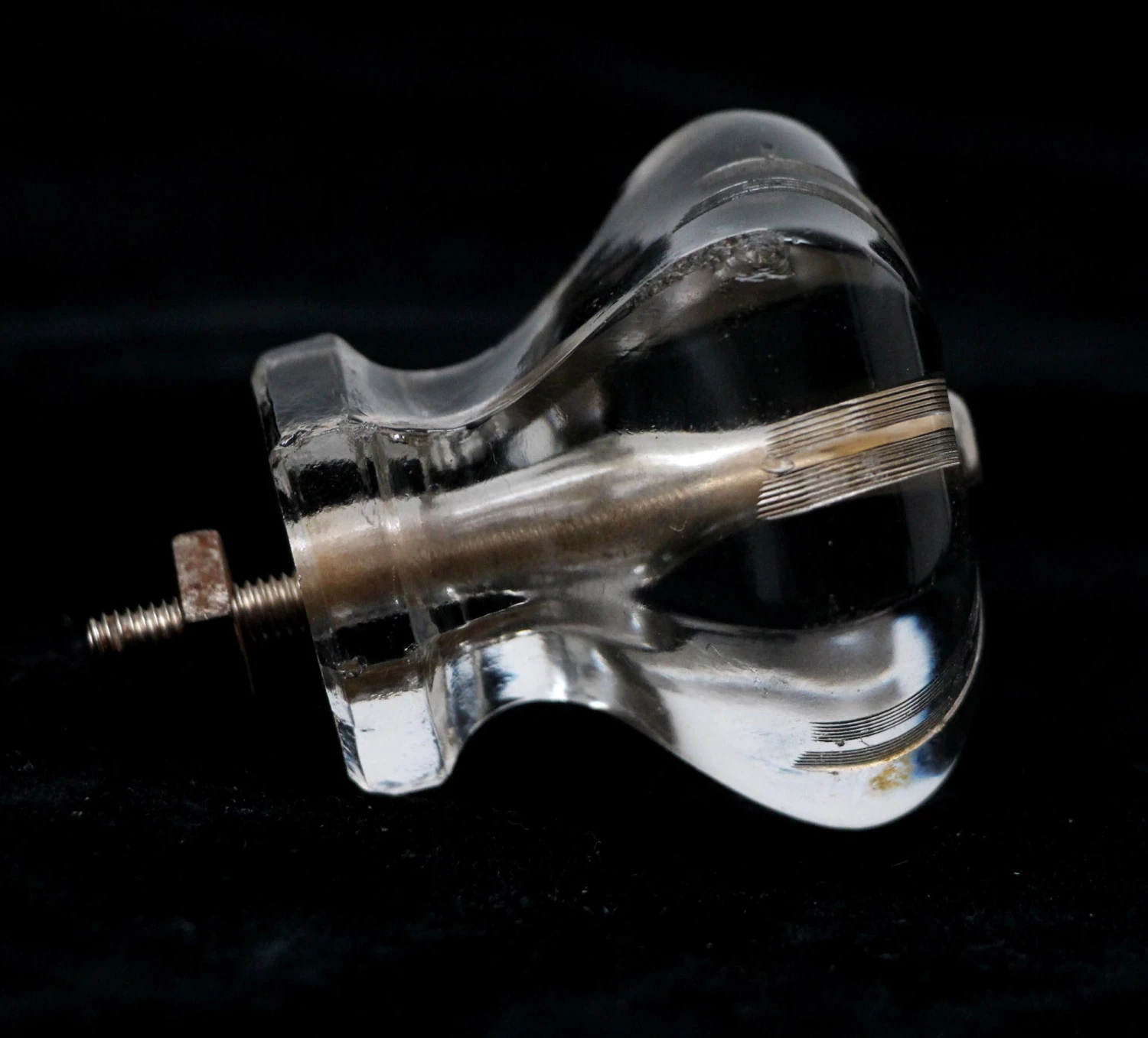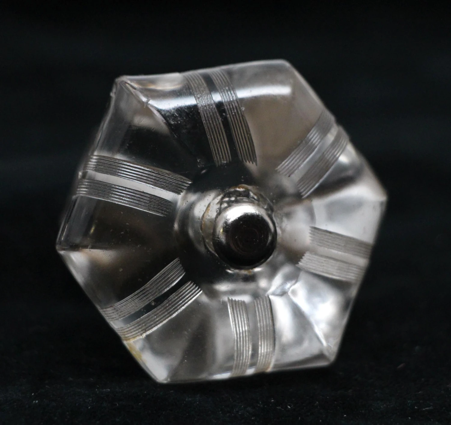 Hexagon shaped clear glass drawer or cabinet knob with an etched design. Priced each.