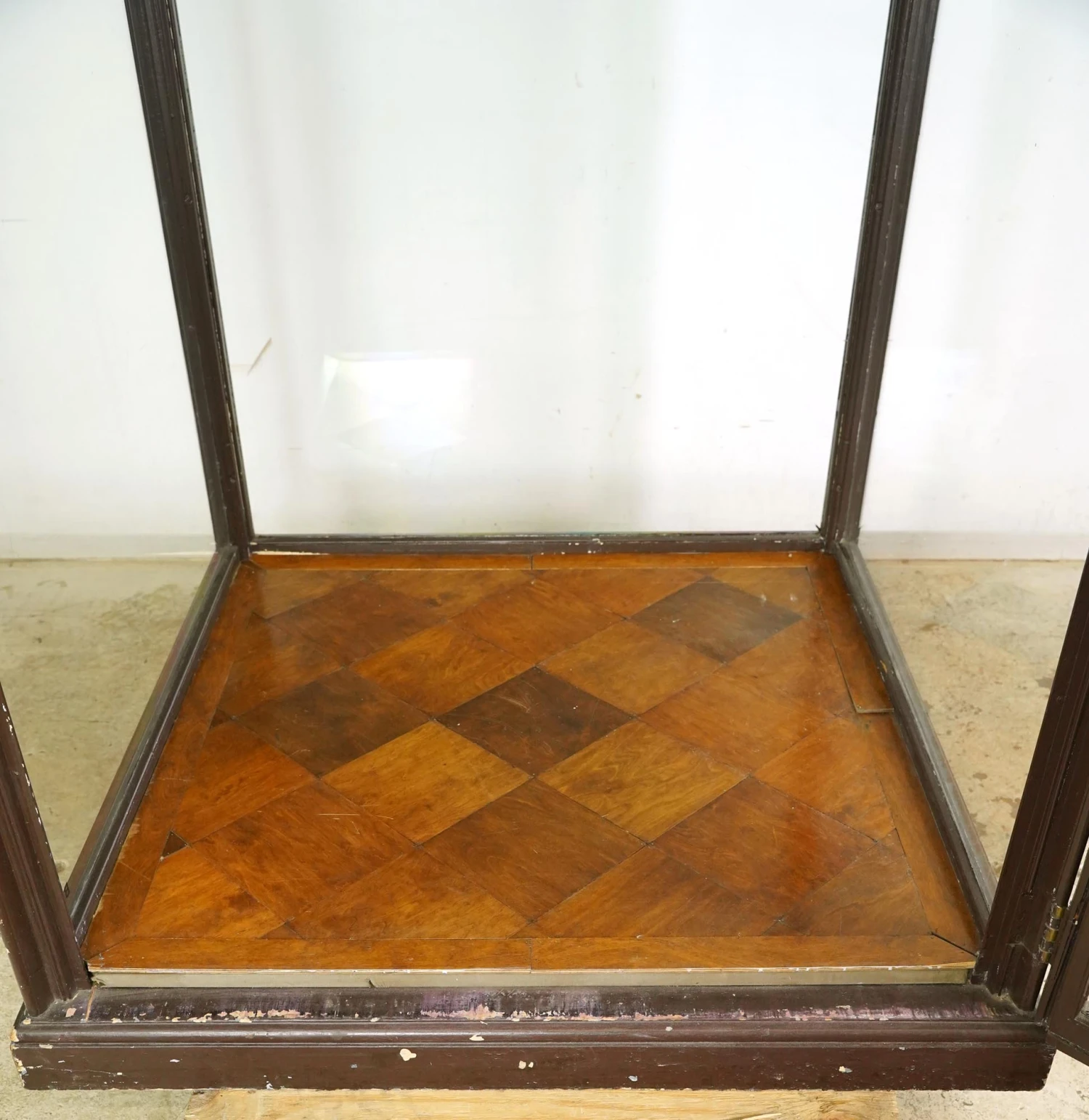 1910s English museum display case or vitrine. Full clear glass on all sides and top with safety film to prevent shattering. Maple parquet floor with wear from use. Brass hardware marked Hobs & Co. London is patent dated 1863. Good condition with surface wear from prior use. Please refer to the pictures for a full view of the condition. At the time of posting, also there are two similar ones available as Q287587.