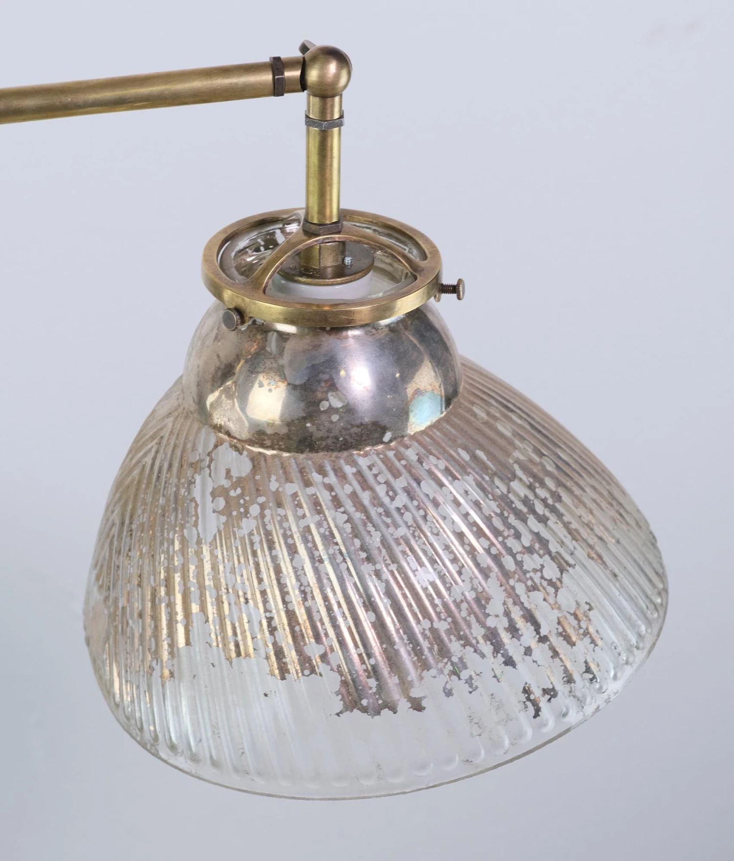 Mercury glass X-Ray shades mounted on a brass double light fixture with articulating arms. The paint on the outside of the glass has been stripped off, leaving the silvered inside coating with general wear from age. This is wired and ready to ship.