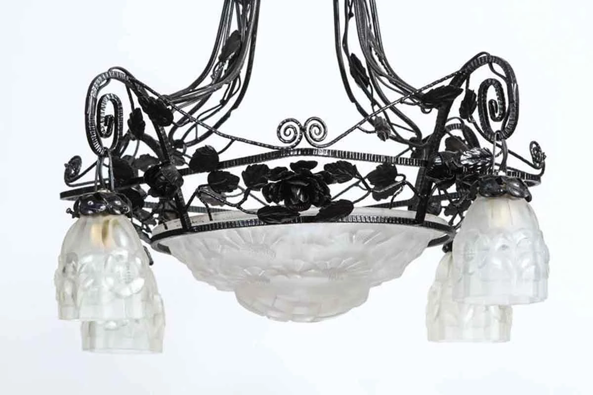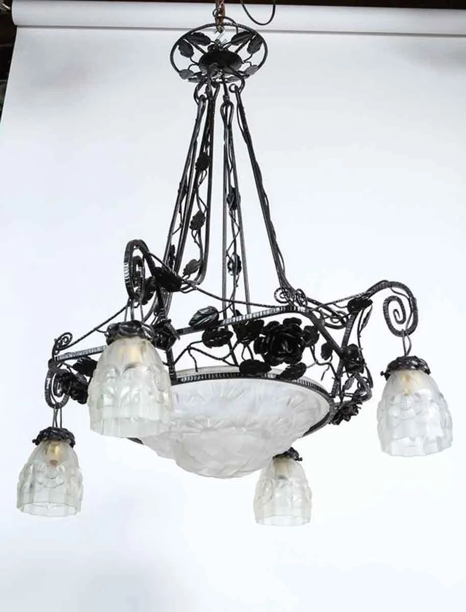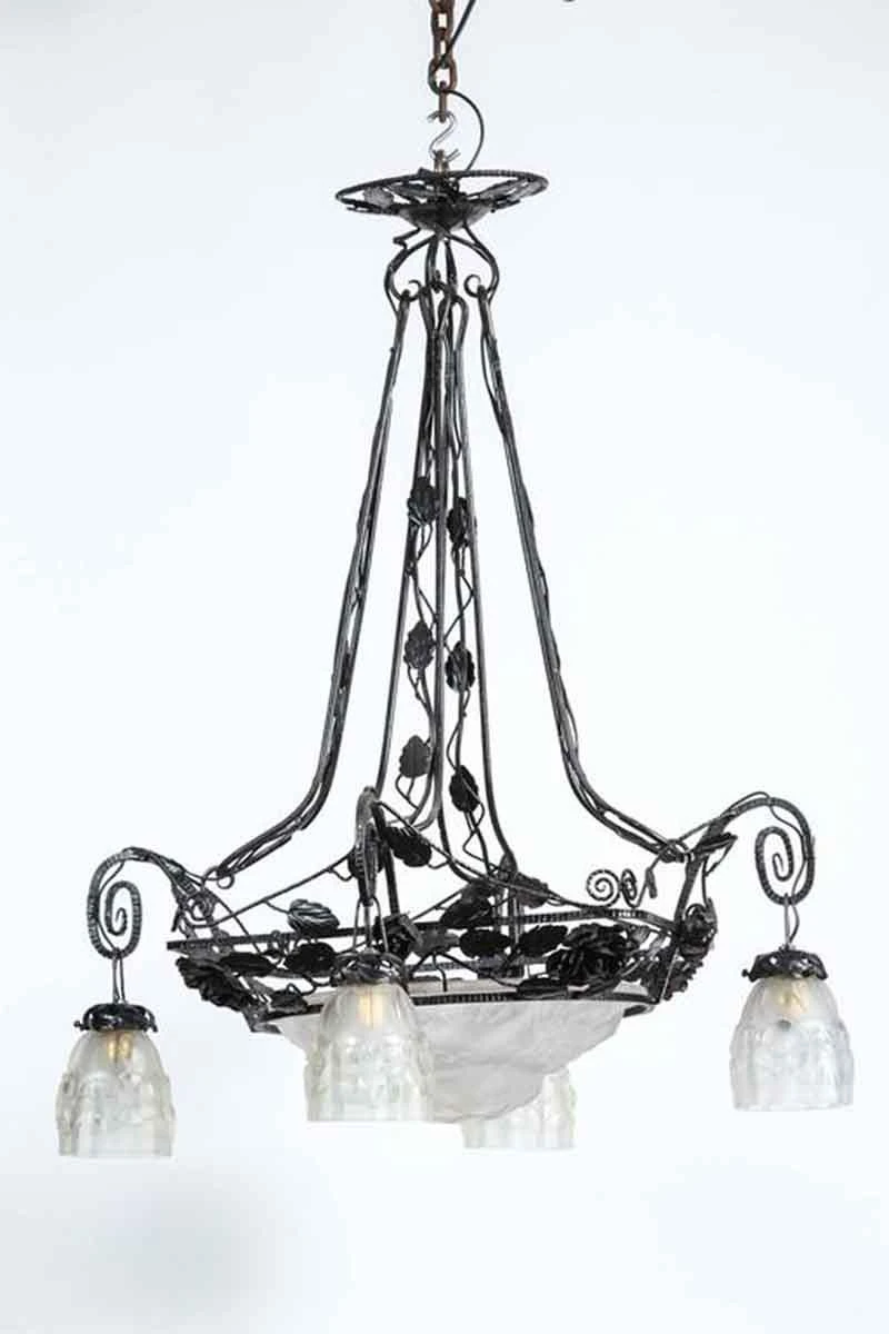 1930s Art Deco Wrought Iron & Glass 4 Light Chandelier