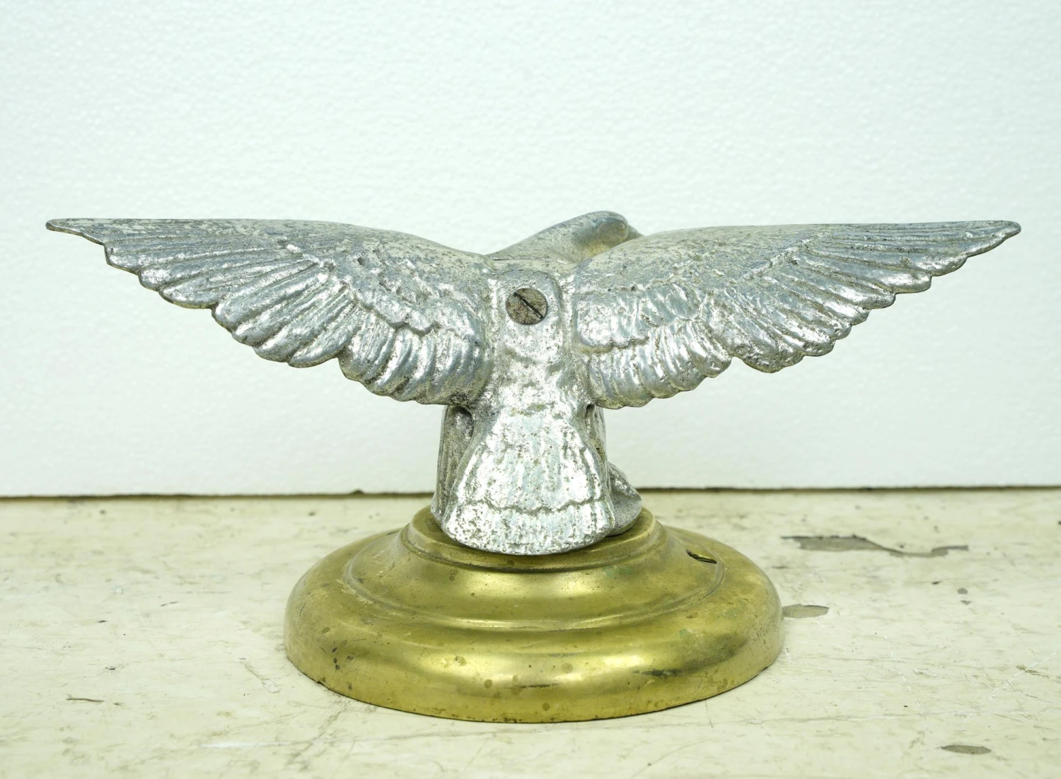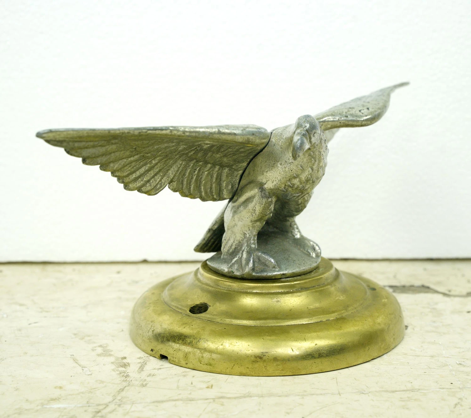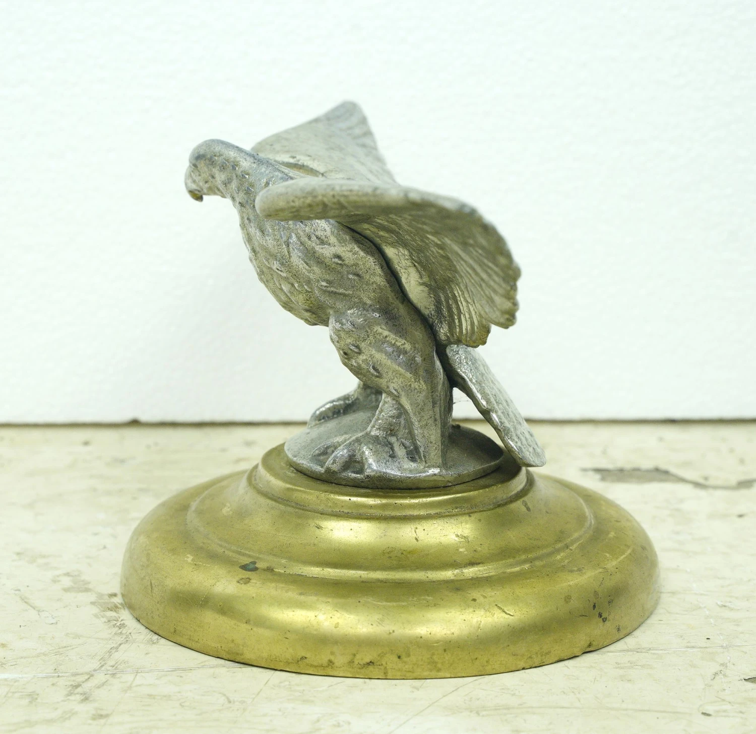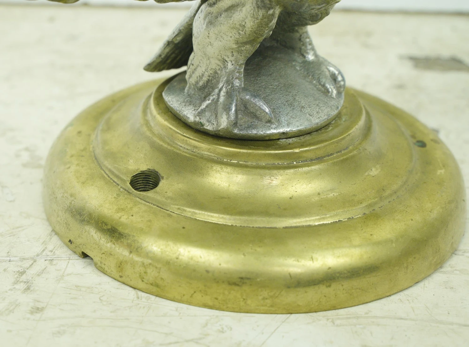 This aluminum eagle statue combines grace and strength. Crafted from aluminum with a brass base, it forms an elegant wing spread eagle motif. This statue adds a touch of sophistication to desks and shelves, showcasing a symbol of freedom and power in a refined design. This is in good condition with surface wear from age.