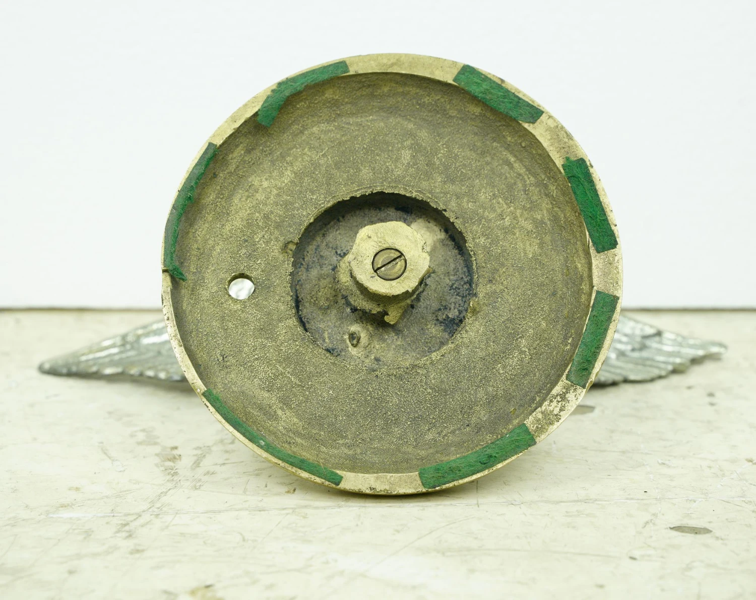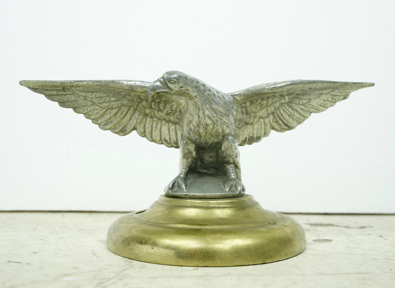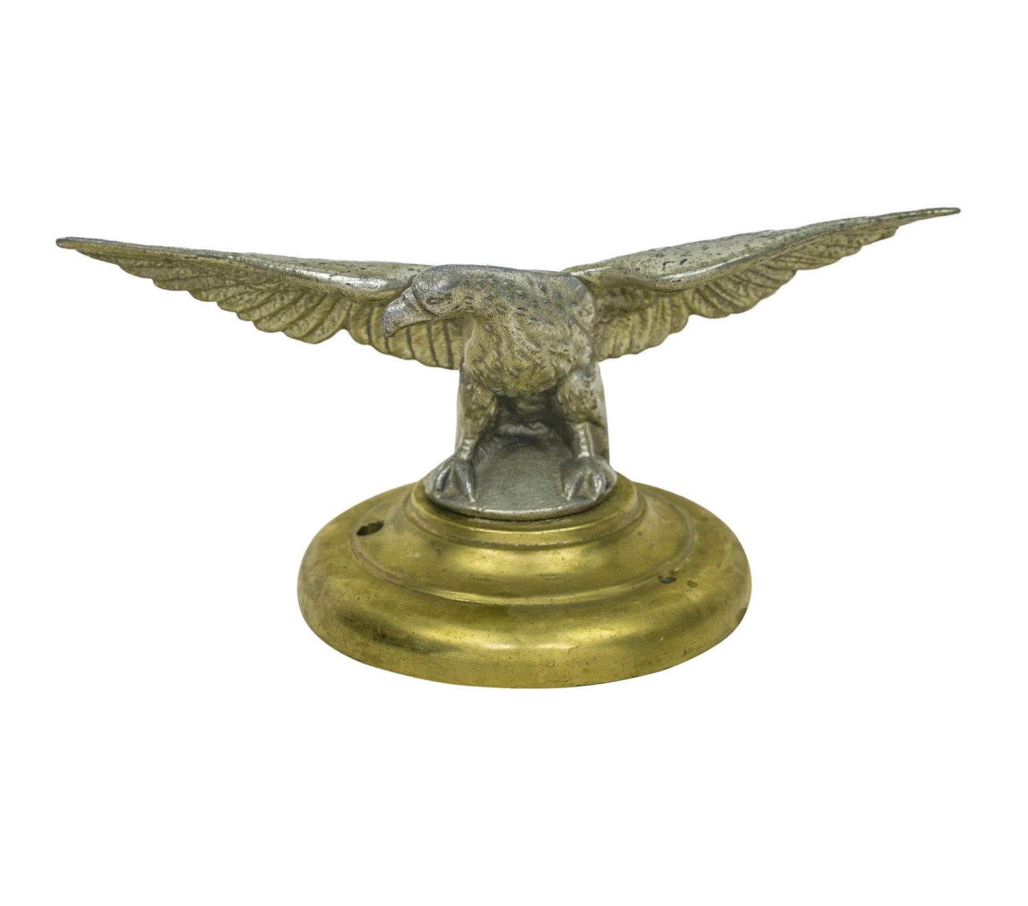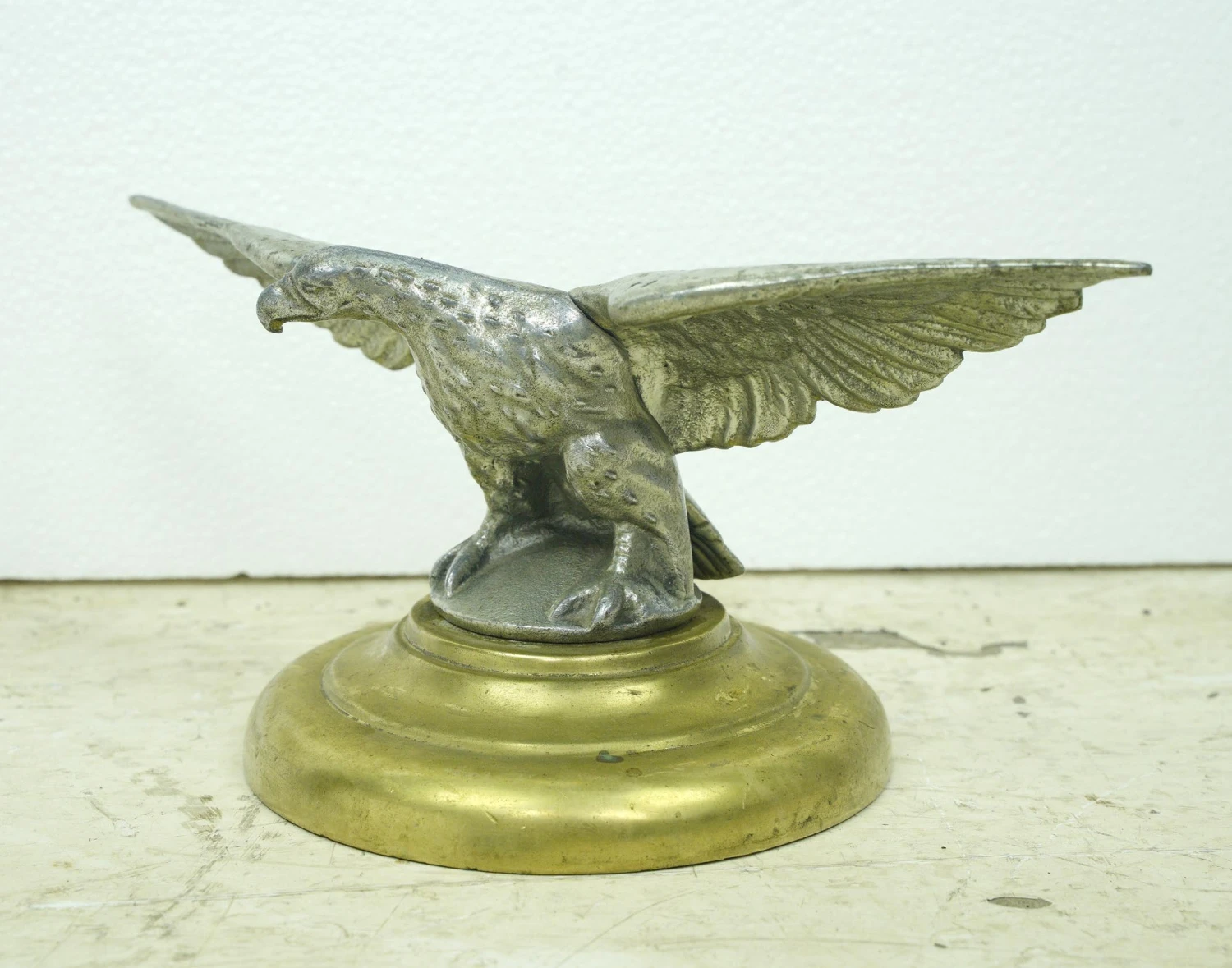 This aluminum eagle statue combines grace and strength. Crafted from aluminum with a brass base, it forms an elegant wing spread eagle motif. This statue adds a touch of sophistication to desks and shelves, showcasing a symbol of freedom and power in a refined design. This is in good condition with surface wear from age.