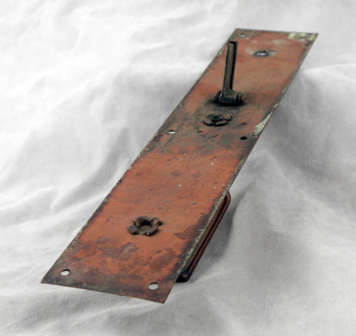 Solid bronze door pull with a raised beveled edge with a thumb latch and lock feature.