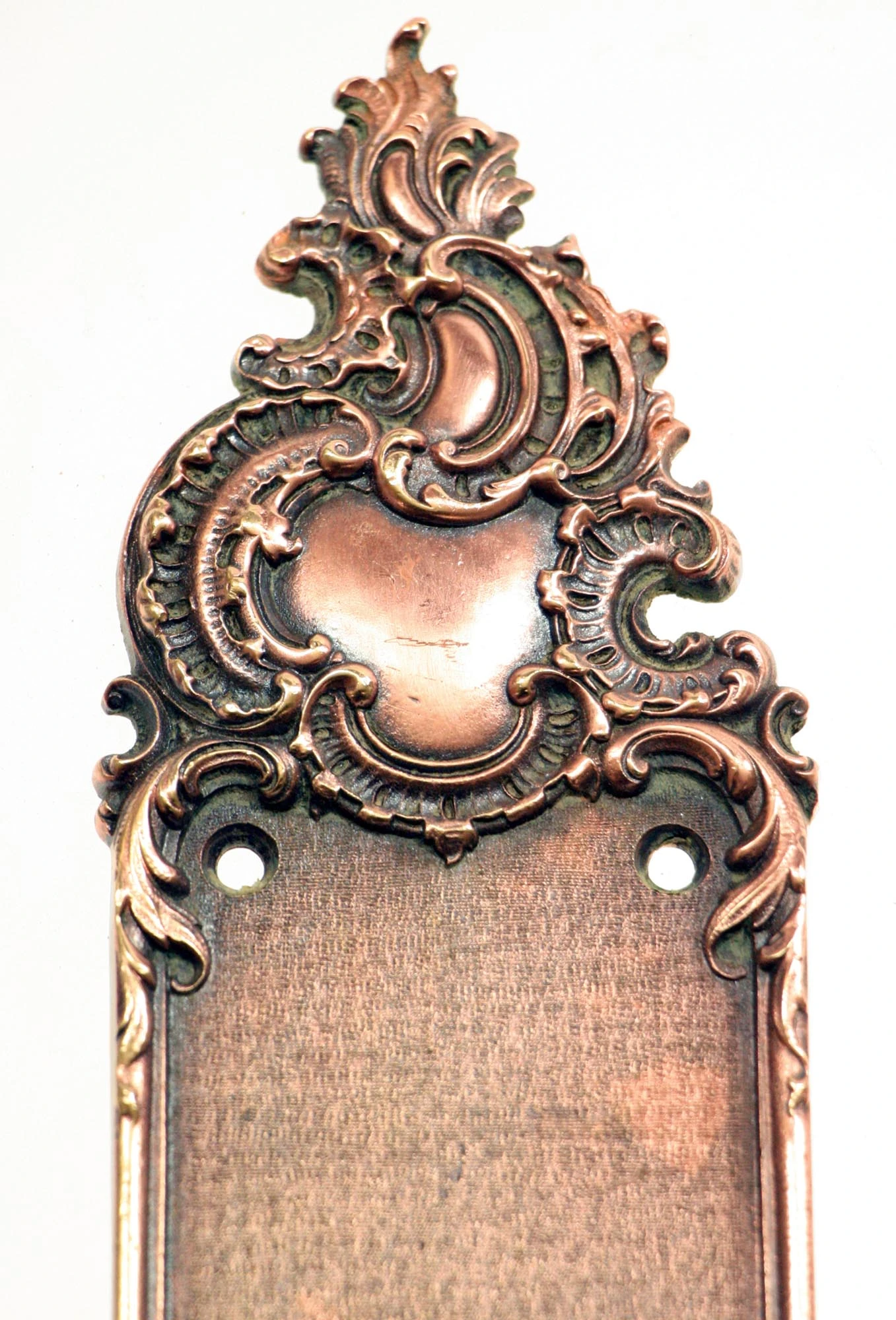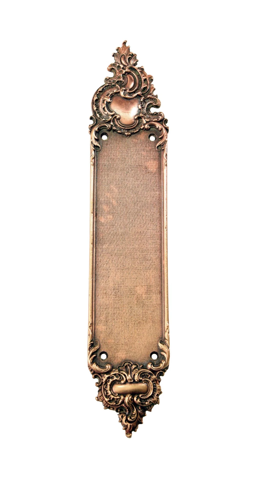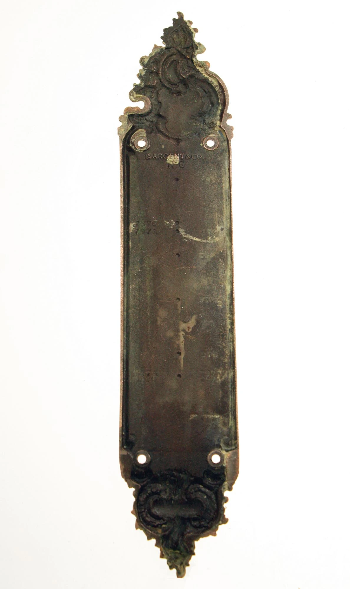 Sargent brand copper plated bronze push plate with an Art Nouveau style, embellished with a rich array of classically inspired ornamentation from the Victorian era. One available.