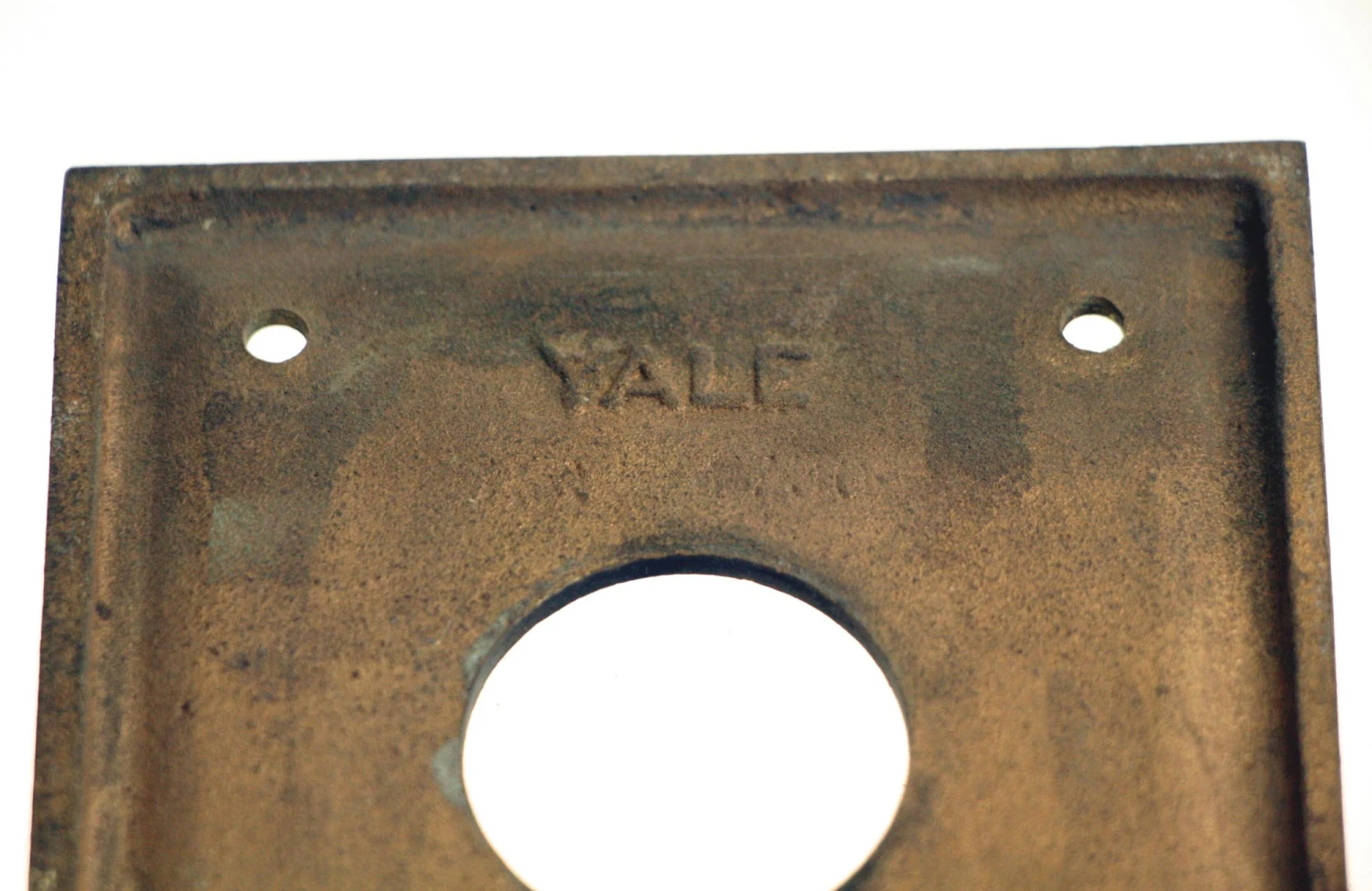 Yale Art Deco bronze push plate with a cylinder lock insert. Lock not included. This is designed for commercial or residential interiors. It is typically used on a pivoting interior door with matching plates on each side. Door plates are used to protect the wood of a door that closes automatically. One available.