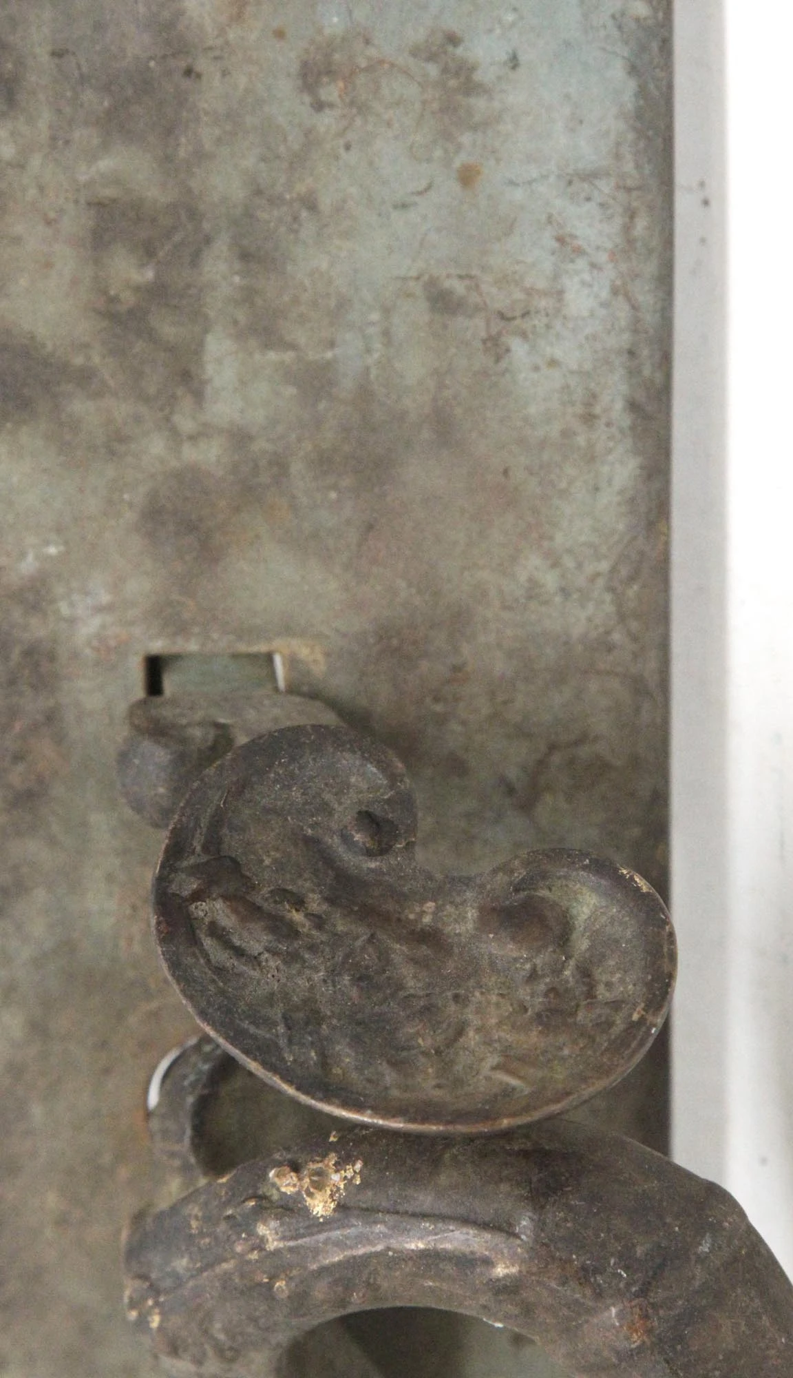 This Victorian bronze door pull features an ornate thumb latch and lock insert. There is minor wear. One available.