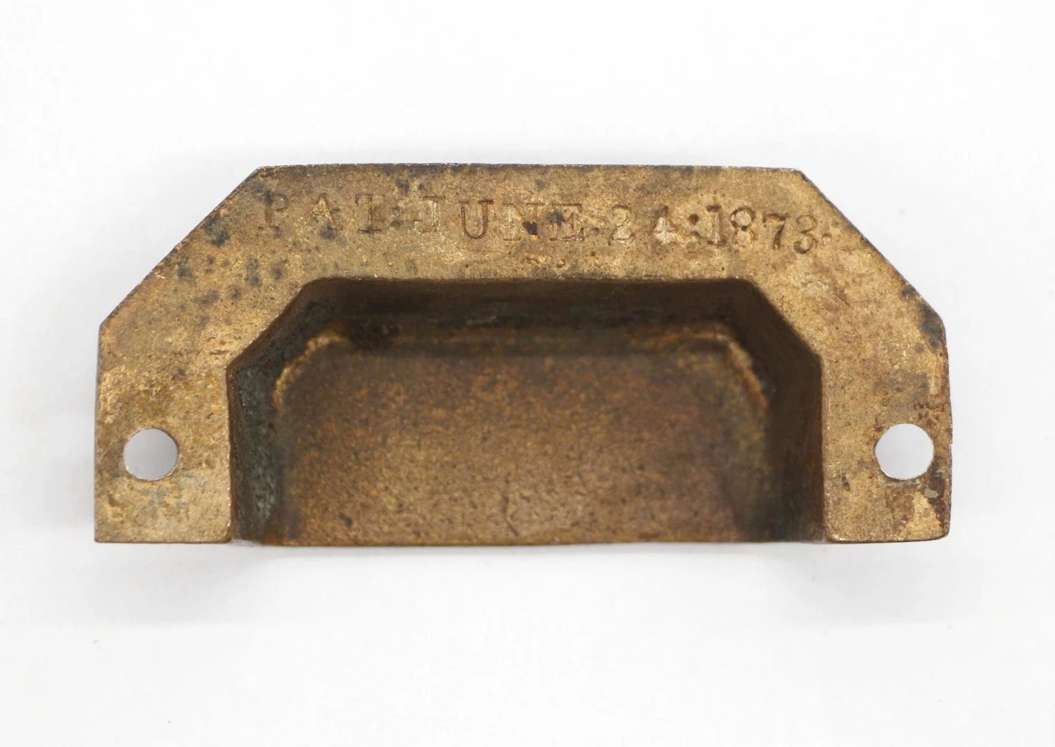 Victorian Greek key bronze bin pull with original patina and an antique bronze finish. Stamped June 24, 1873. Good condition with appropriate wear from age. Priced each.