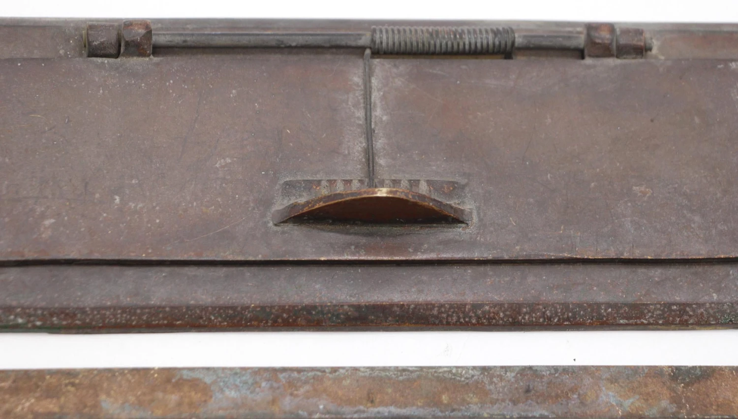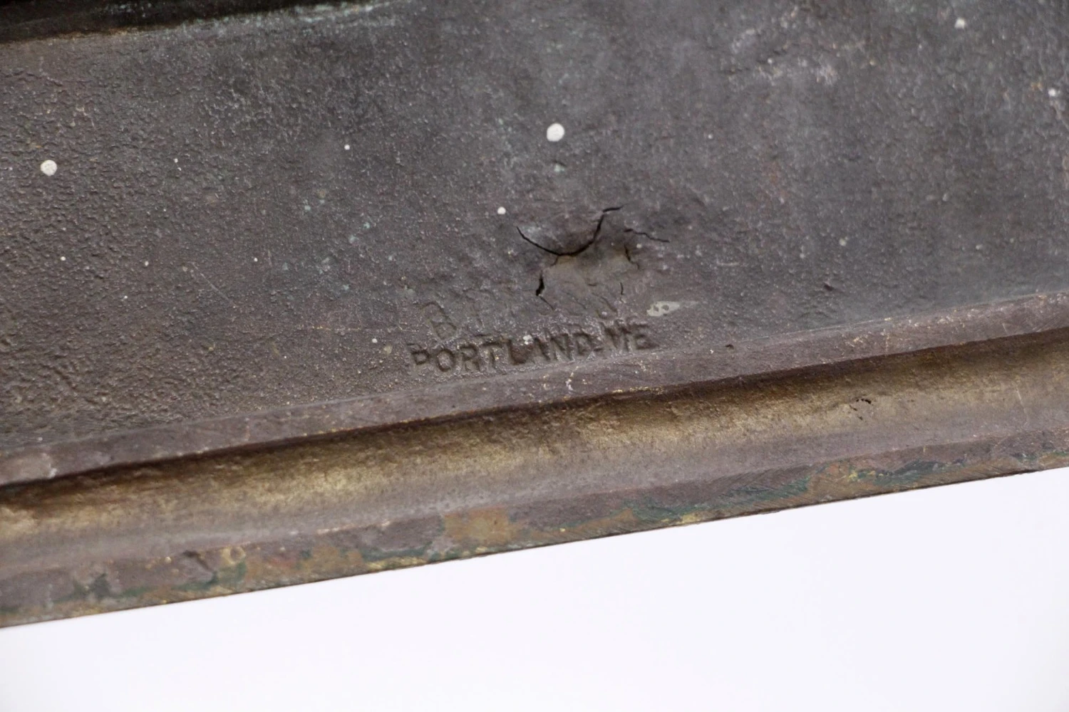 There is paint on the front and a crack on the slot. Stamped Portland ME. Good condition with appropriate wear from age. One available.