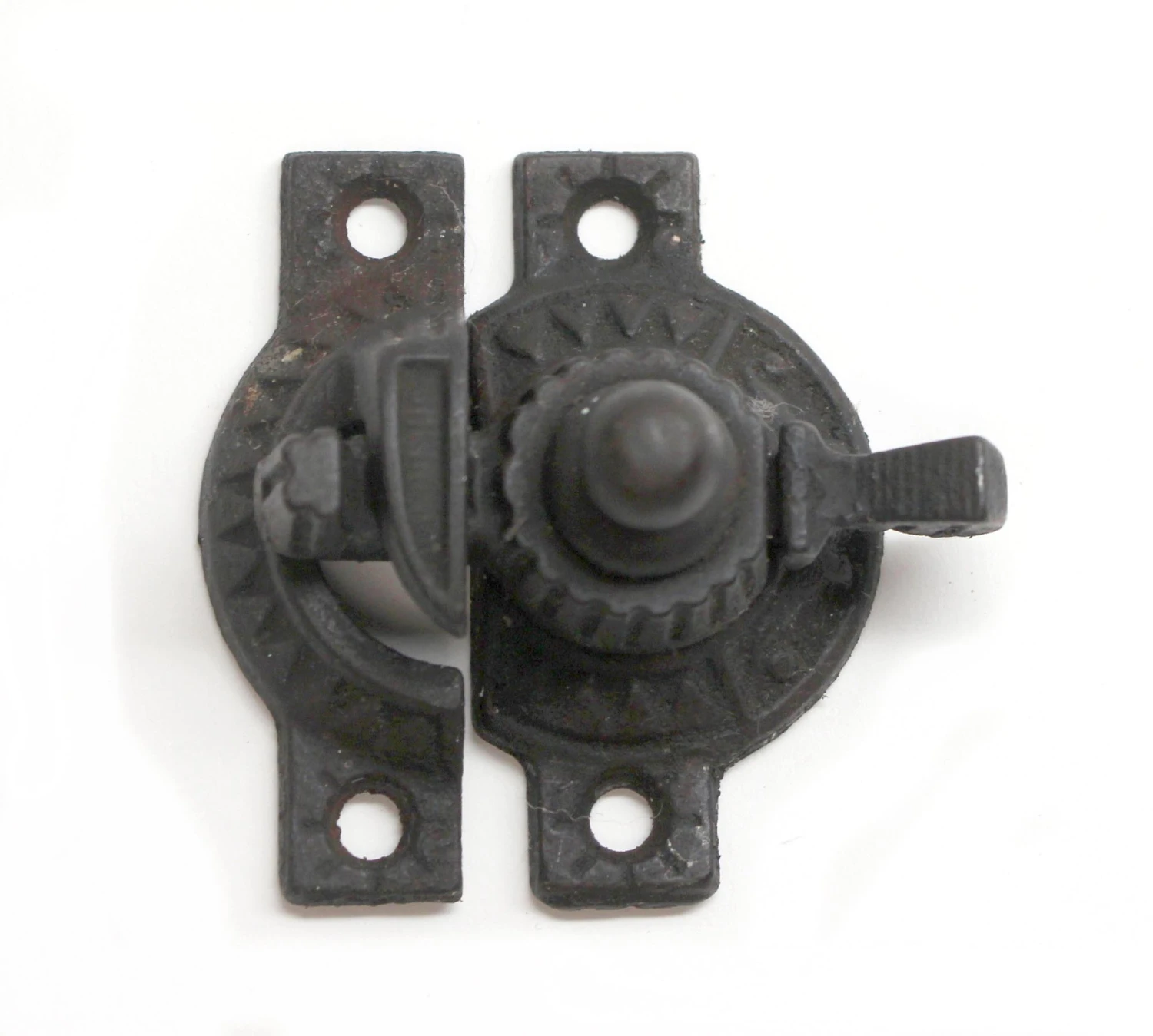 Antique window lock with Aesthetic designs made of black cast iron. Good condition with appropriate wear from age. Priced each.