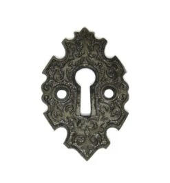 Black ornate cast iron keyhole cover and an Arts & Crafts design. Good condition with appropriate wear from age. Priced each.