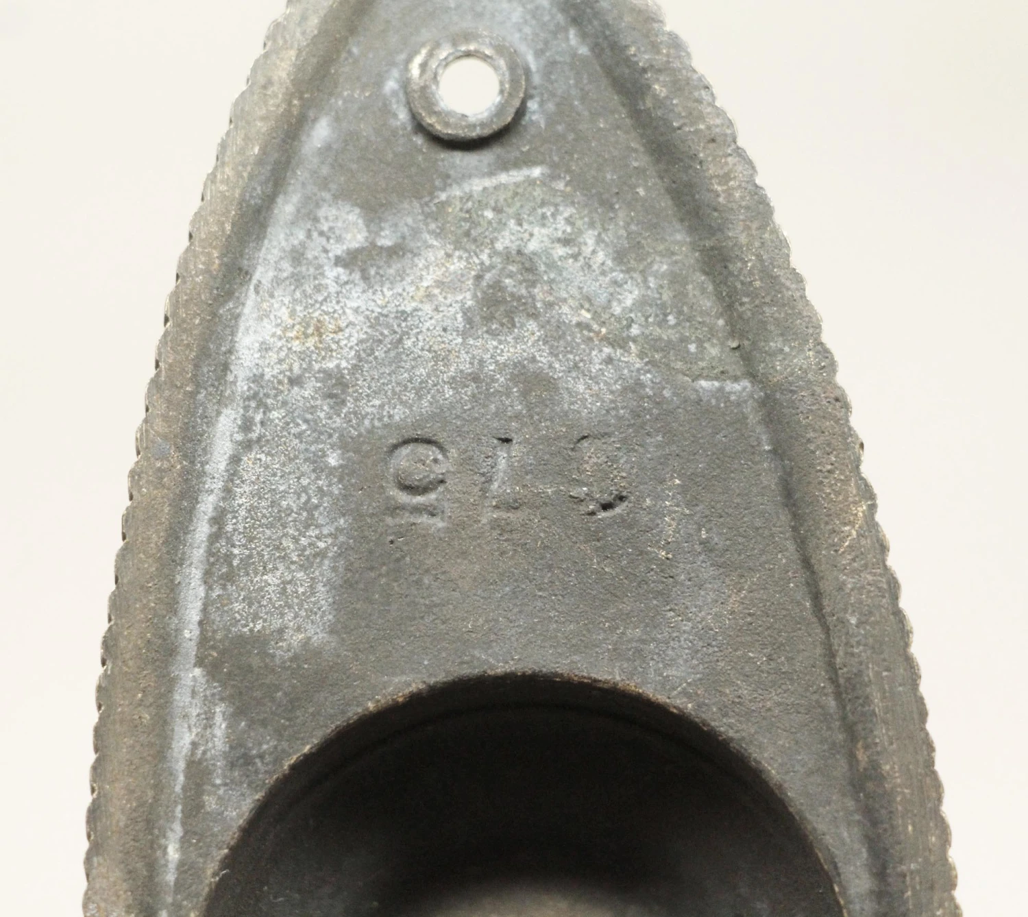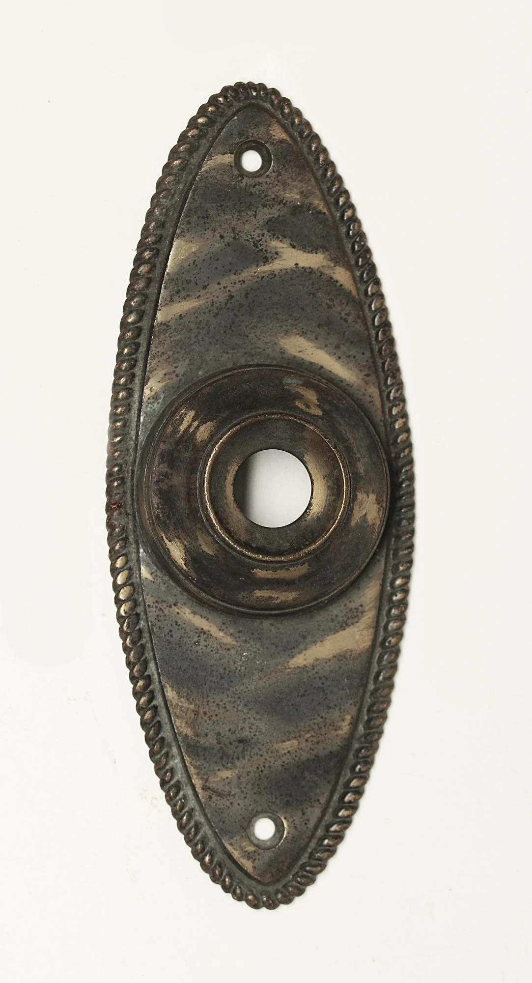 Oval beaded brass door bell cover with a striped patina. Inscribed on back.