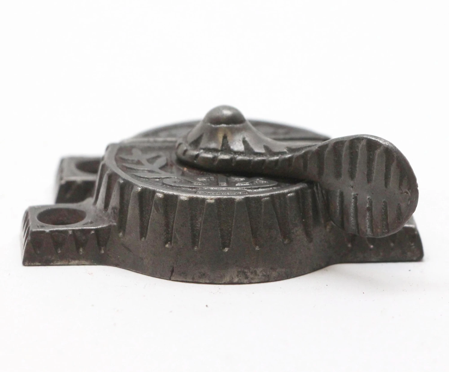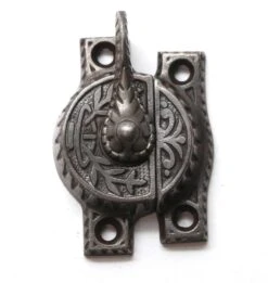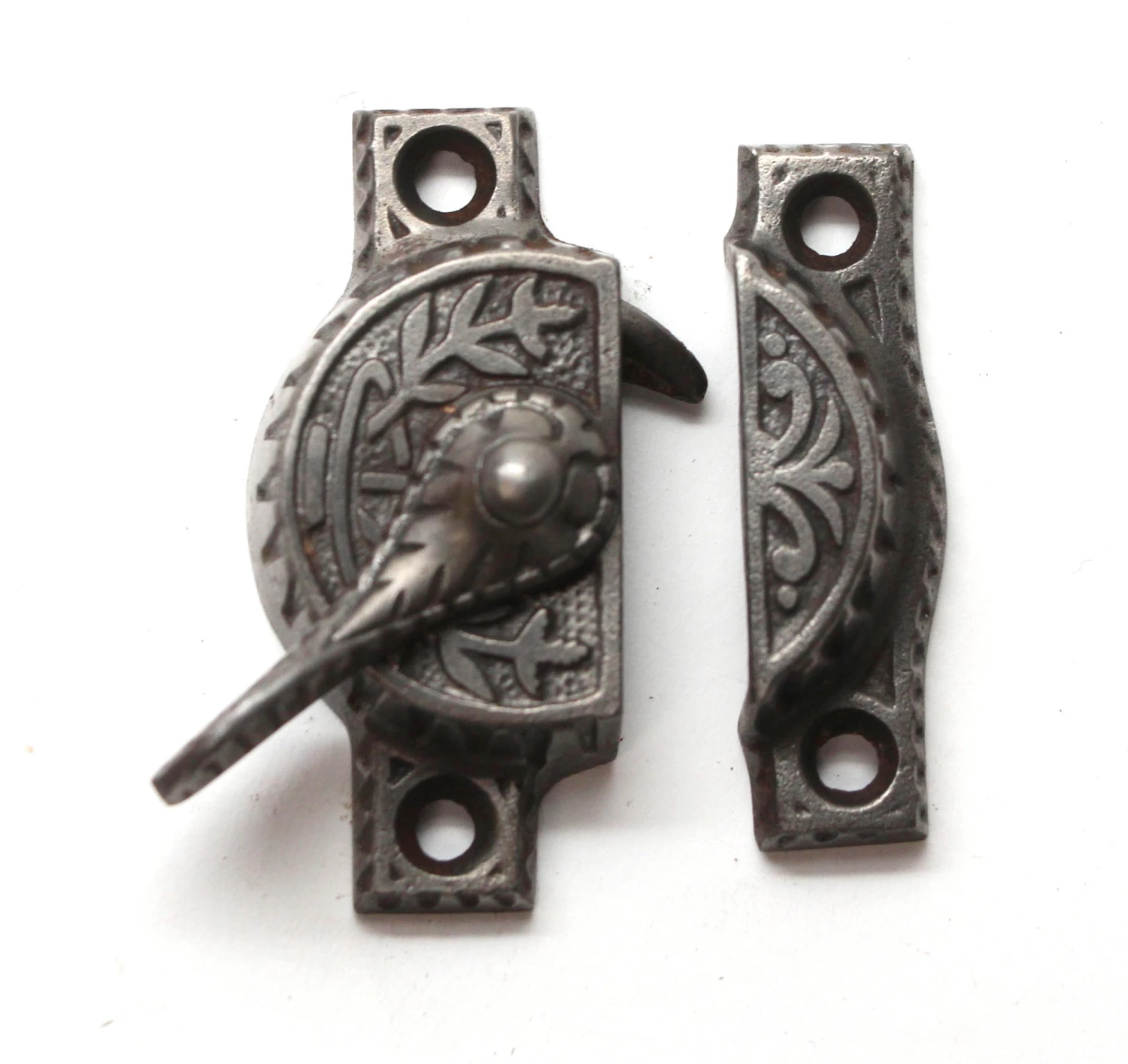 Aesthetic style decorative cast iron window lock with a black finish. Some keepers are in different conditions and with a slight variation in design. Good condition with appropriate wear from age. Priced each.