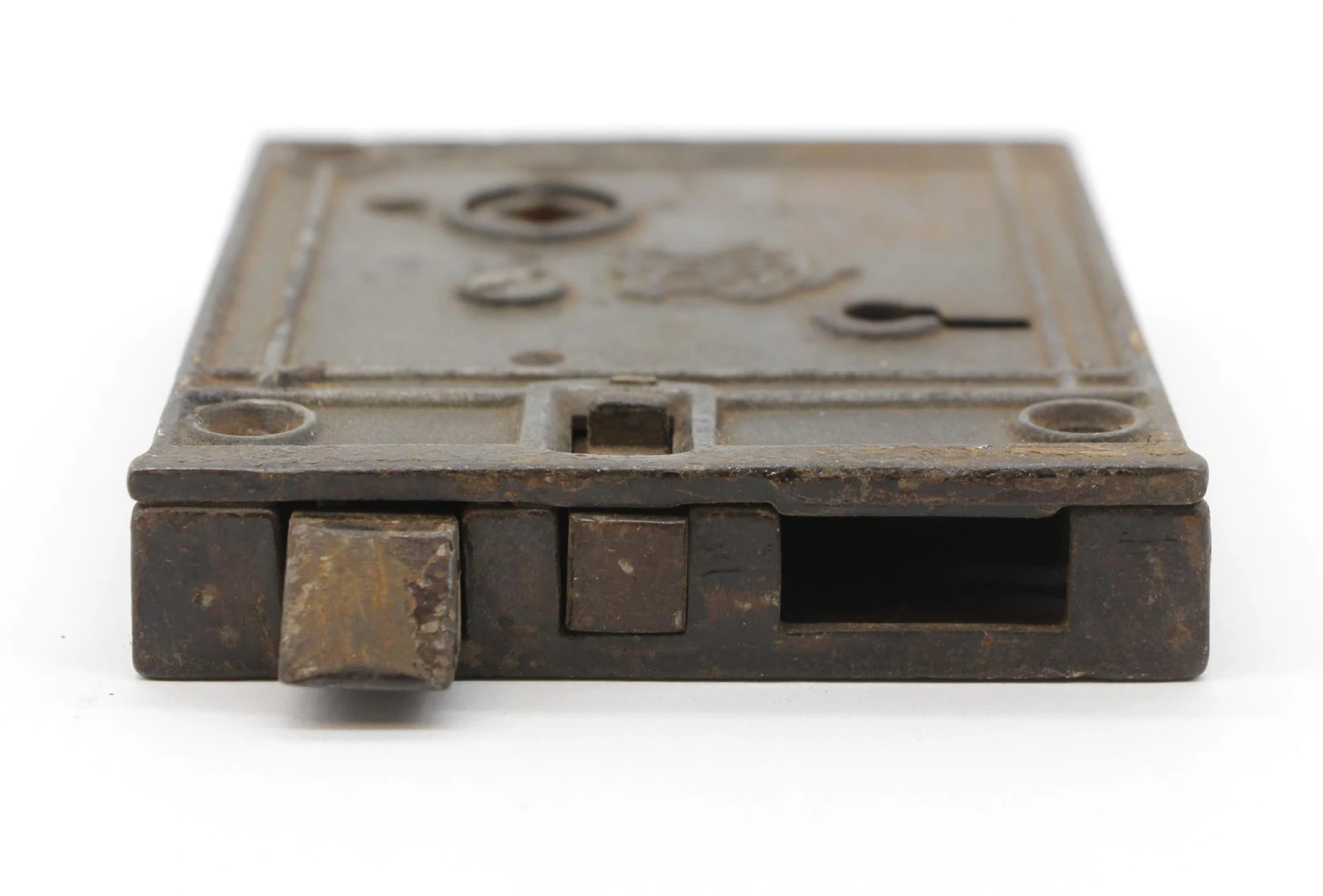 Black antique cast iron rim lock with catch. This is in great condition. One available.