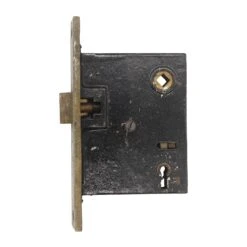 Antique mortise latch and lock box with original black paint and solid brass faceplate. This is used with door knobs, latches, and doors and works with a skeleton key to lock your door. No key is available. These are in good working condition. All have wear. Priced each.