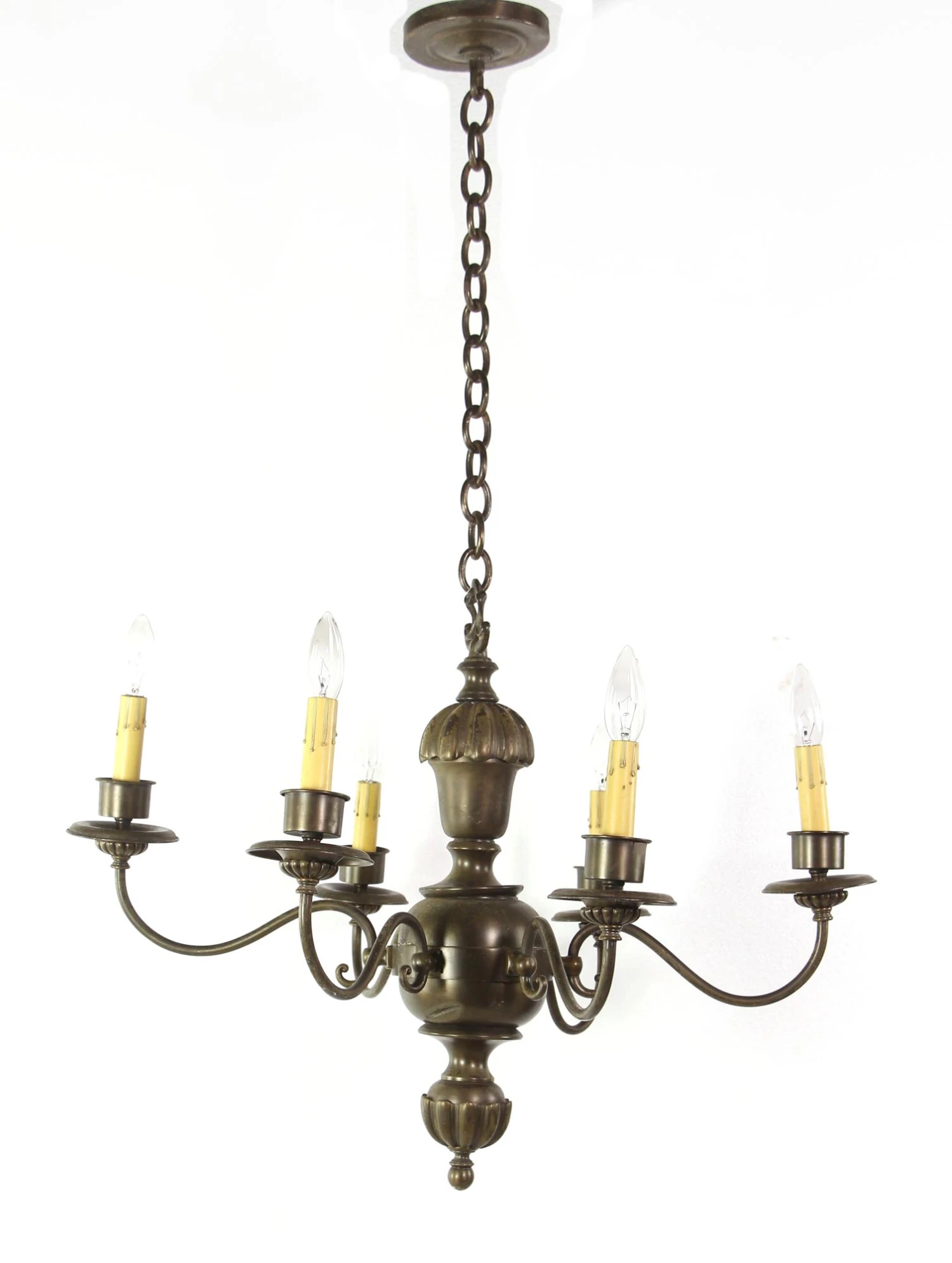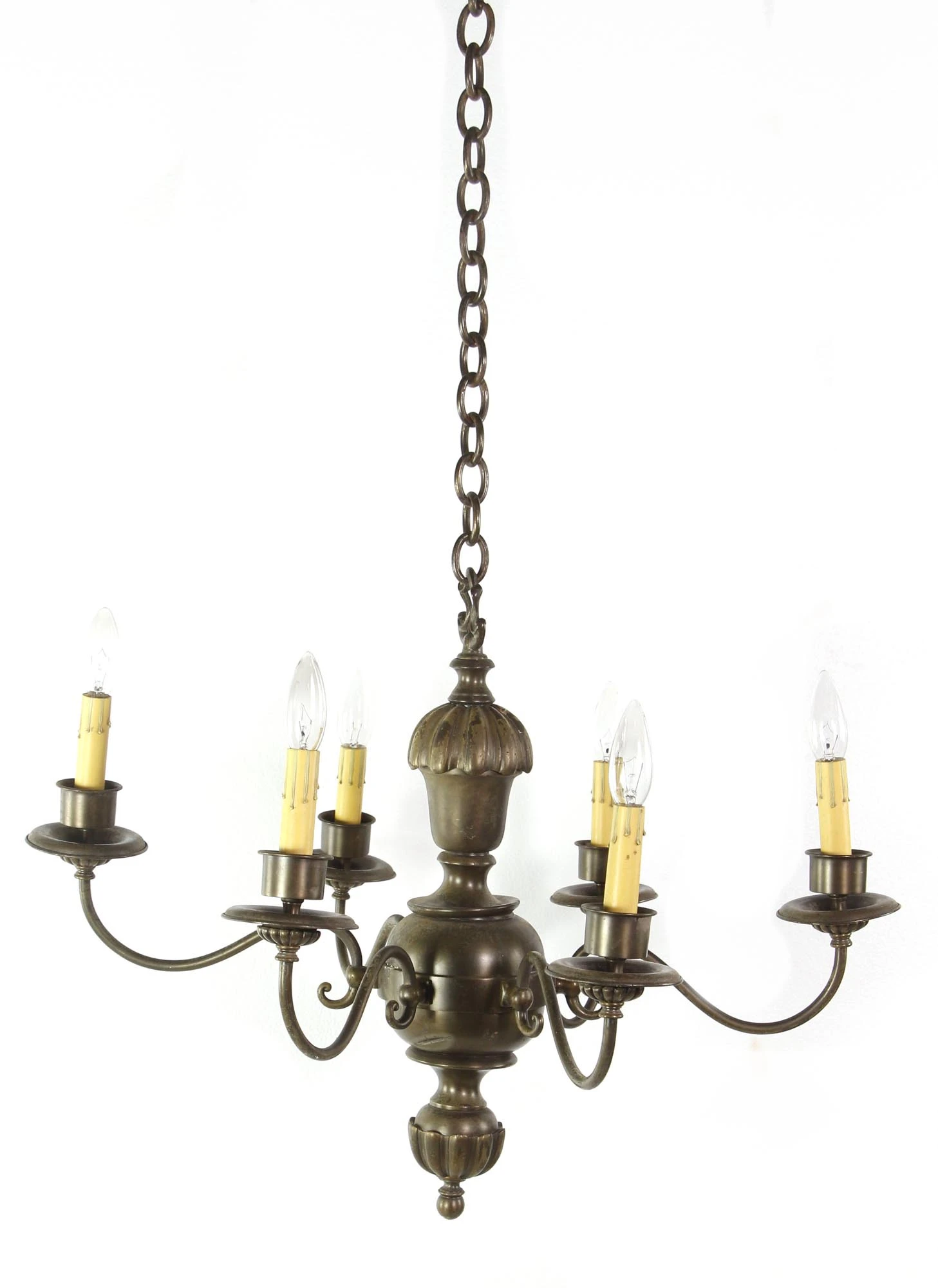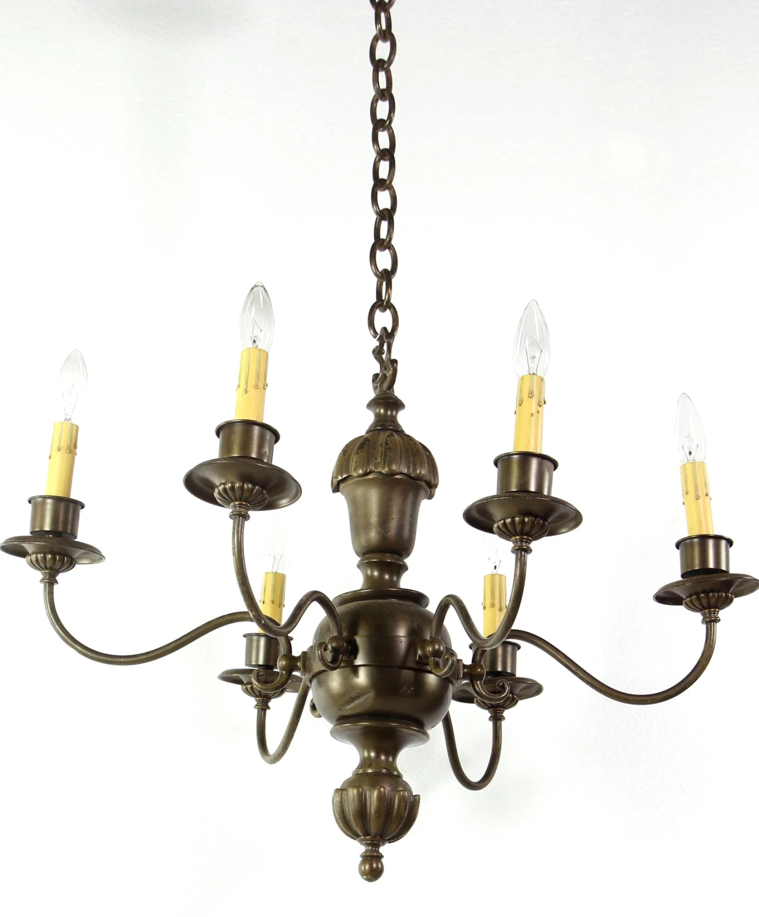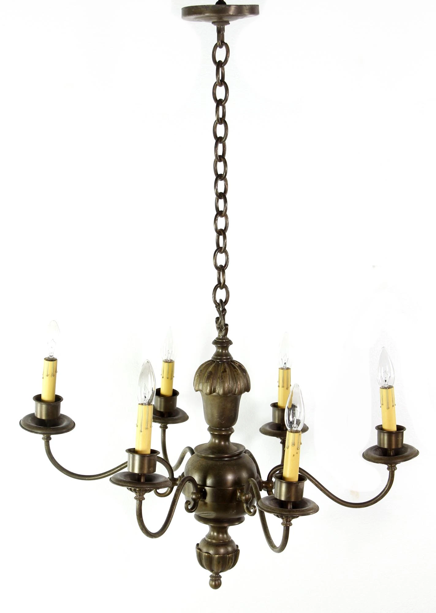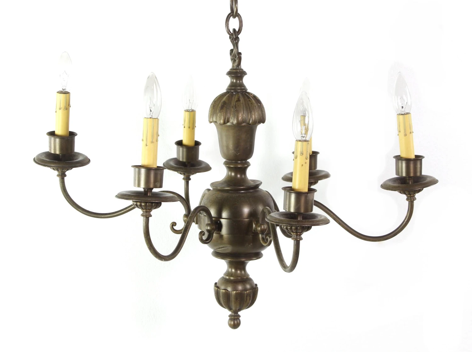 Six candlestick arm Georgian style chandelier with a dark brass patina. The chandelier is graced with fluted cast brass detail. The price includes restoration.