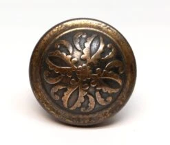 This Vernacular style four fold door knob was made by Reading in the 1900 catalog. It is part of the H-26900 Montrose group. This is made of brass plated steel in an antique finish. The brass plating is worn. One available.
