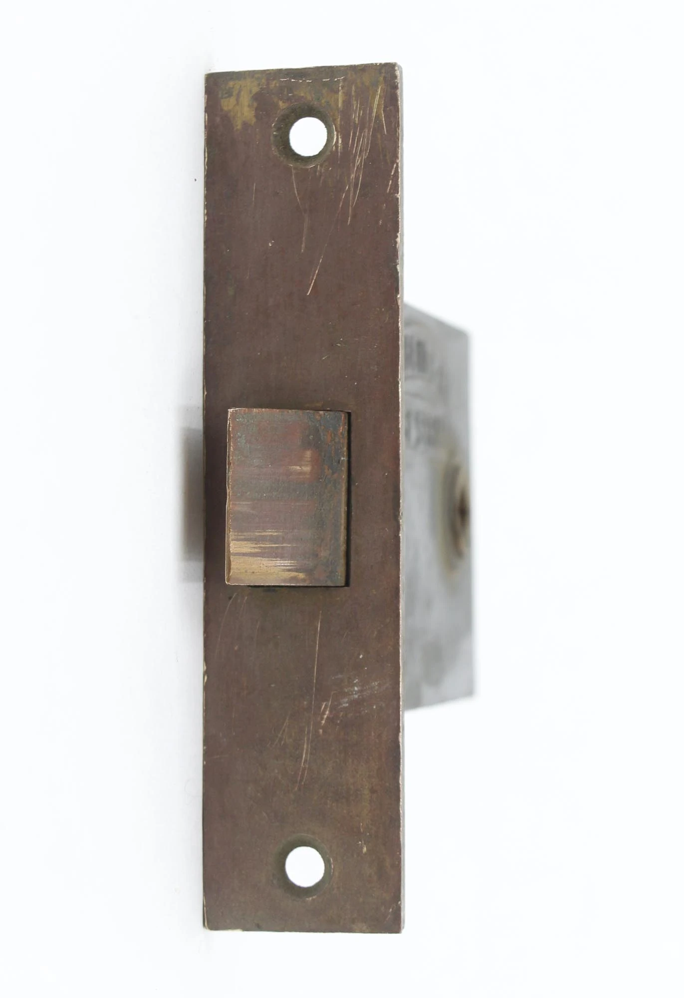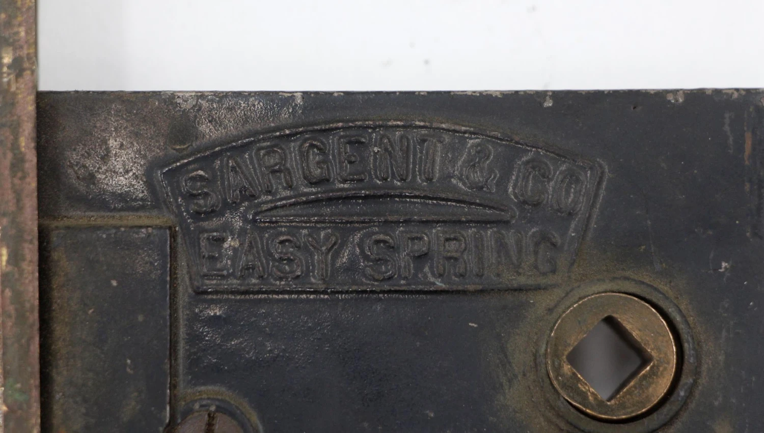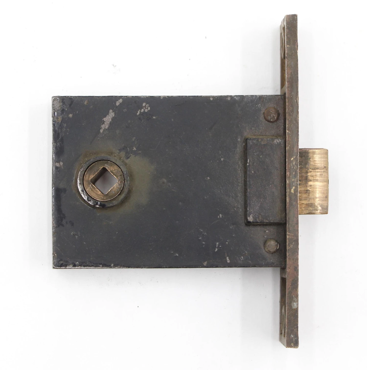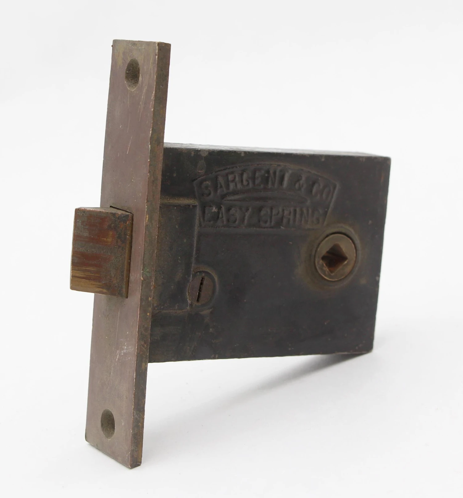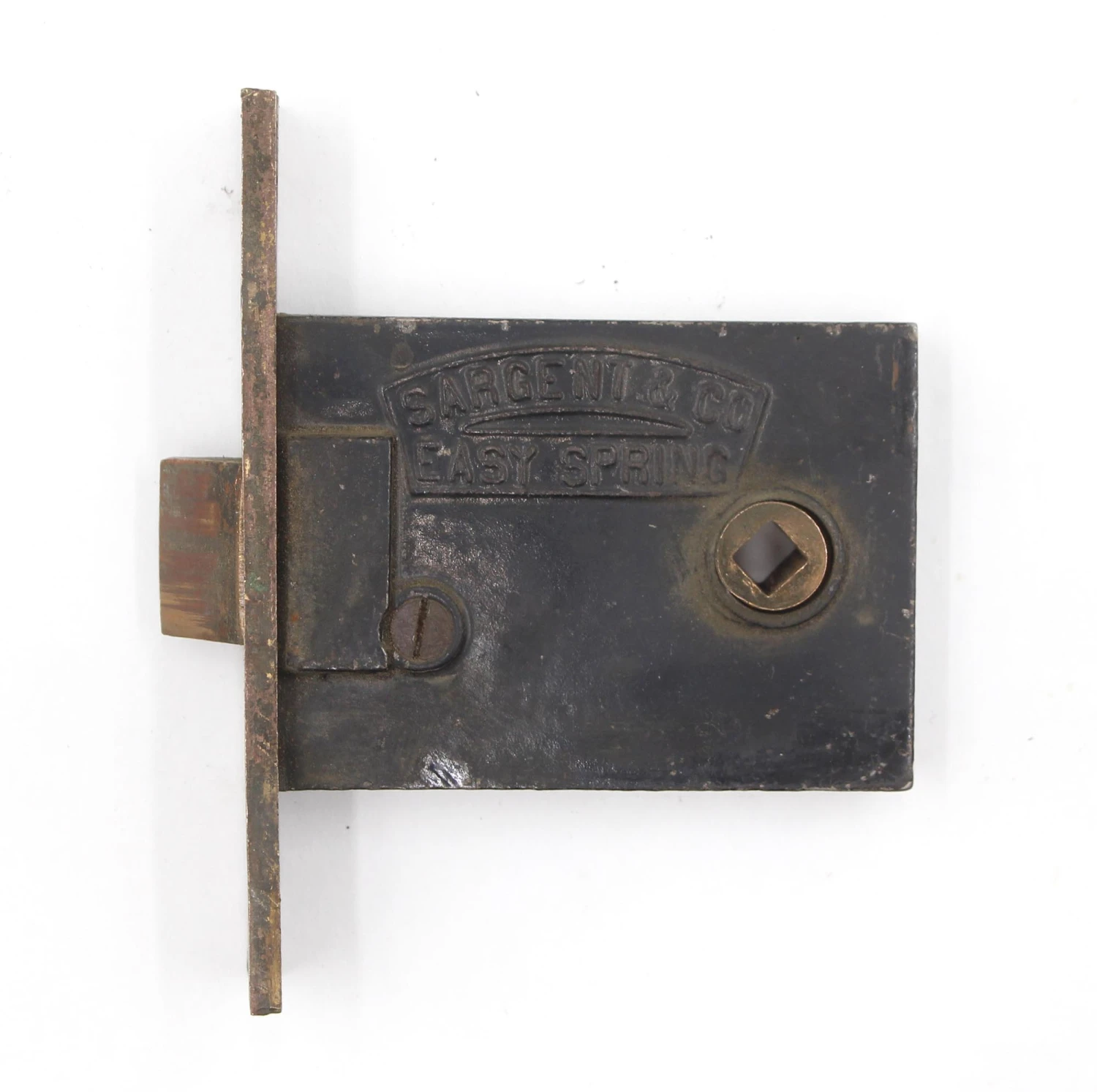 Antique passage mortise with a brass plated faceplate. The strike plate is made of brass. It is made by Sargent and inscribed “Easy Spring”. The original mounting screws are not available. Good condition with appropriate wear from age. Priced each.