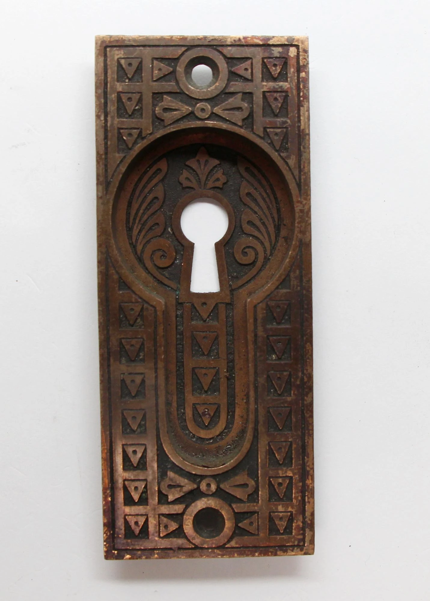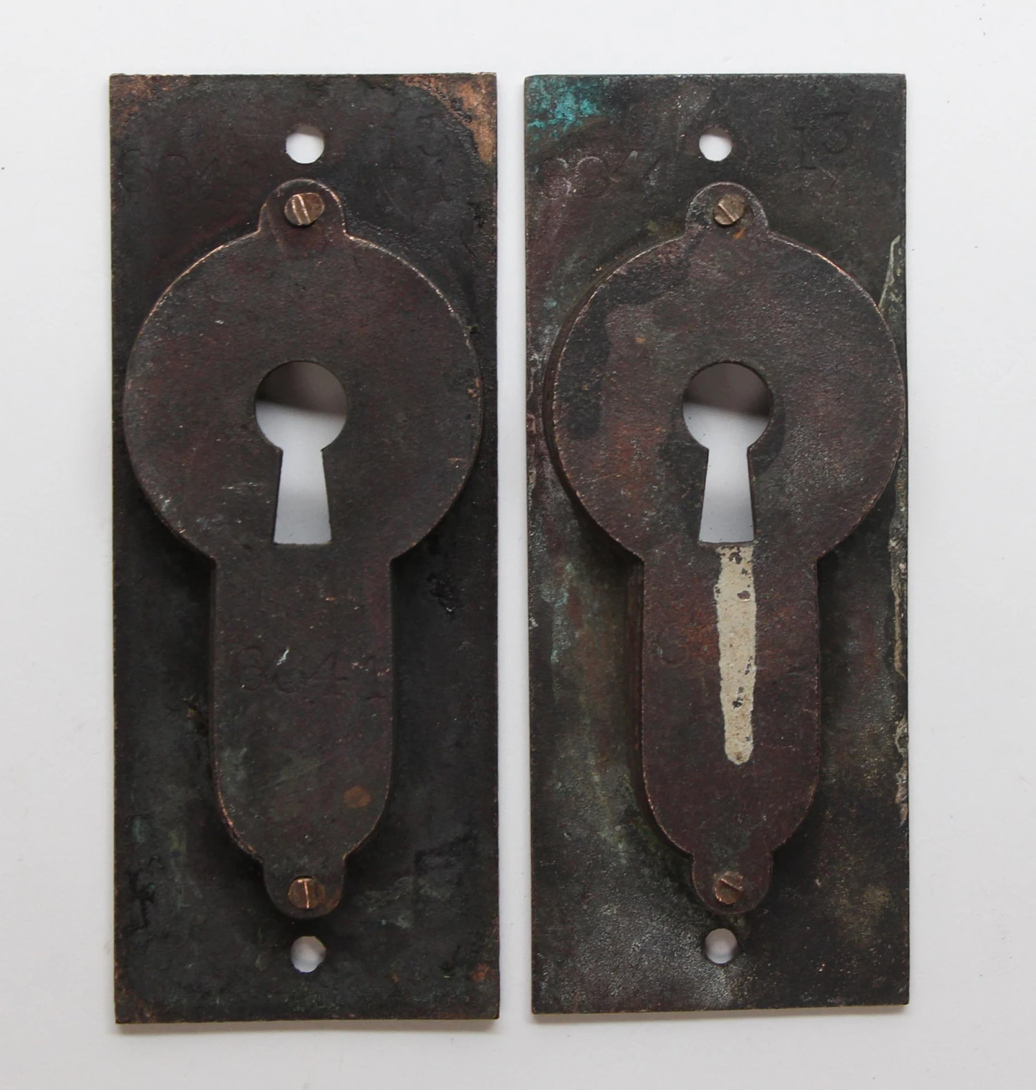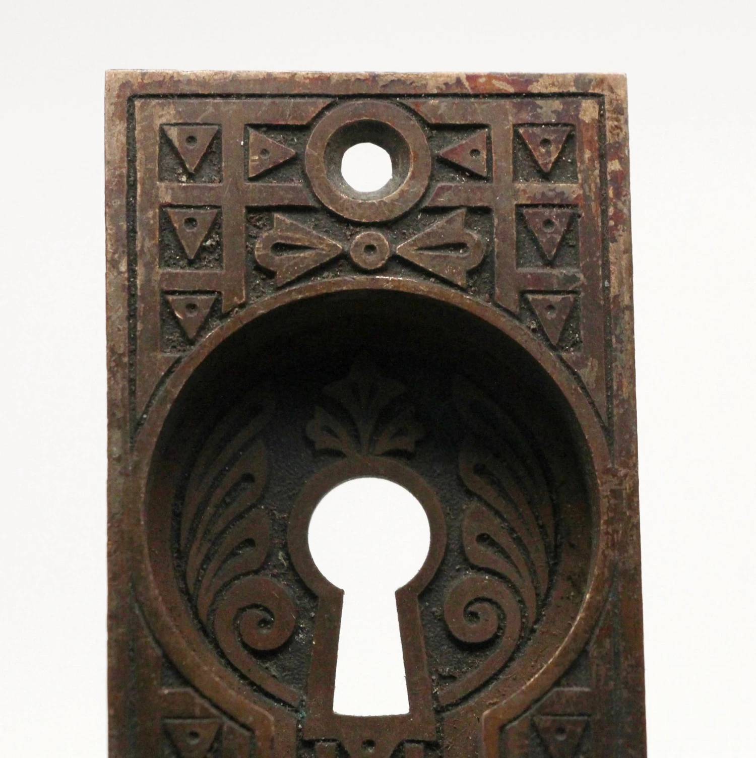 An antique pair of pocket door plates in an Aesthetic style, fashioned from bronze. These recessed plates offer a glimpse into the past, showcasing both functionality and decorative appeal for pocket doors. Priced as a pair.