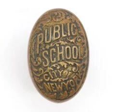 This emblematic bronze City of New York Public School oval doorknob was made by Sargent and Corbin in the 1900 catalog. It is part of the P-60001 Public School group. Priced each.
