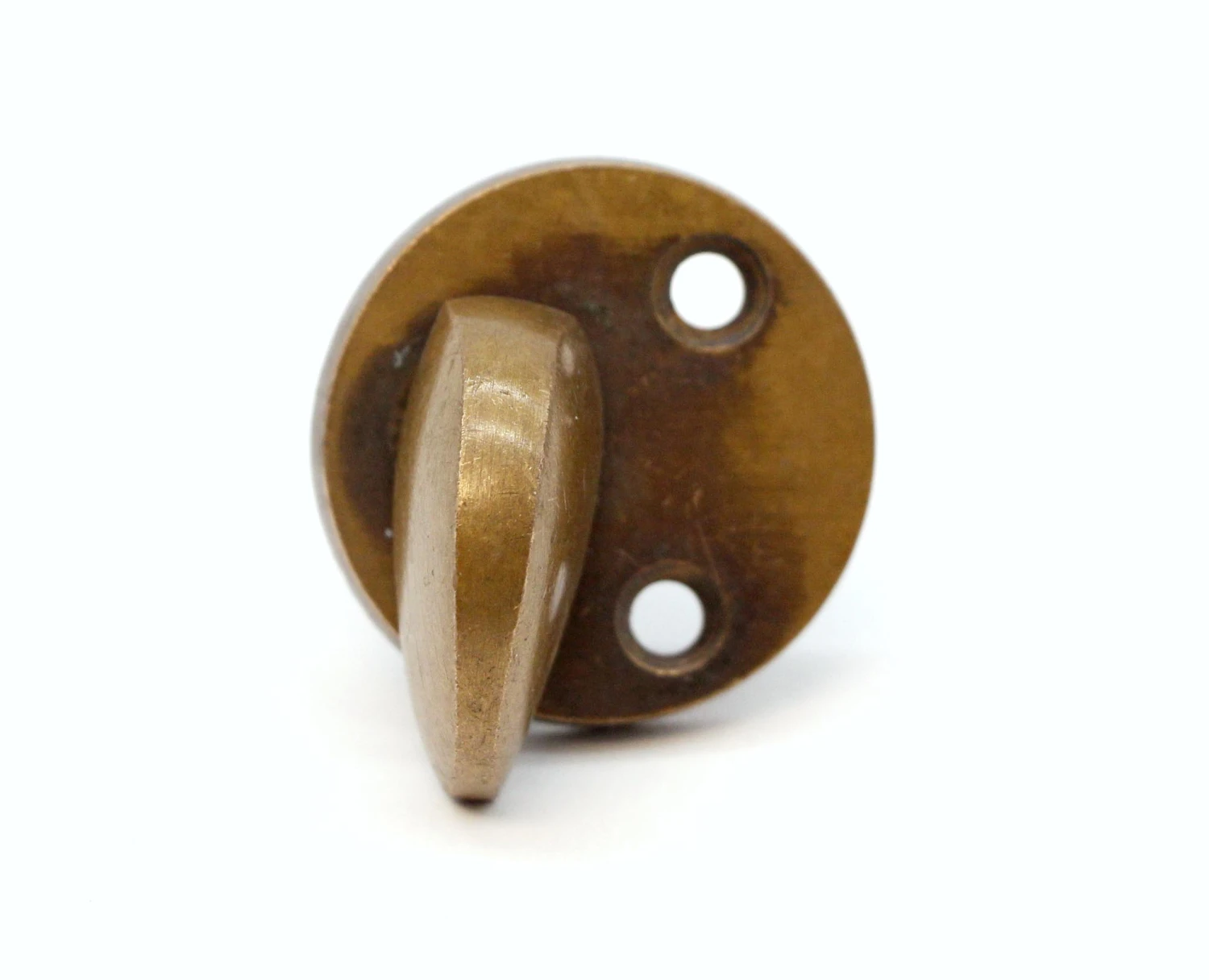 An antique bronze round thumb lock latch with a matching round backplate and an antique patina. The round shape and patina add character and authenticity to the lock, making it suitable for restoration projects and historical interiors. Priced each.