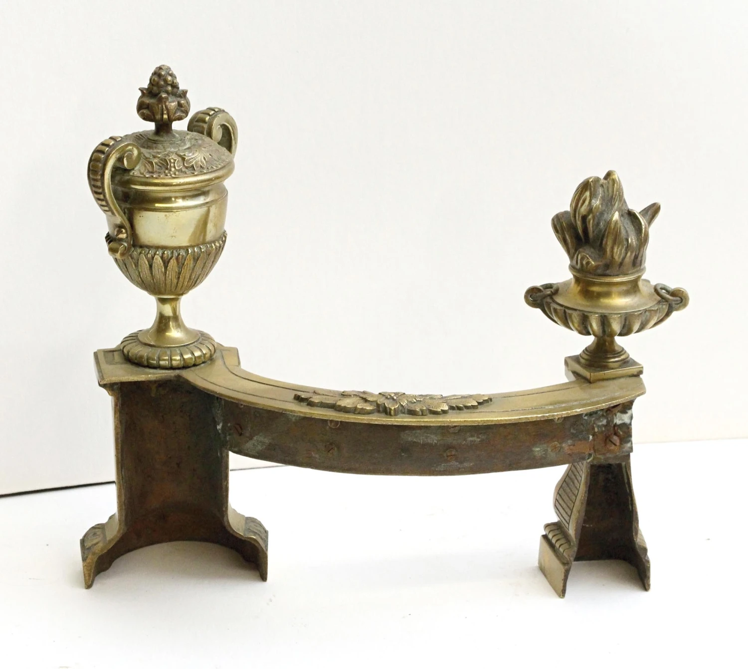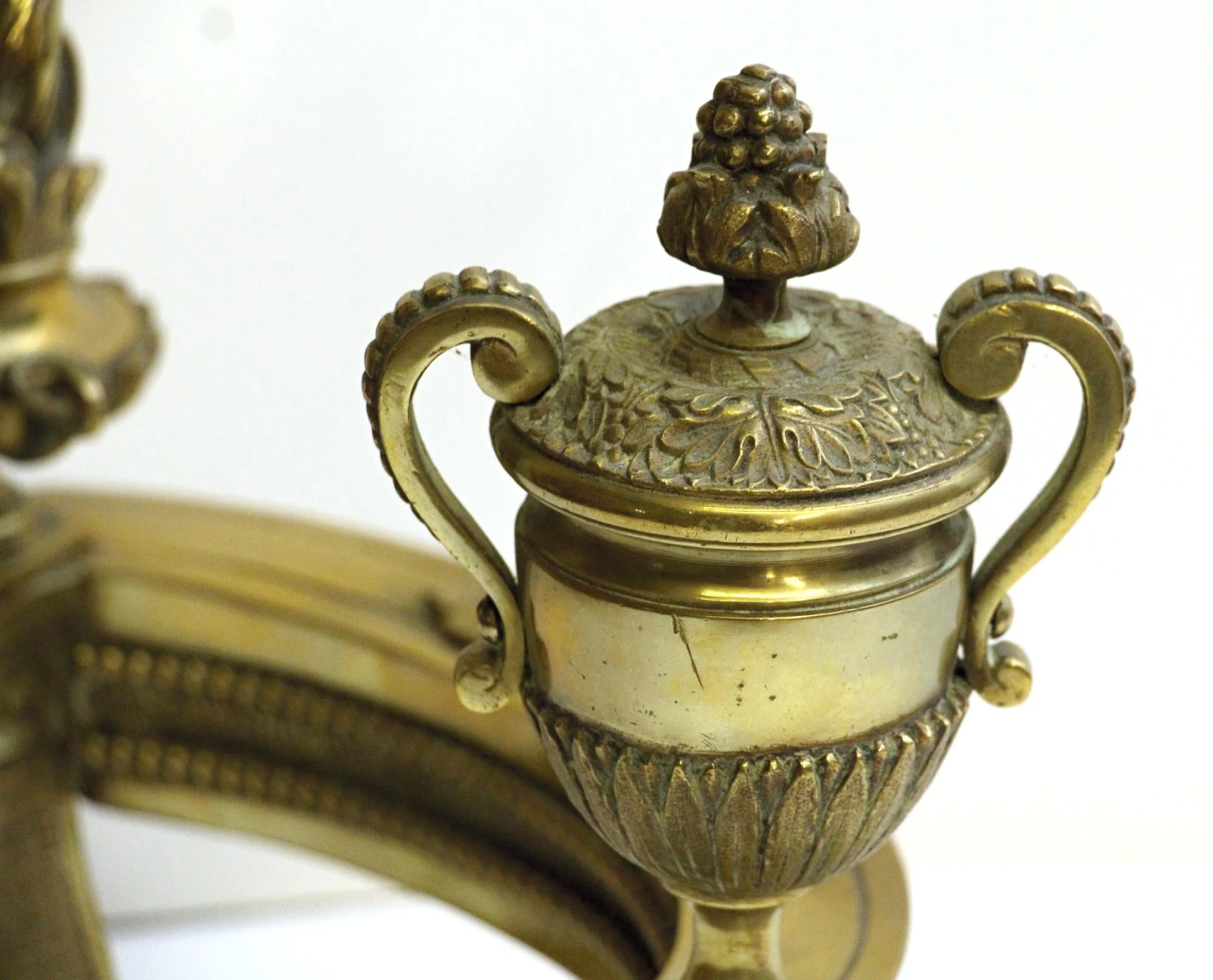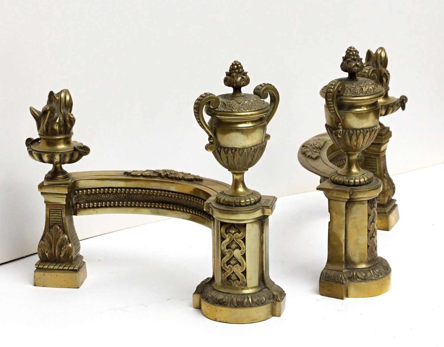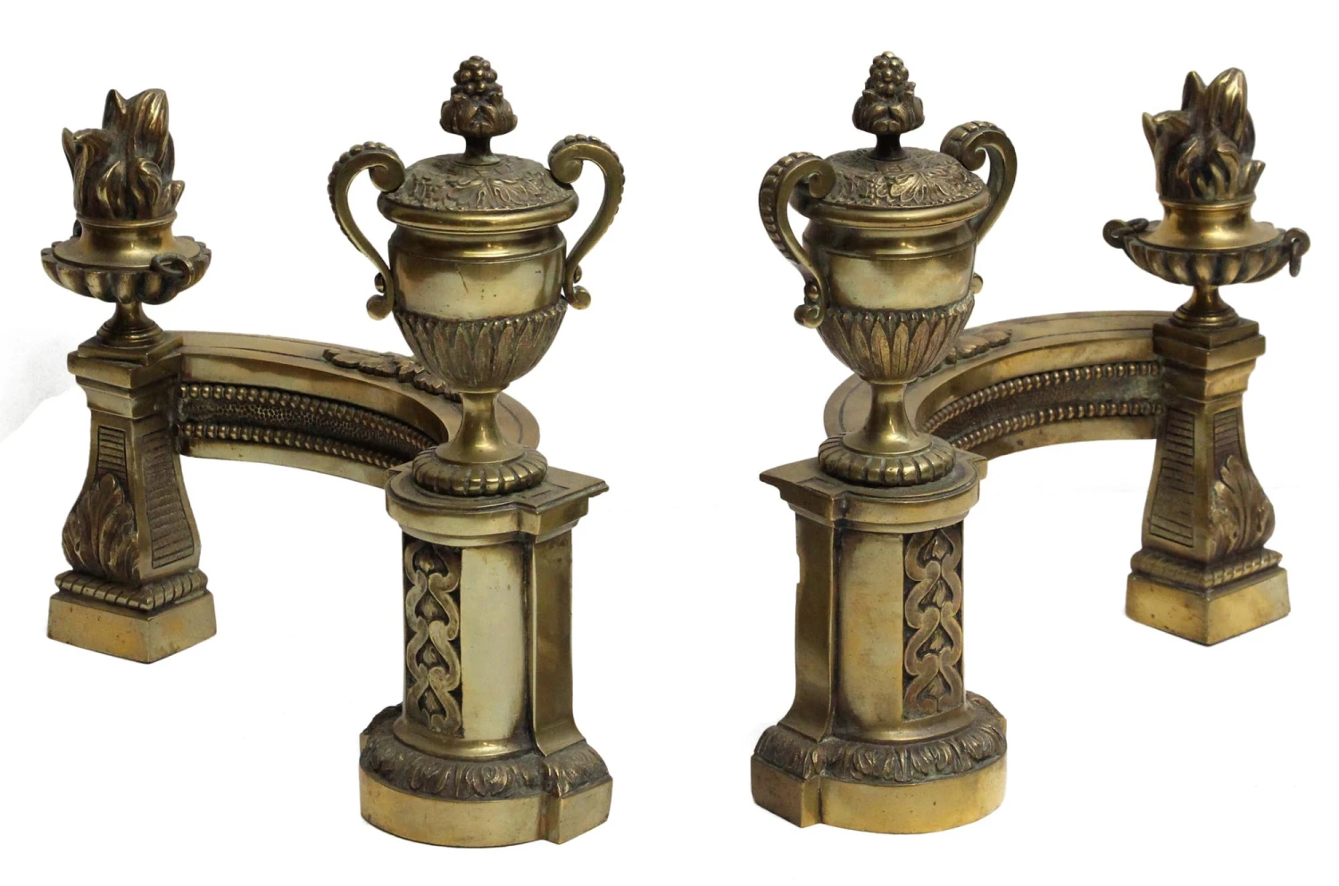 French chenets featuring both capped urns and flame top urns in cast bronze. Priced as a pair.