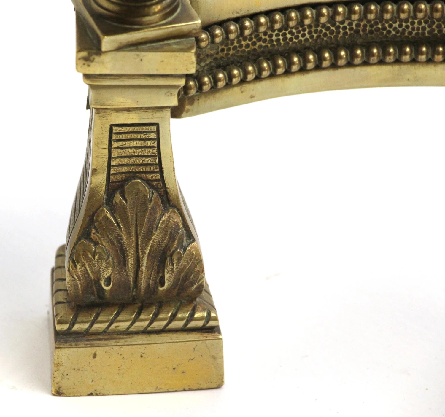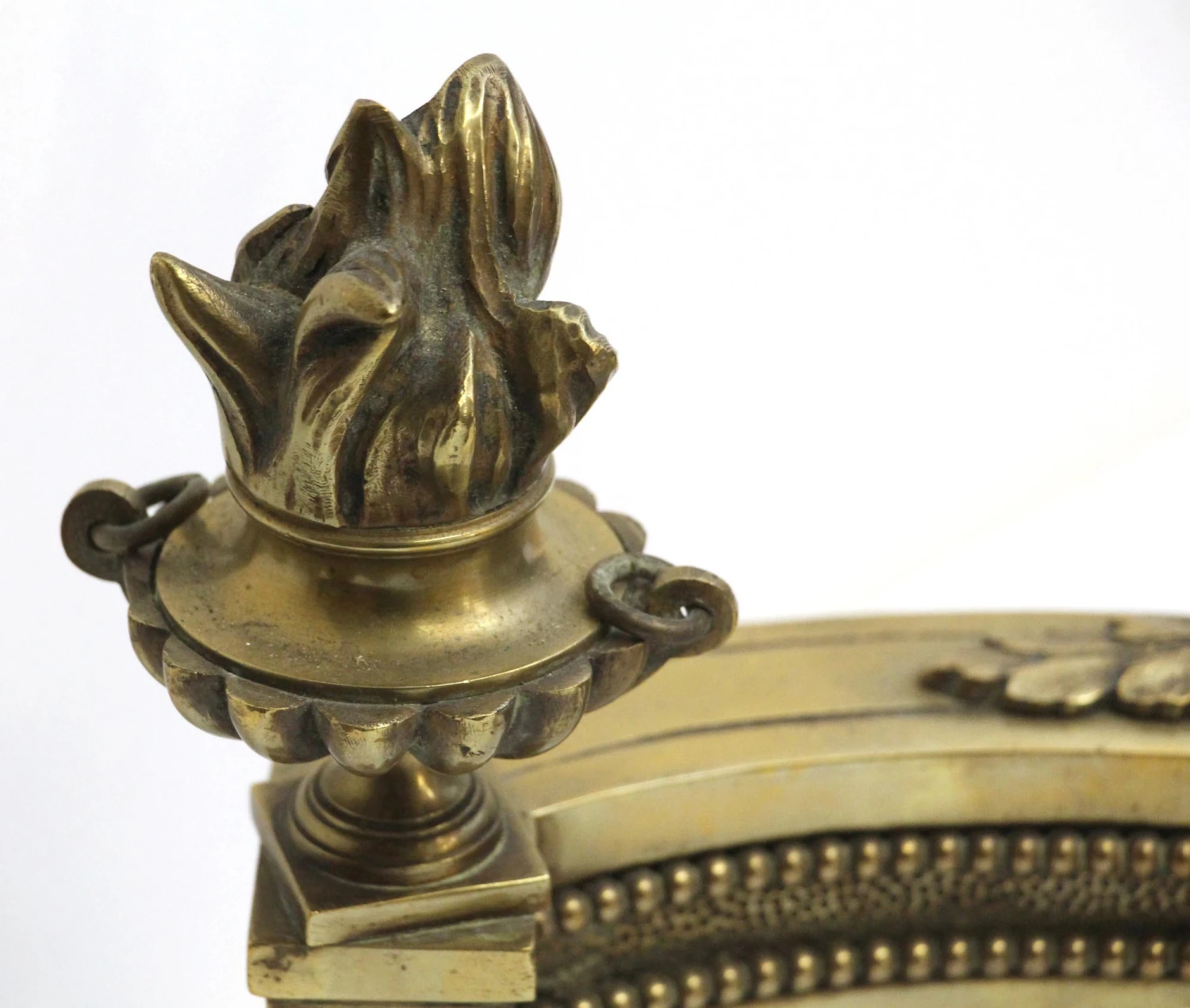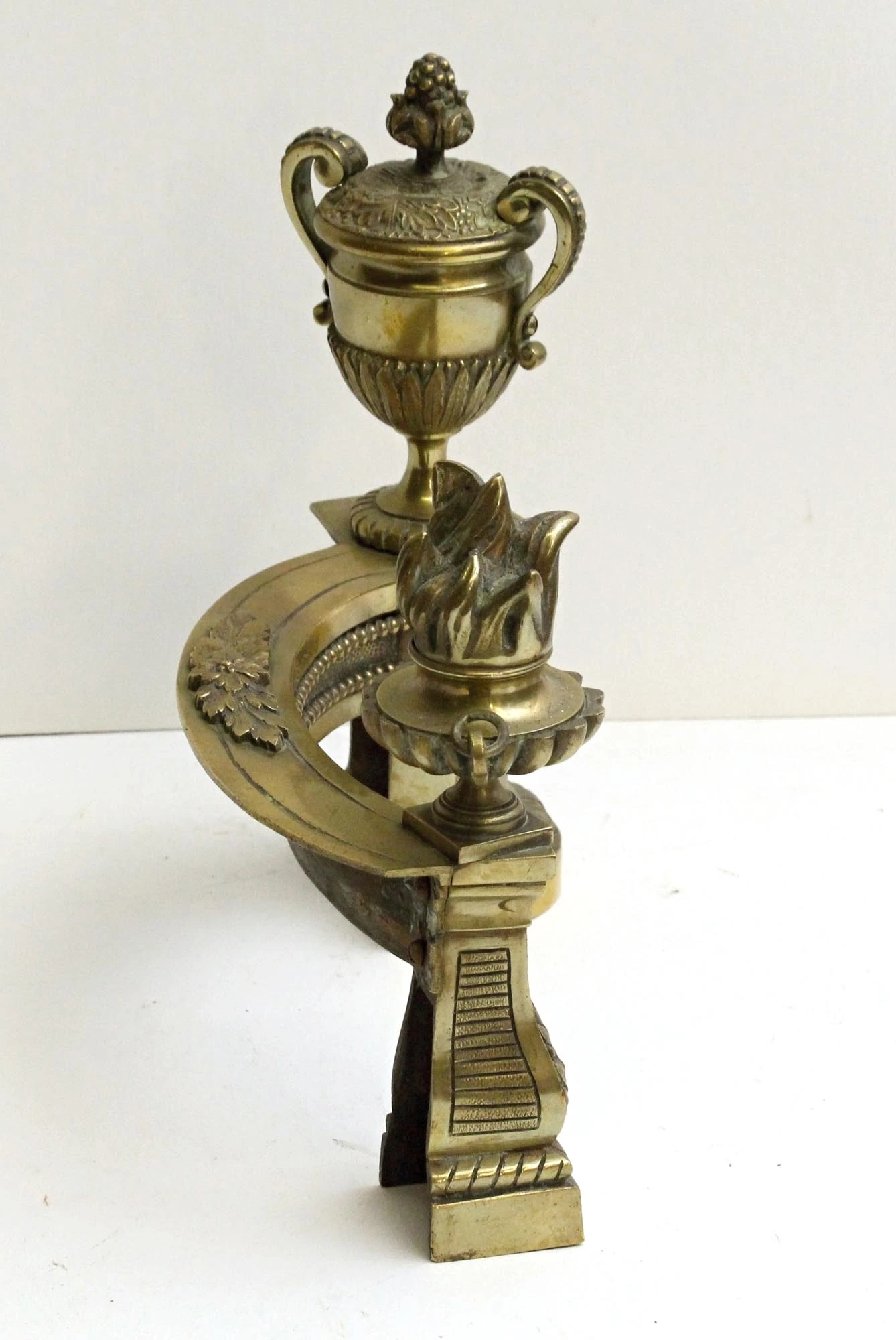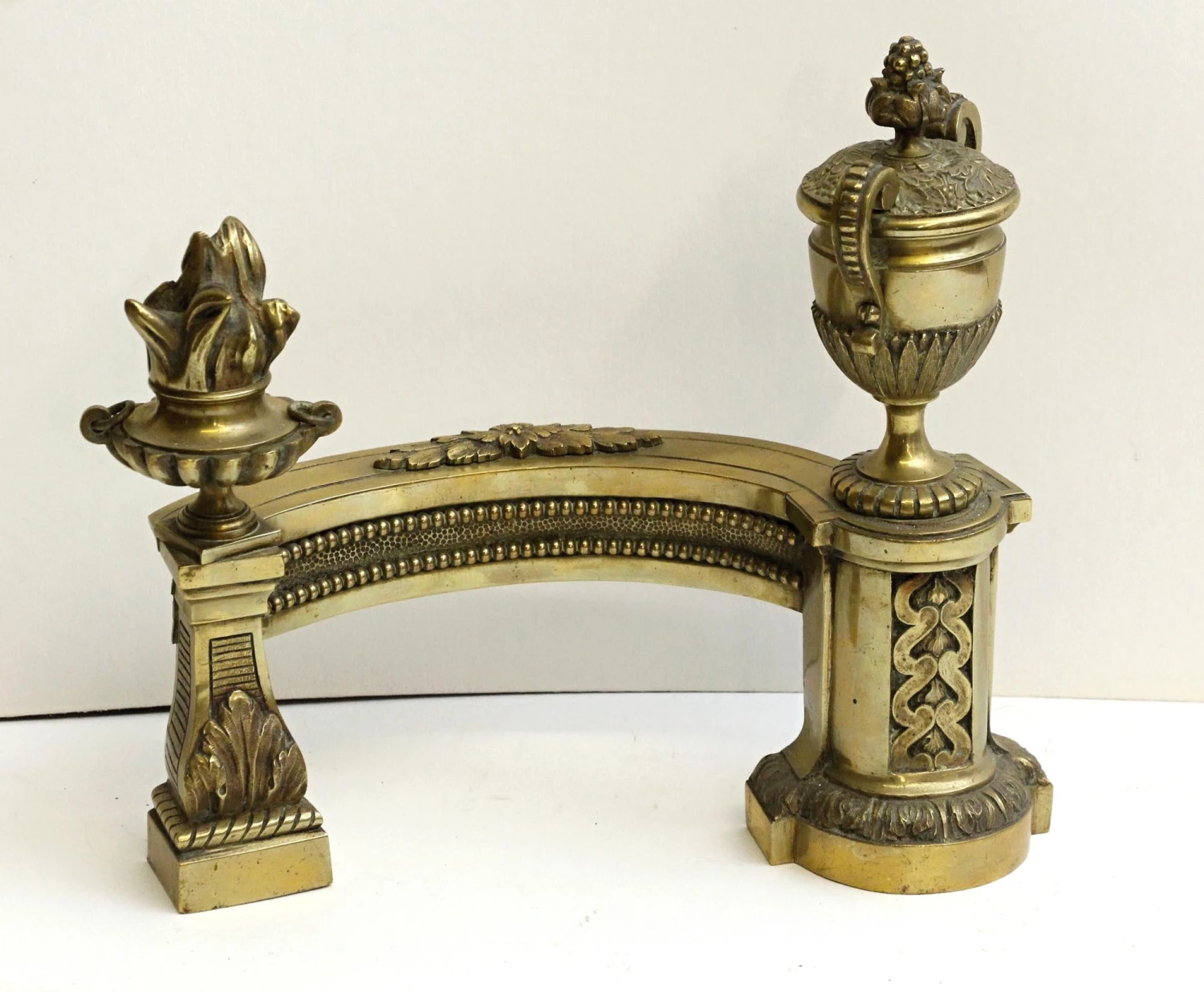 French chenets featuring both capped urns and flame top urns in cast bronze. Priced as a pair.