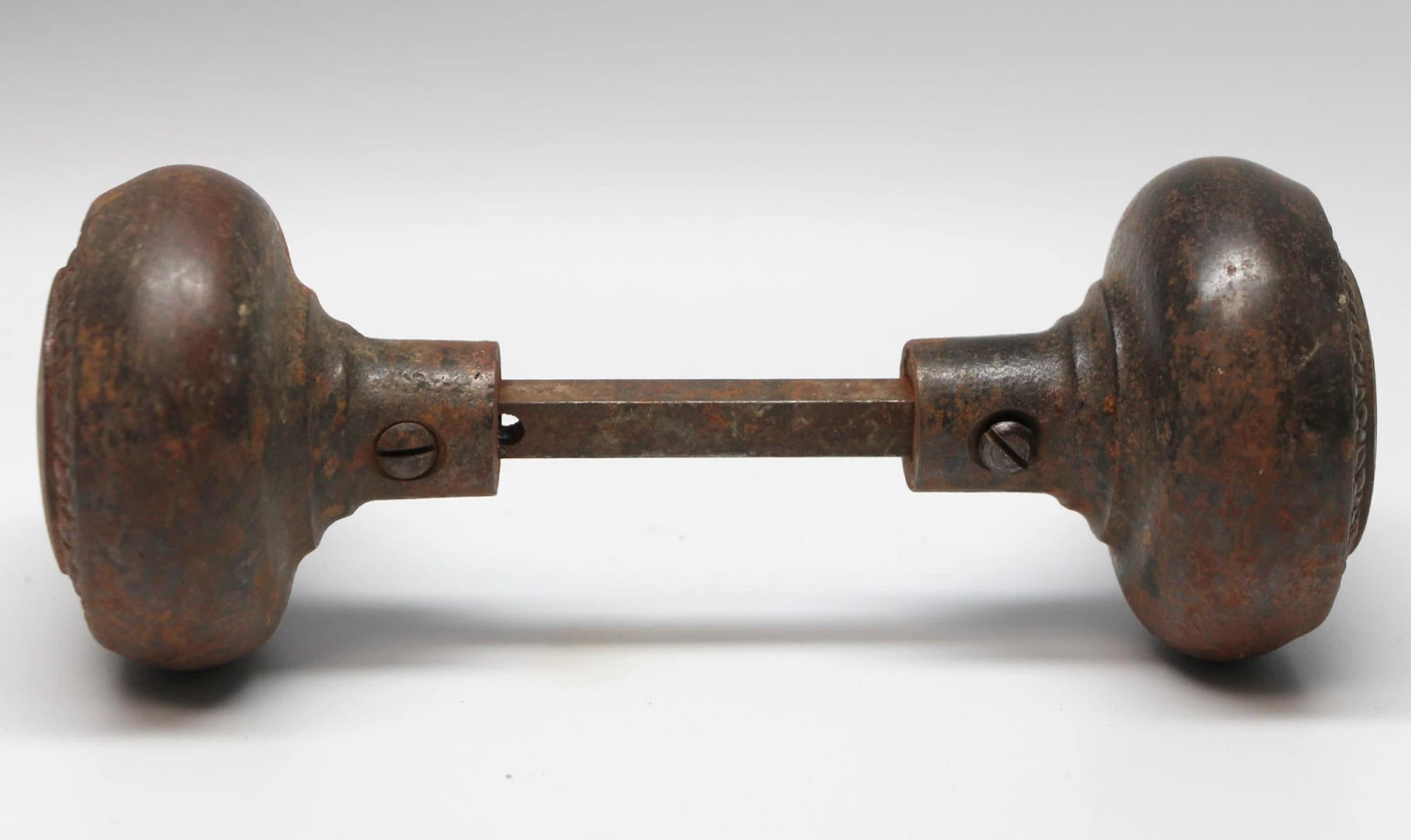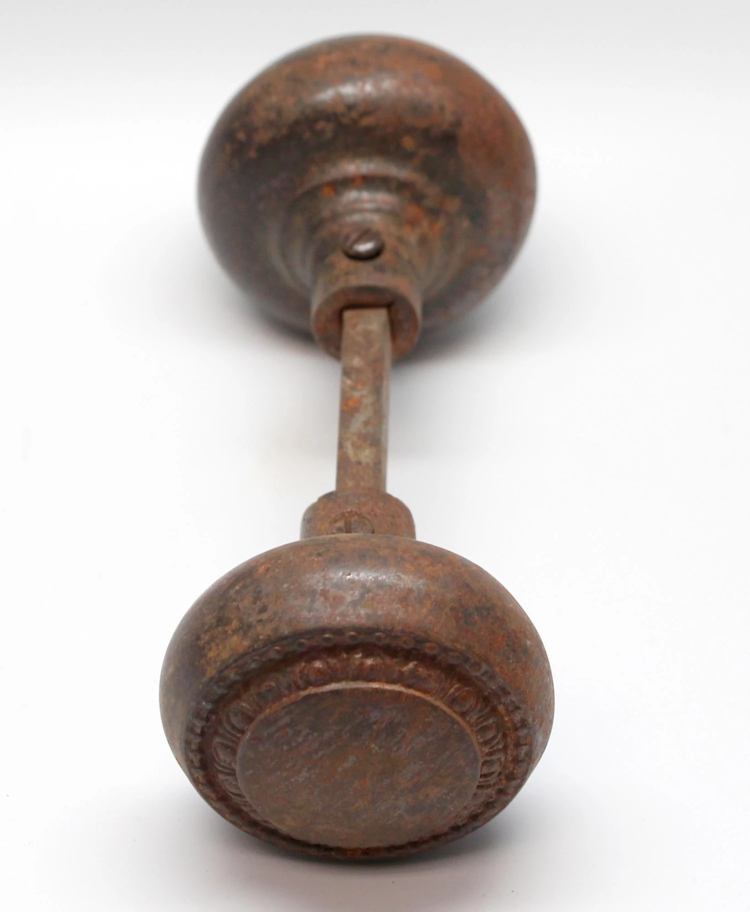 This concentric cast iron door knob set features beaded and egg & dart details. Priced as a pair of knobs with a spindle. The manufacturer is unknown.