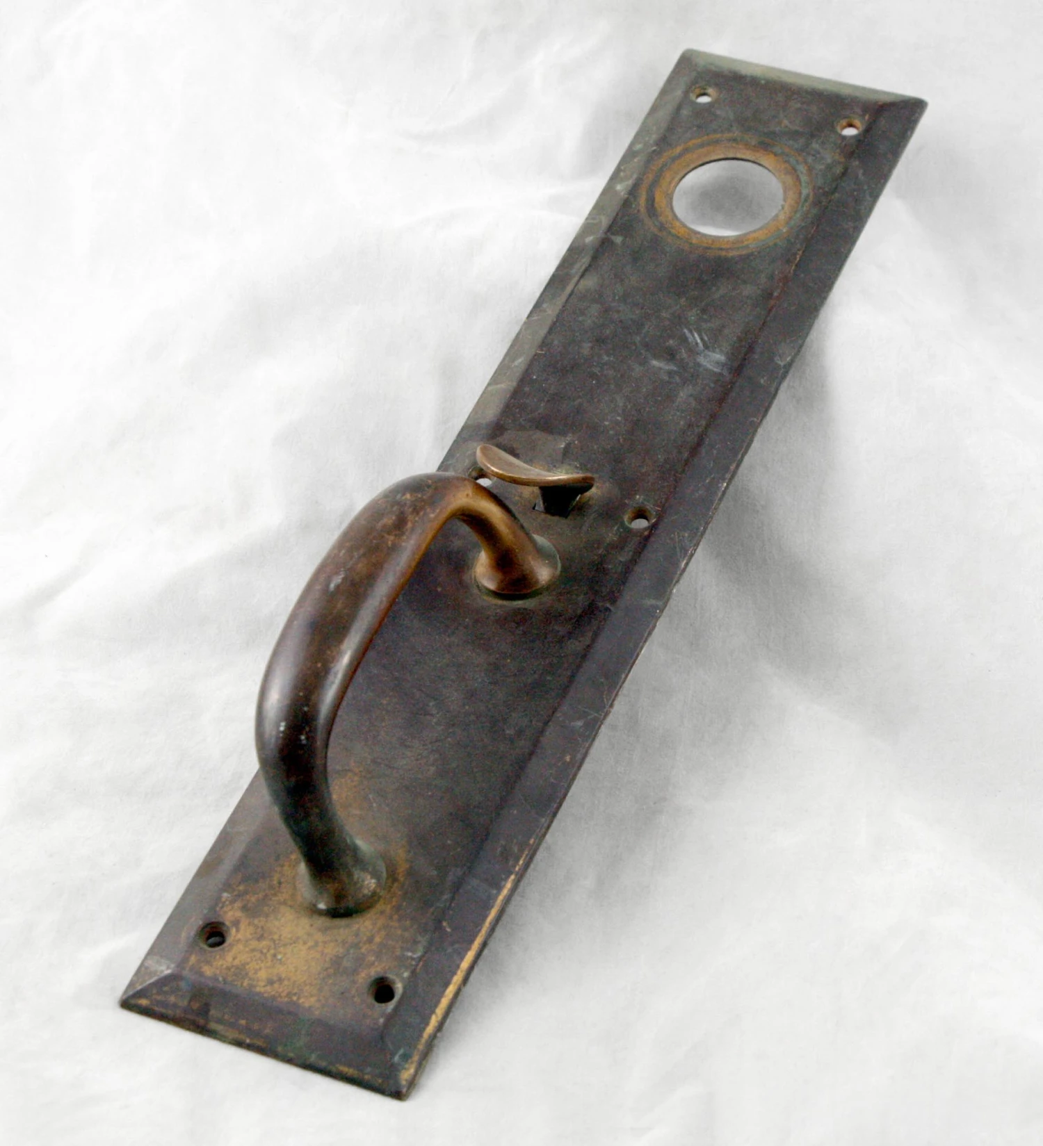 Classic raised beveled edge brass door pull with a thumb latch feature and lock insert. One available.