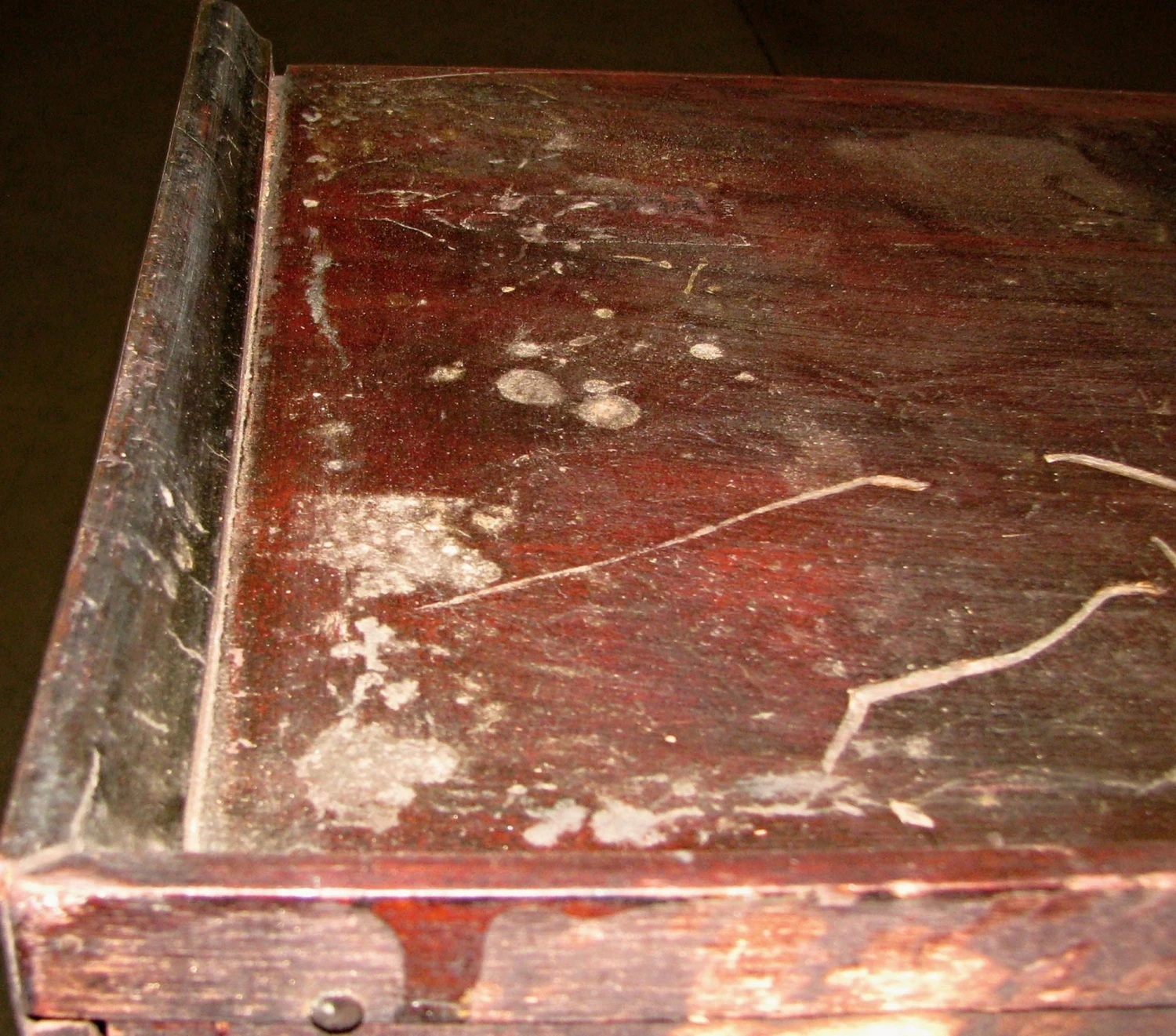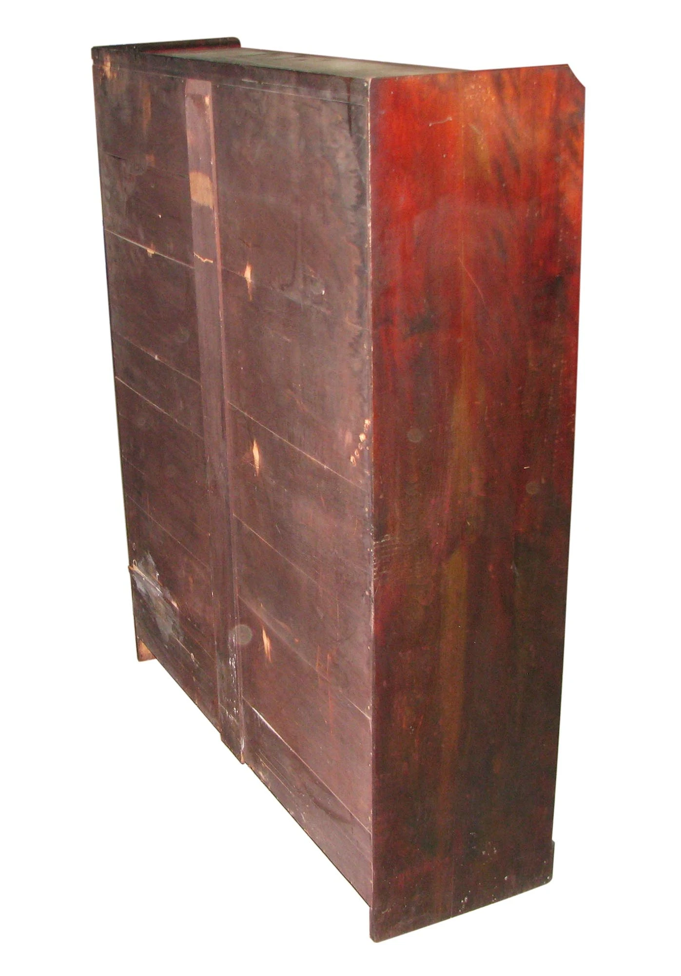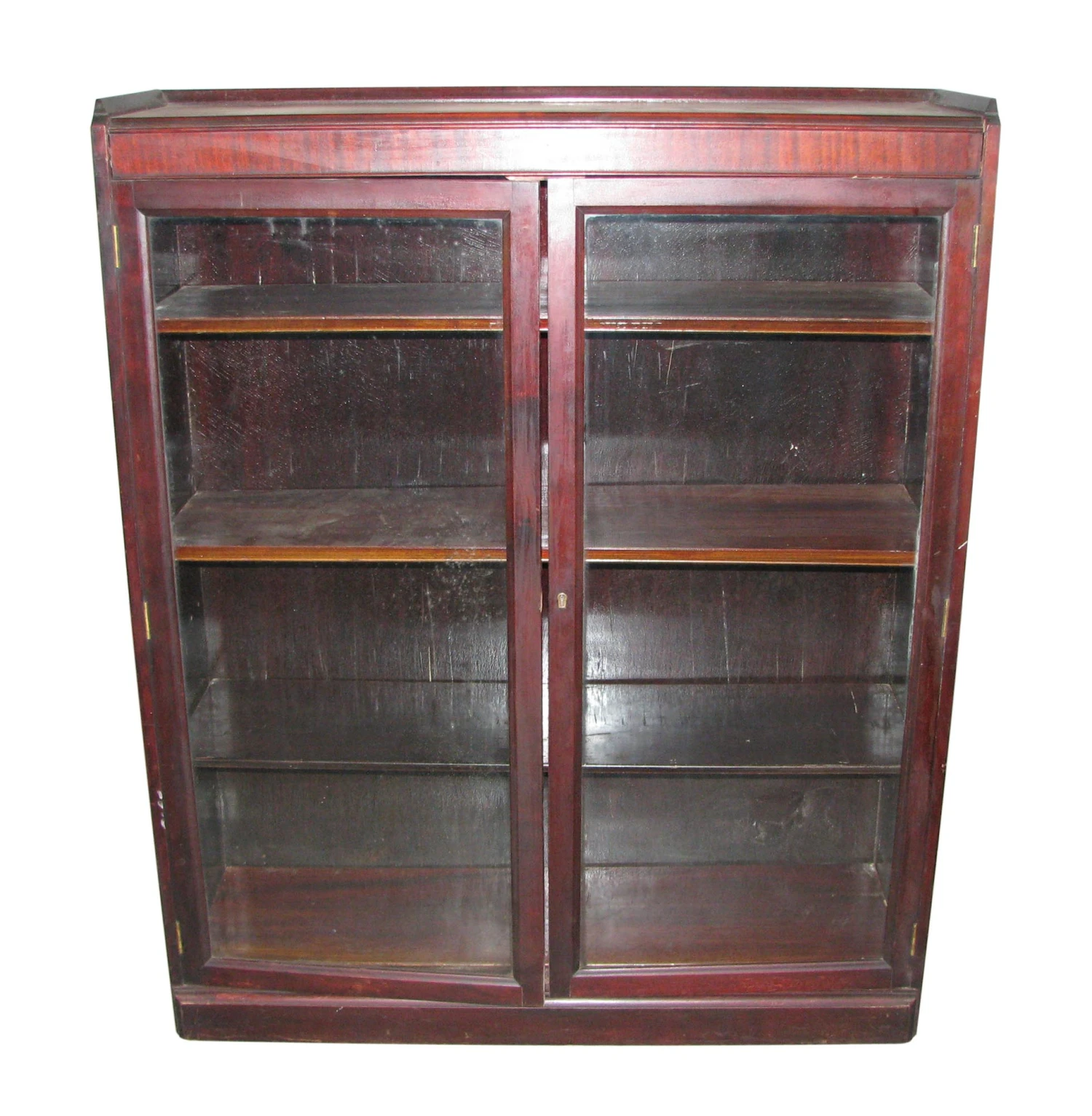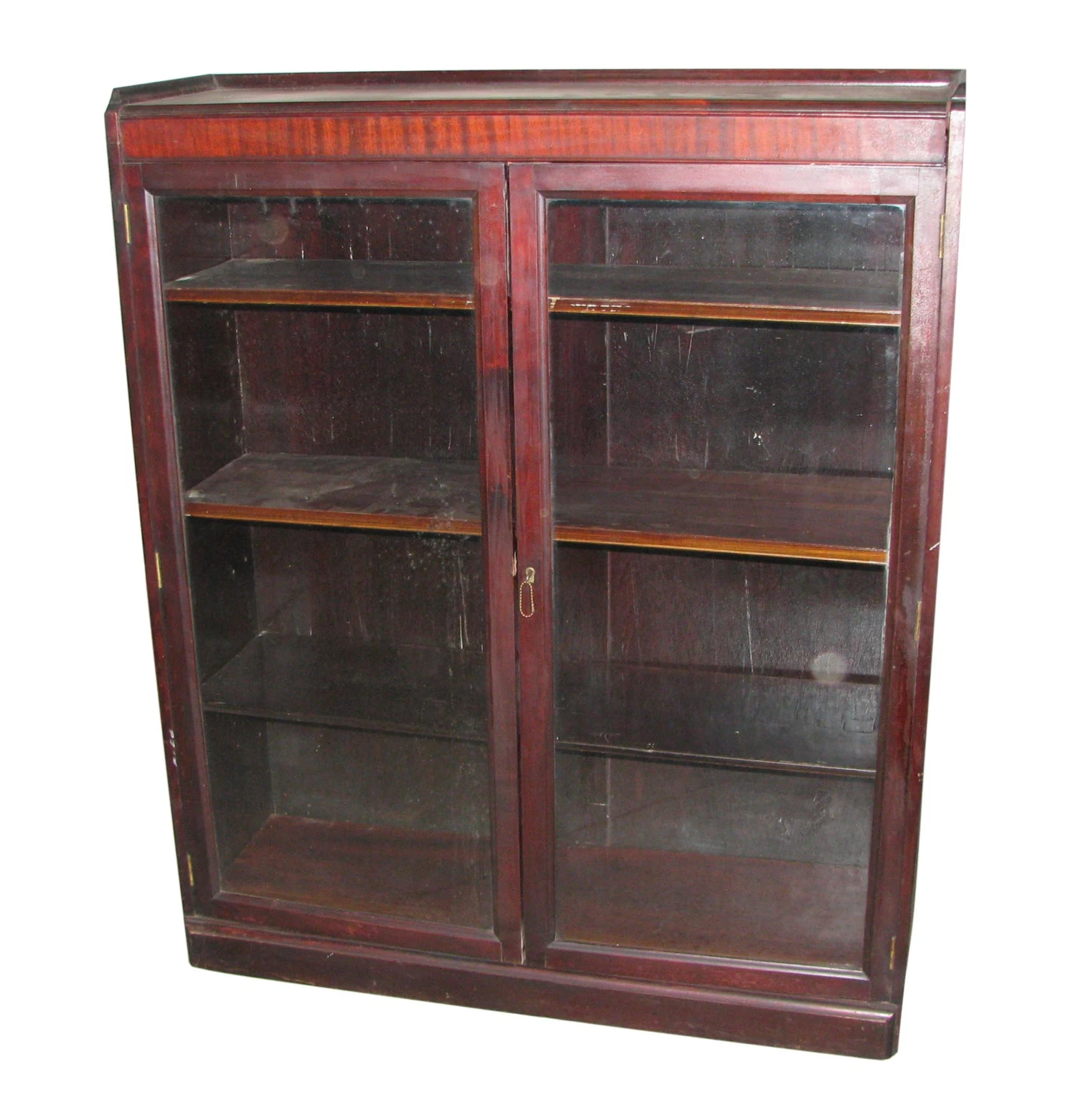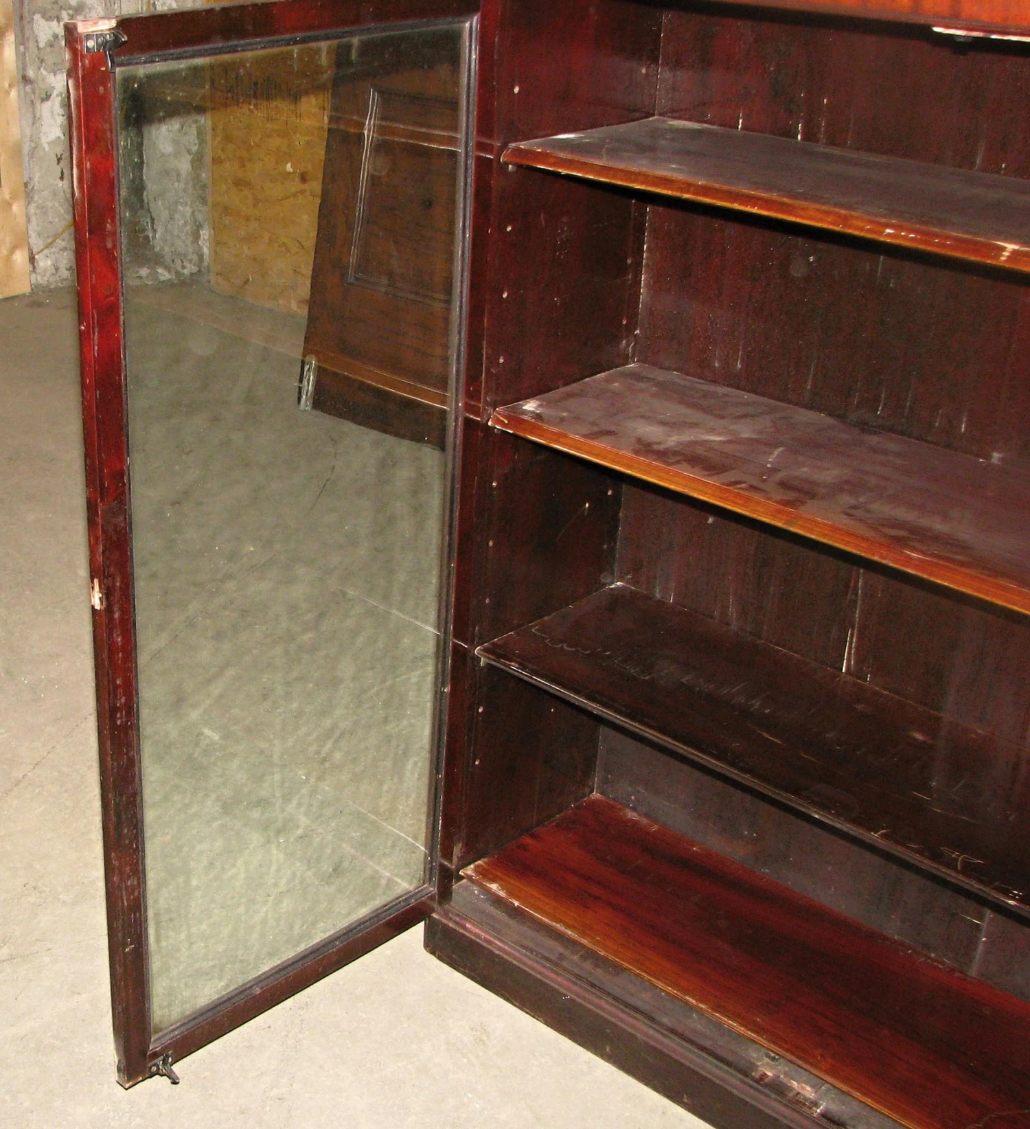 This mahogany bookcase can also be used as a display case. The cabinet is in good condition with the original old wavy glass. The key is included. The top needs to be refinished.