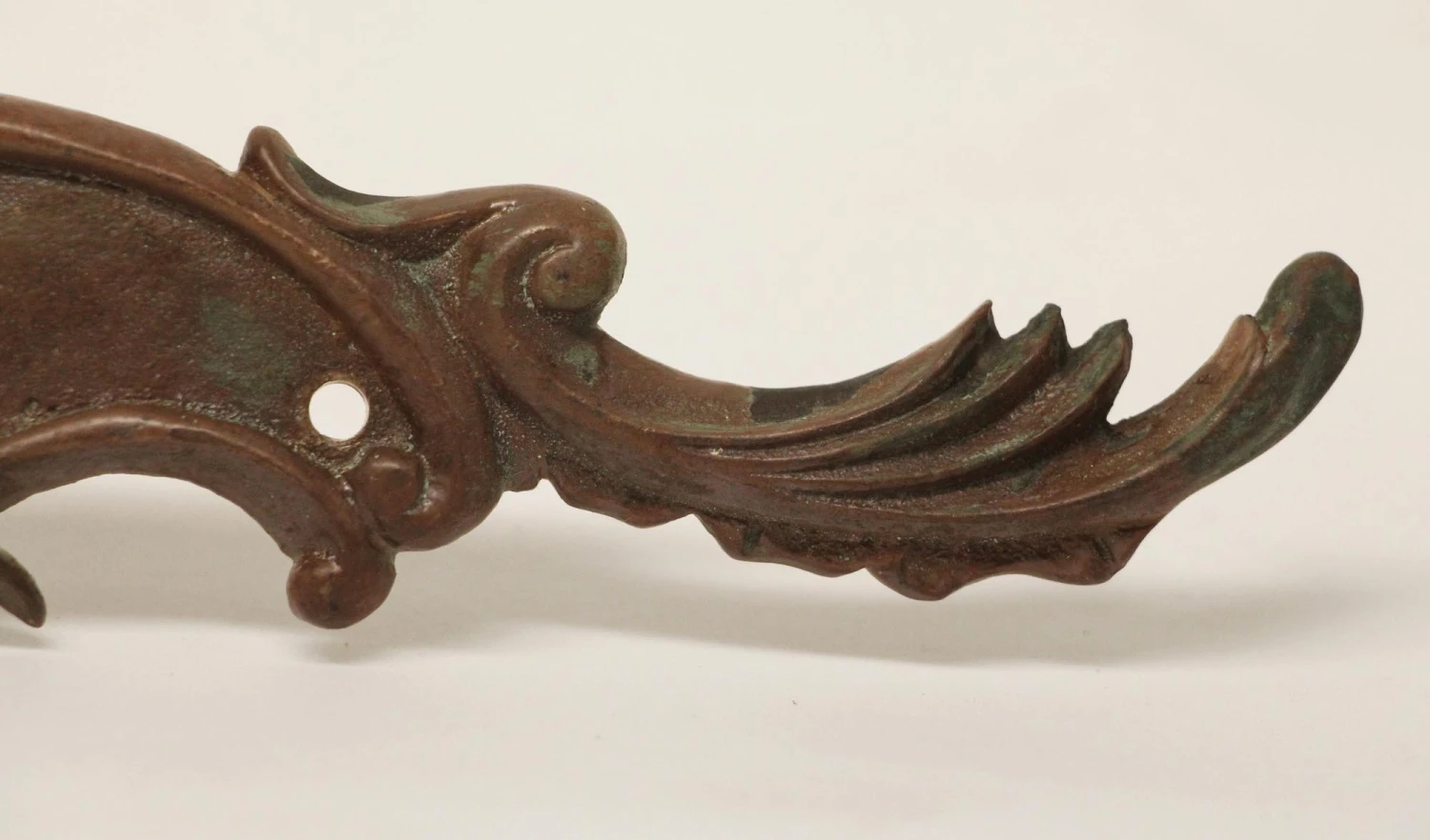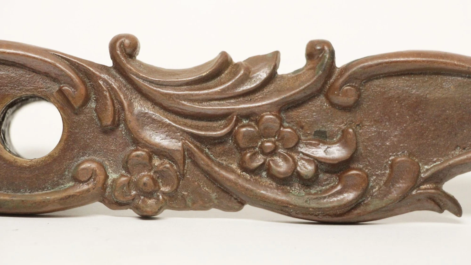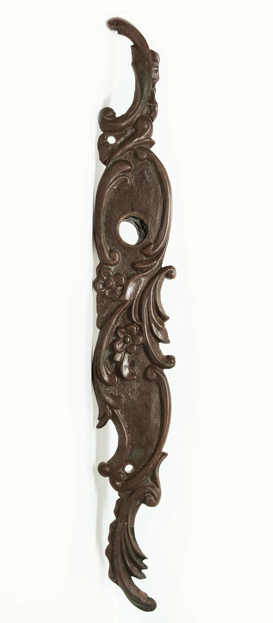 Decorative back plate with floral detail and a brown patina. Inscribed W on the back. Priced each.