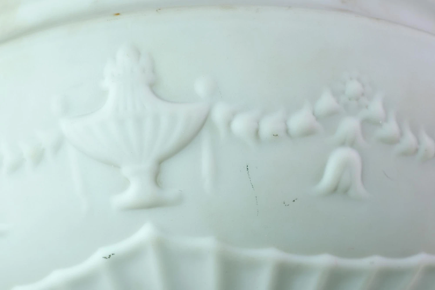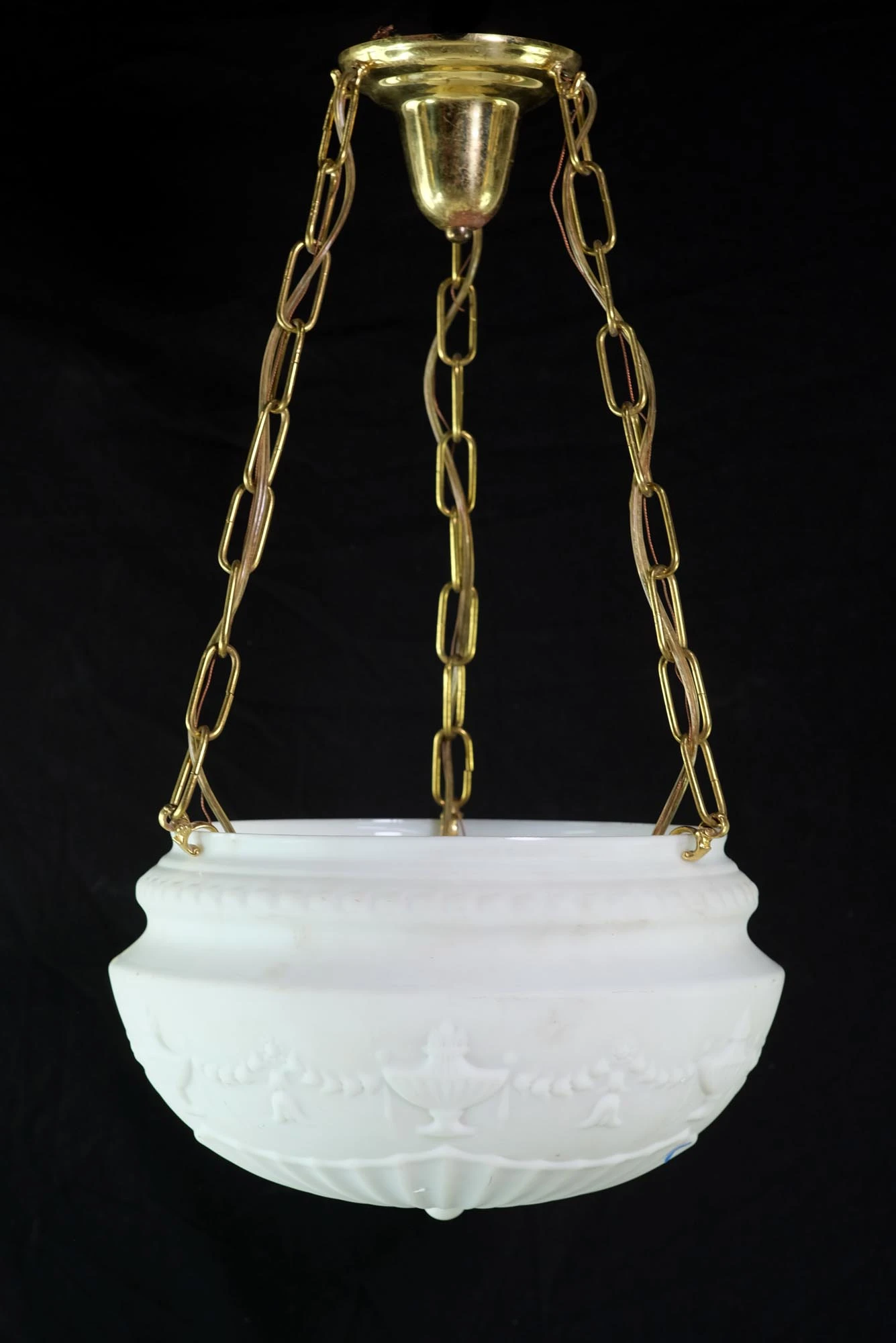 Antique white milk glass fluted dish light with embossed urn and tulip swag details and polished brass hardware. The price includes restoration.