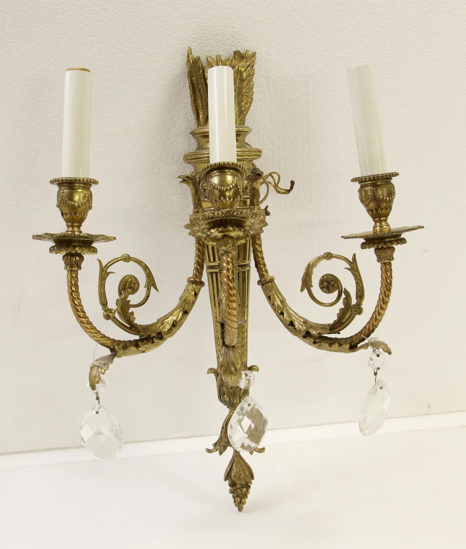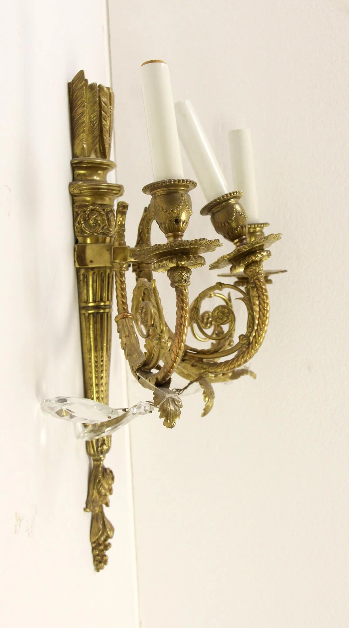 Antique French Torche Brass & Crystal 3 Arm Sconces