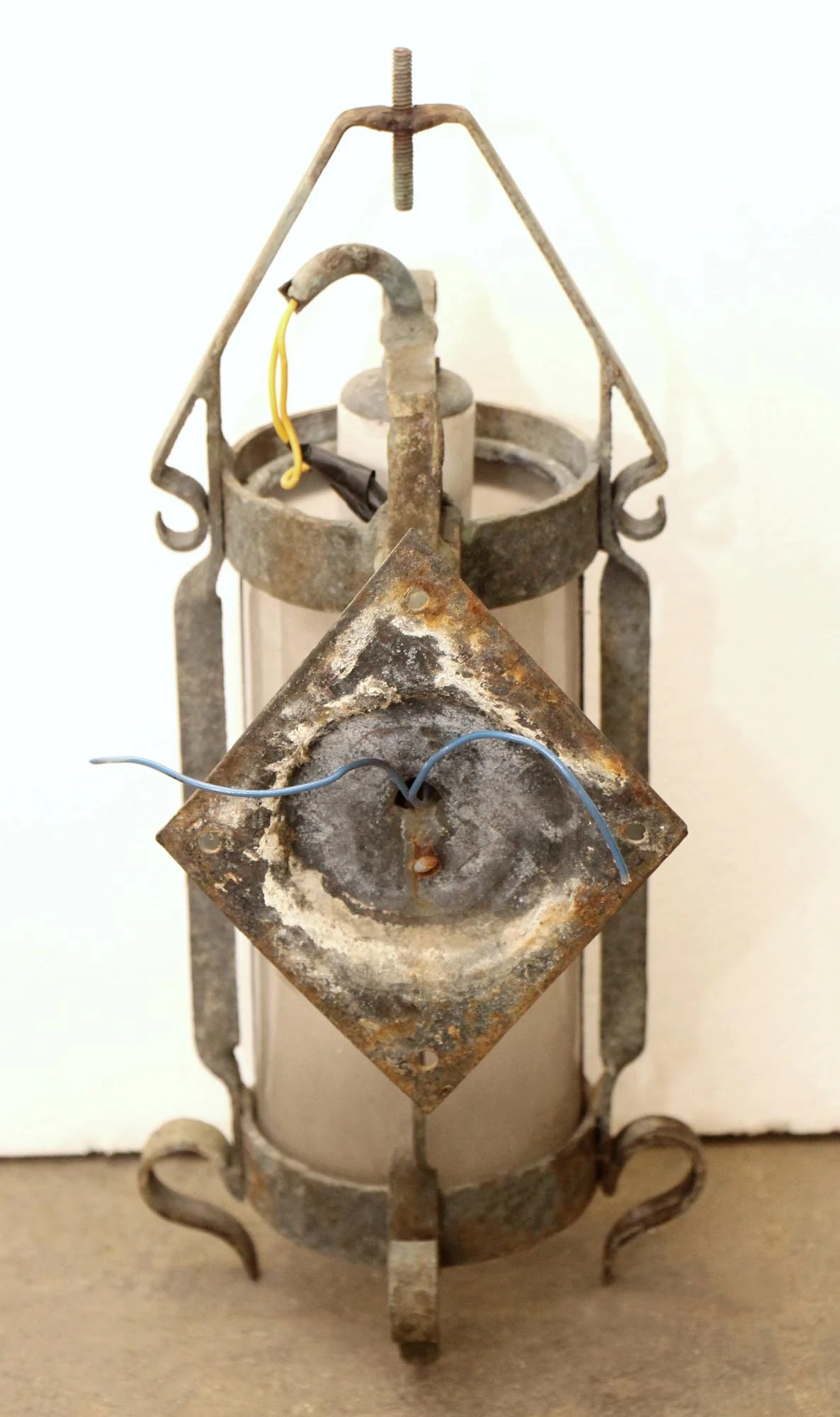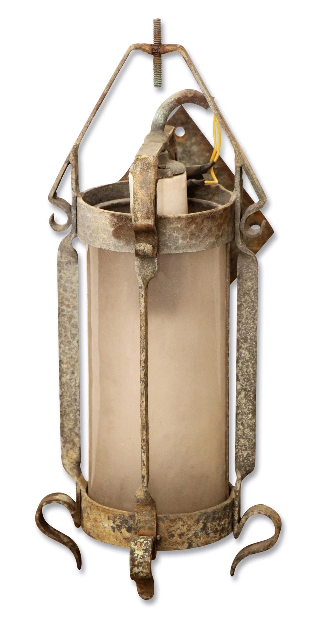 Antique Gothic style wall lantern with hammered metal details. This fixture has the original curved glass inserts, with some rust on the frame. Price includes restoration.