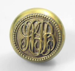 Pretty polished brass emblematic knob with a concentric beaded design. The manufacturer is unknown. During the late 19th century individuals and institutions ordered their initials or logos to be produced on their door hardware. The result is a vast variety of calligraphic hardware now available to collectors. Priced each per single individual knob.
