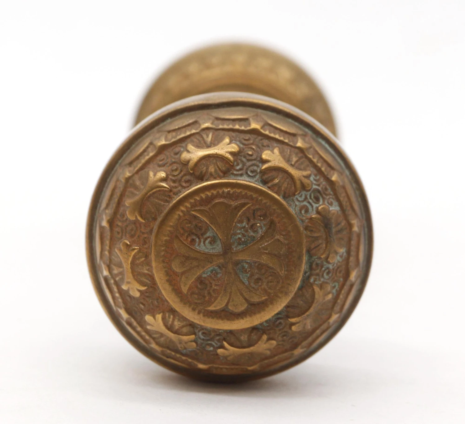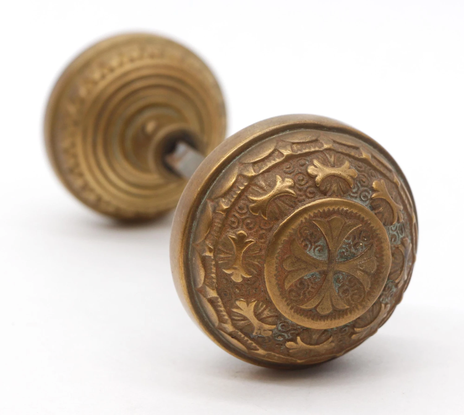 These bronze Vernacular style door knobs were made by Nashua in the 1885 catalog. They are of a four fold center with an eight fold outer design. Patinas will vary. Part of the K-30200 group. Priced as a pair of knobs with spindle.