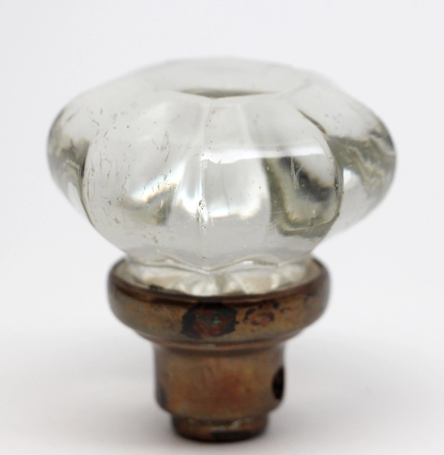 Octagon shaped clear glass doorknob with a brass shank.