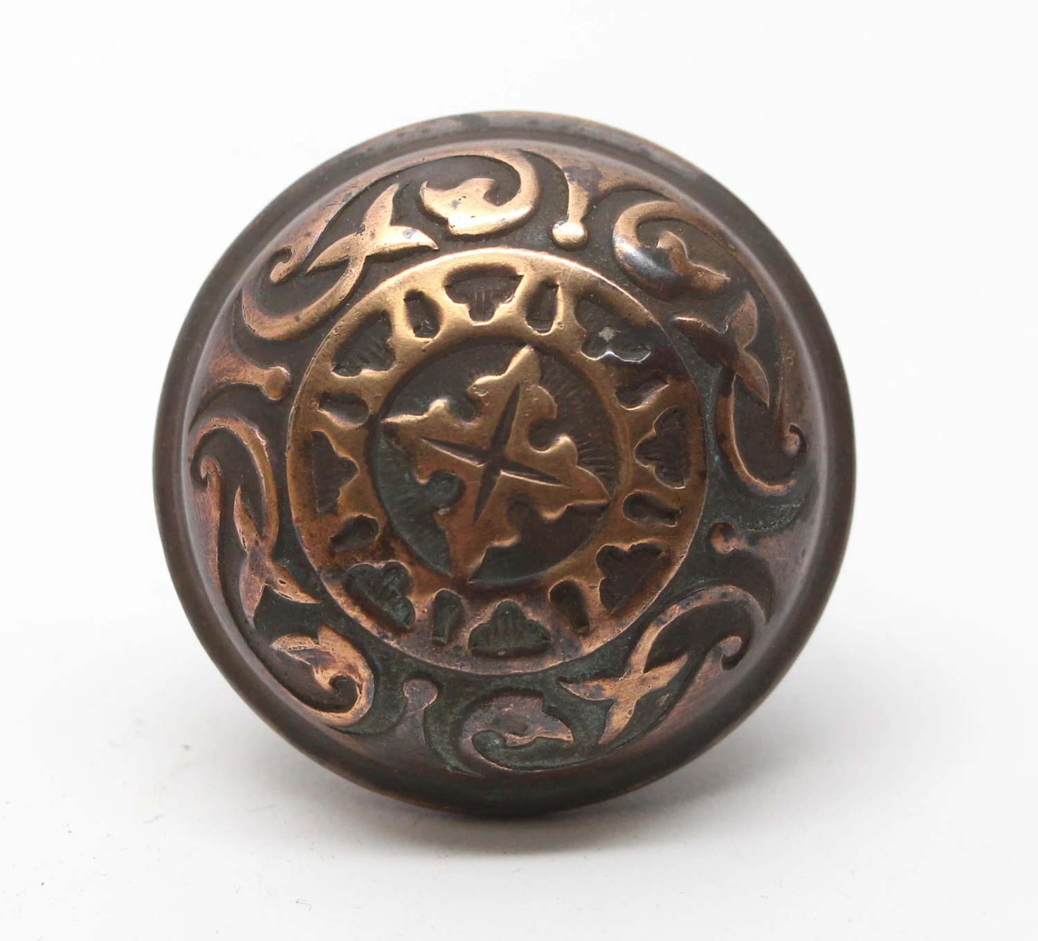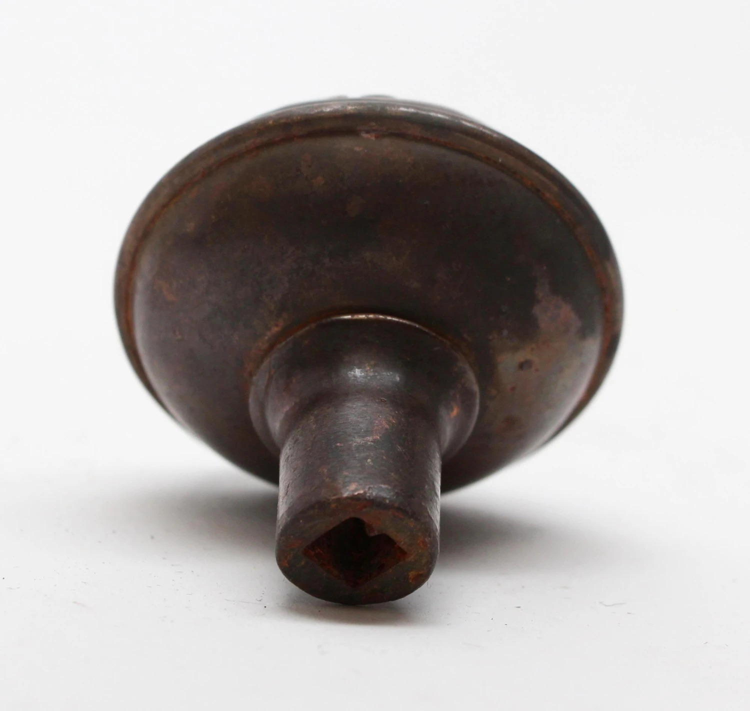 This Vernacular style four fold knob is made of cast iron with bronze plating and was made by Penn in the 1895 catalog. It is part of the H-26700 Magnolia group. The shank is slightly loose.