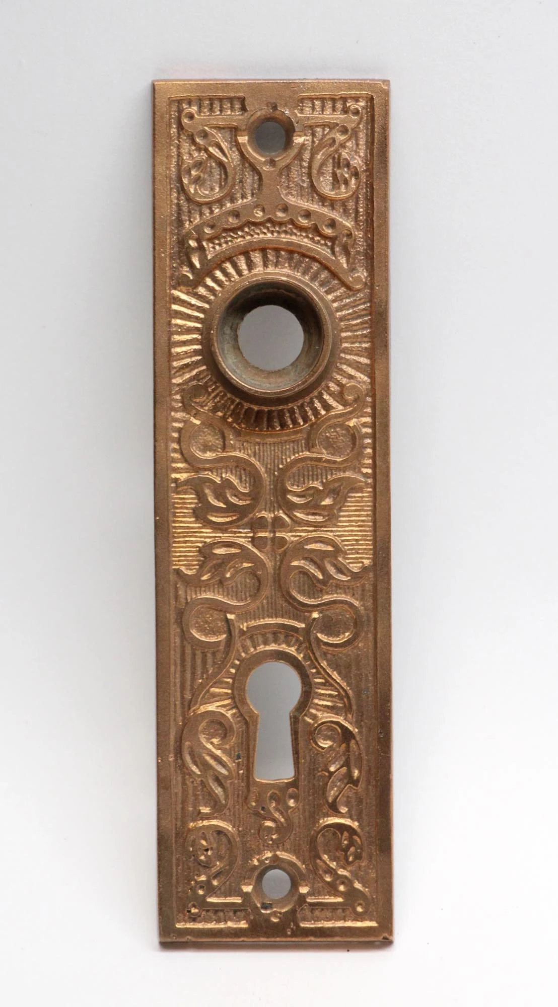 Vernacular style decorative door plate with keyhole made by Taylor & Boggis Foundry in the 1885 catalog. Part of the H-21100 group.