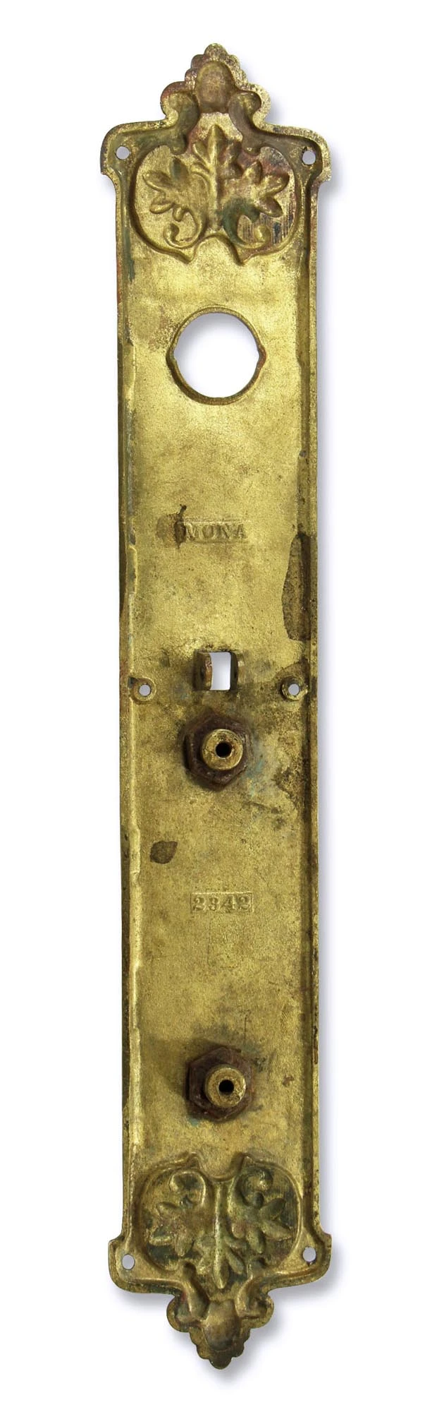 Romanesque brass door pull with a lock hole and thumb insert. Inscribed Mona. 2342. The thumb latch is missing. Please request a replacement.