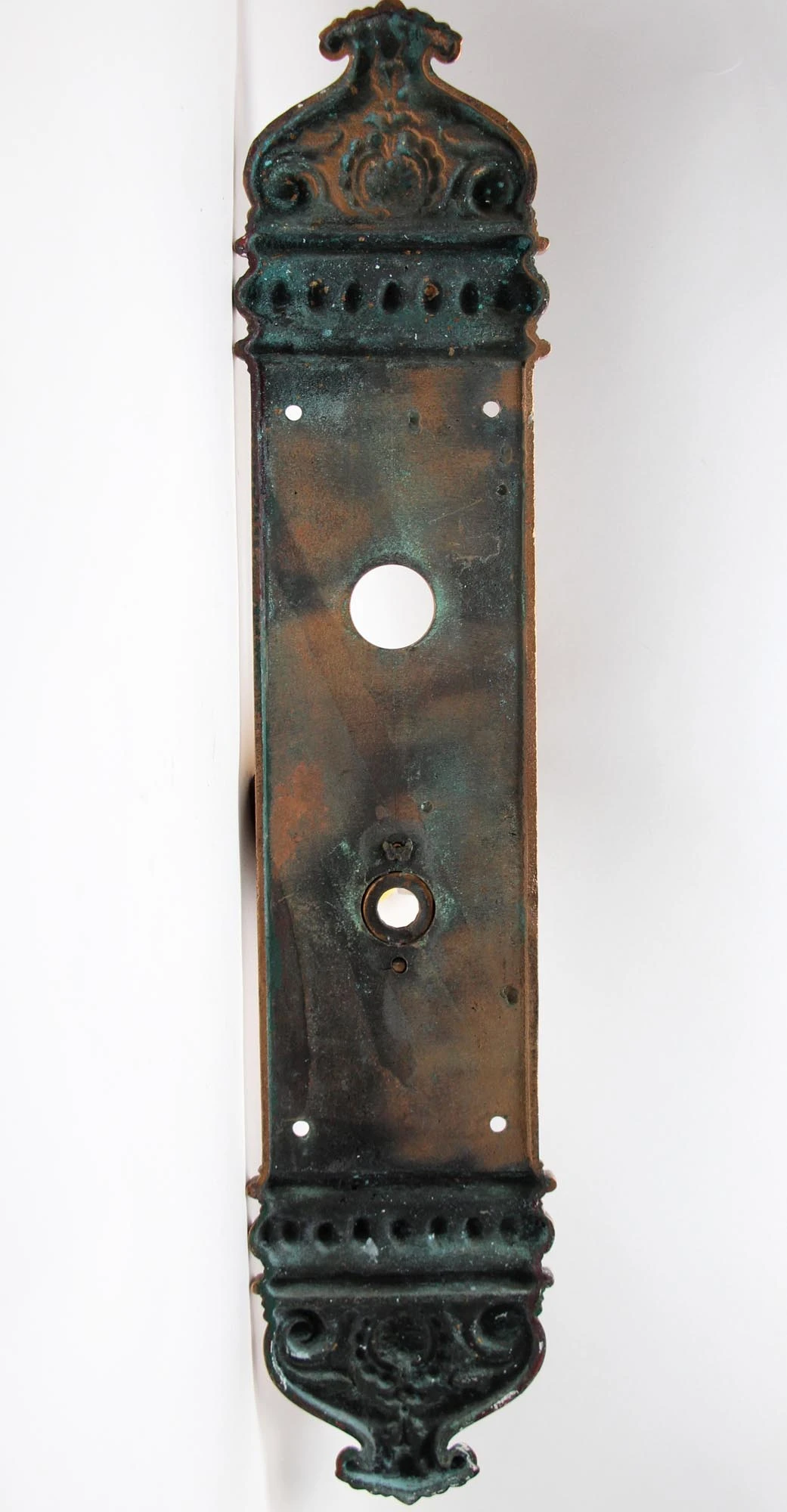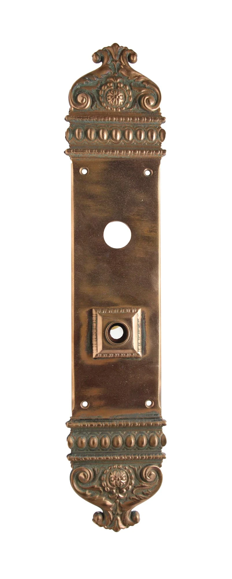 Classic style bronze entry back plate made by Russell & Erwin in the 1895 catalog. It is part of the Normandie Dedham group. One available.