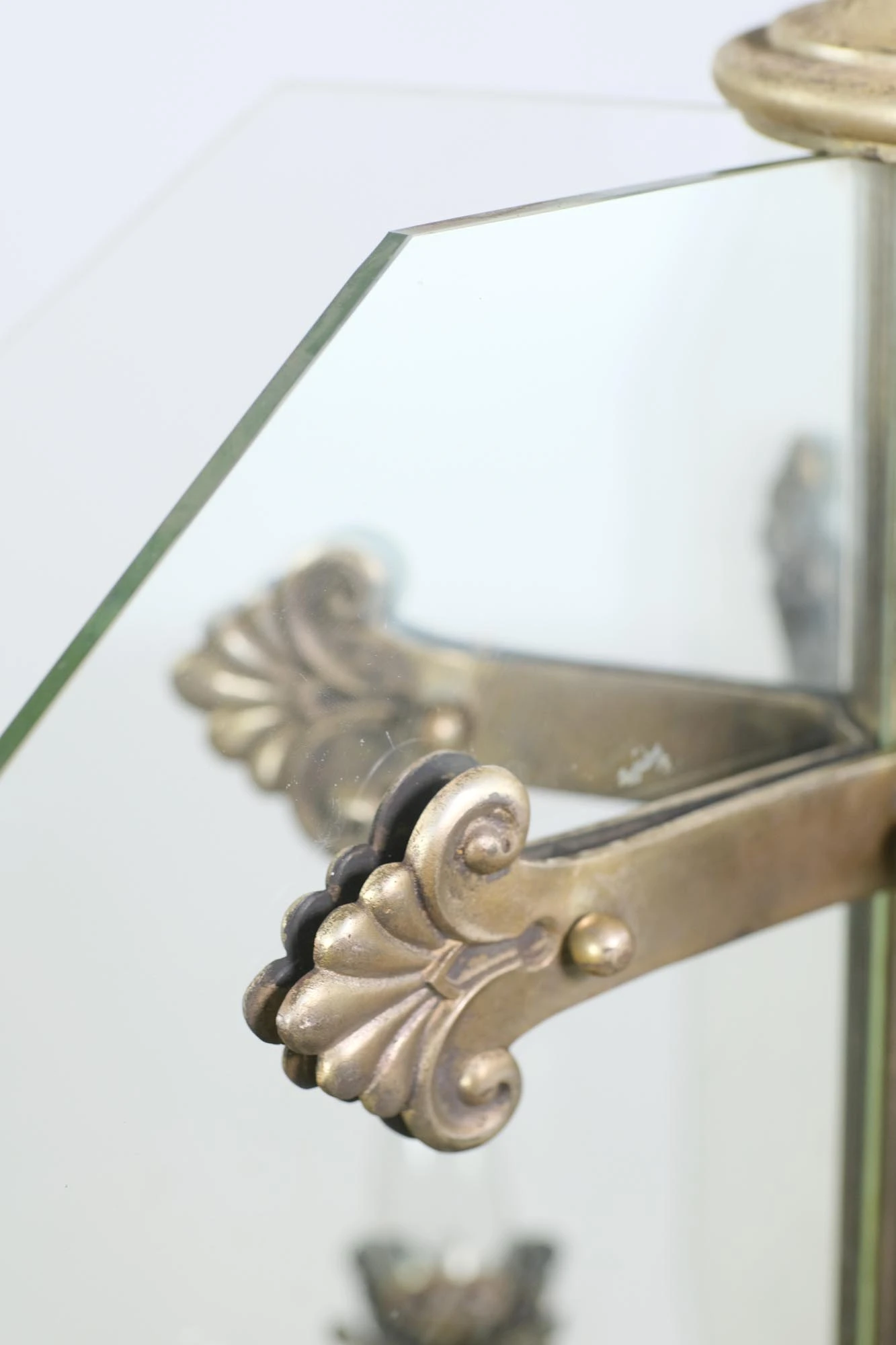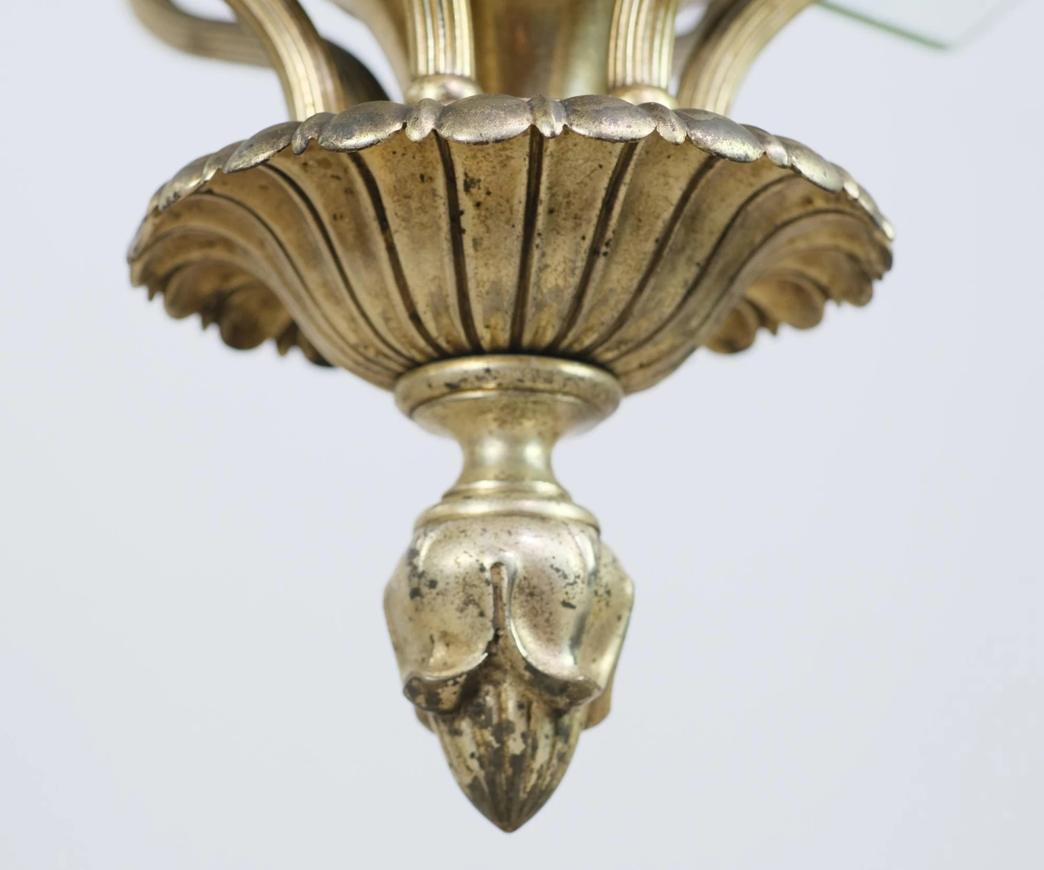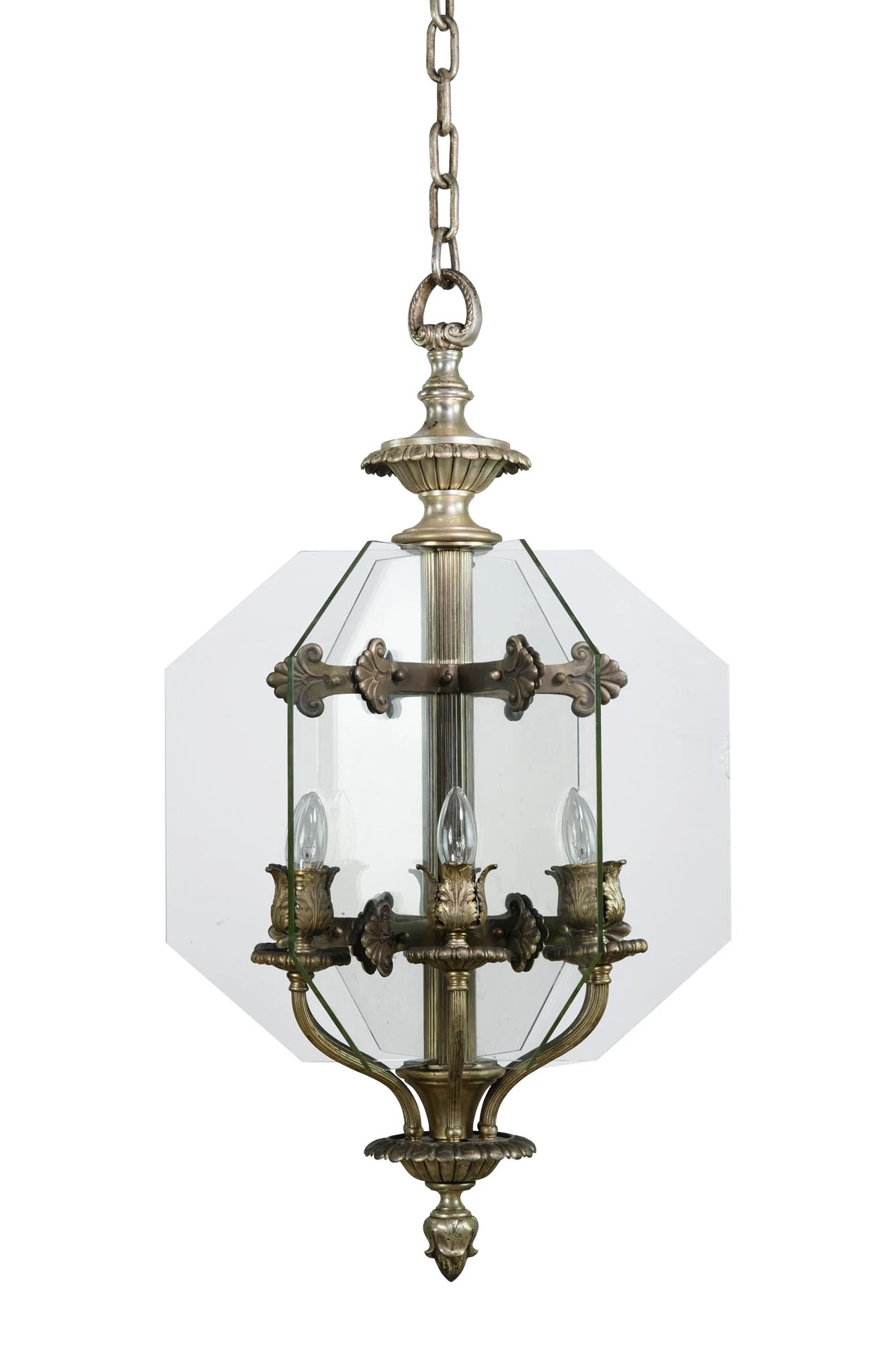 Antique silver plated bronze pendant light with beveled glass panes and six interior arms with medium base sockets. Attributed to E.F. Caldwell. The light features the original chain and canopy, along with some expected patina and wear. The price includes restoration of cleaning and rewiring.
