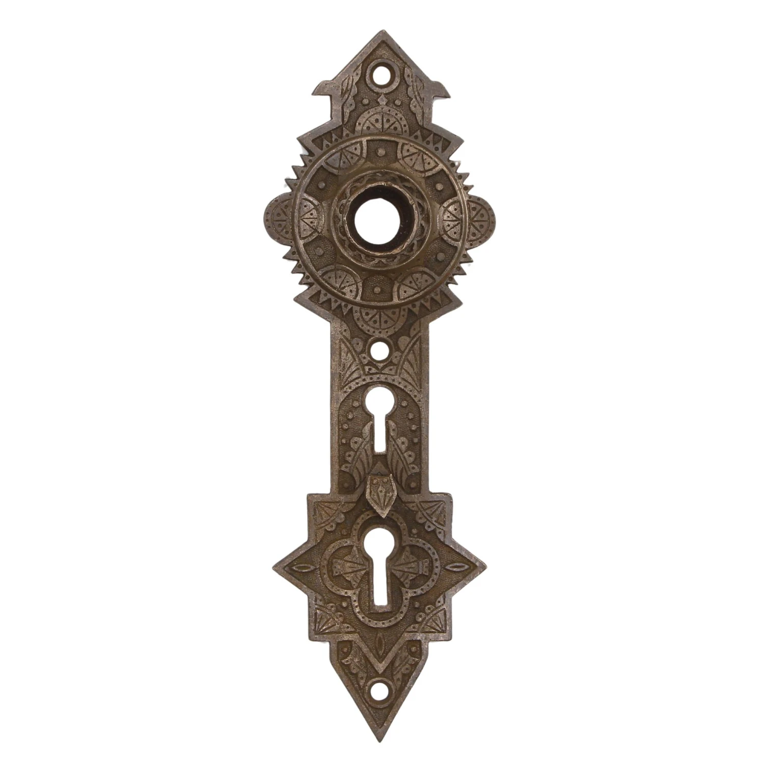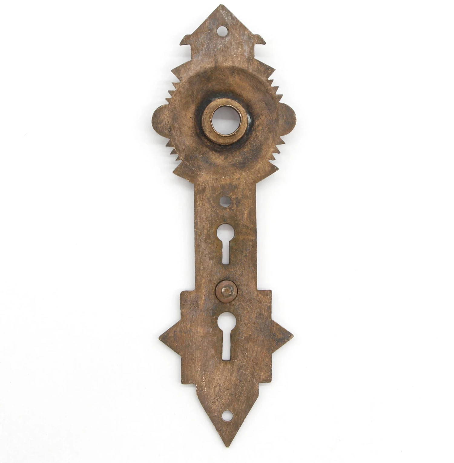 Brass ornate Victorian double keyhole back plate made by Nimick & Graham in the 1880s. Good condition with appropriate wear from age with a missing draft cover. One available.
