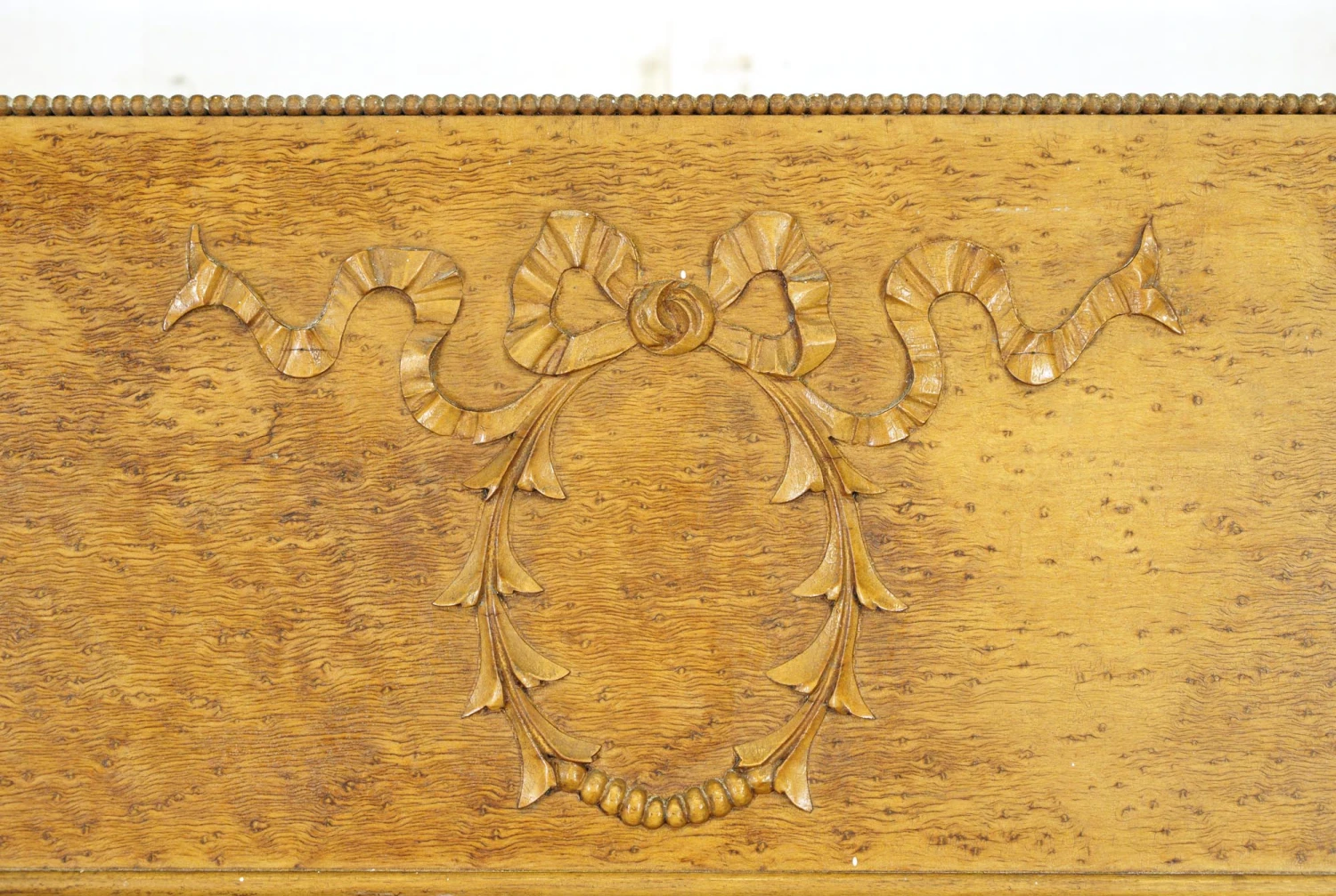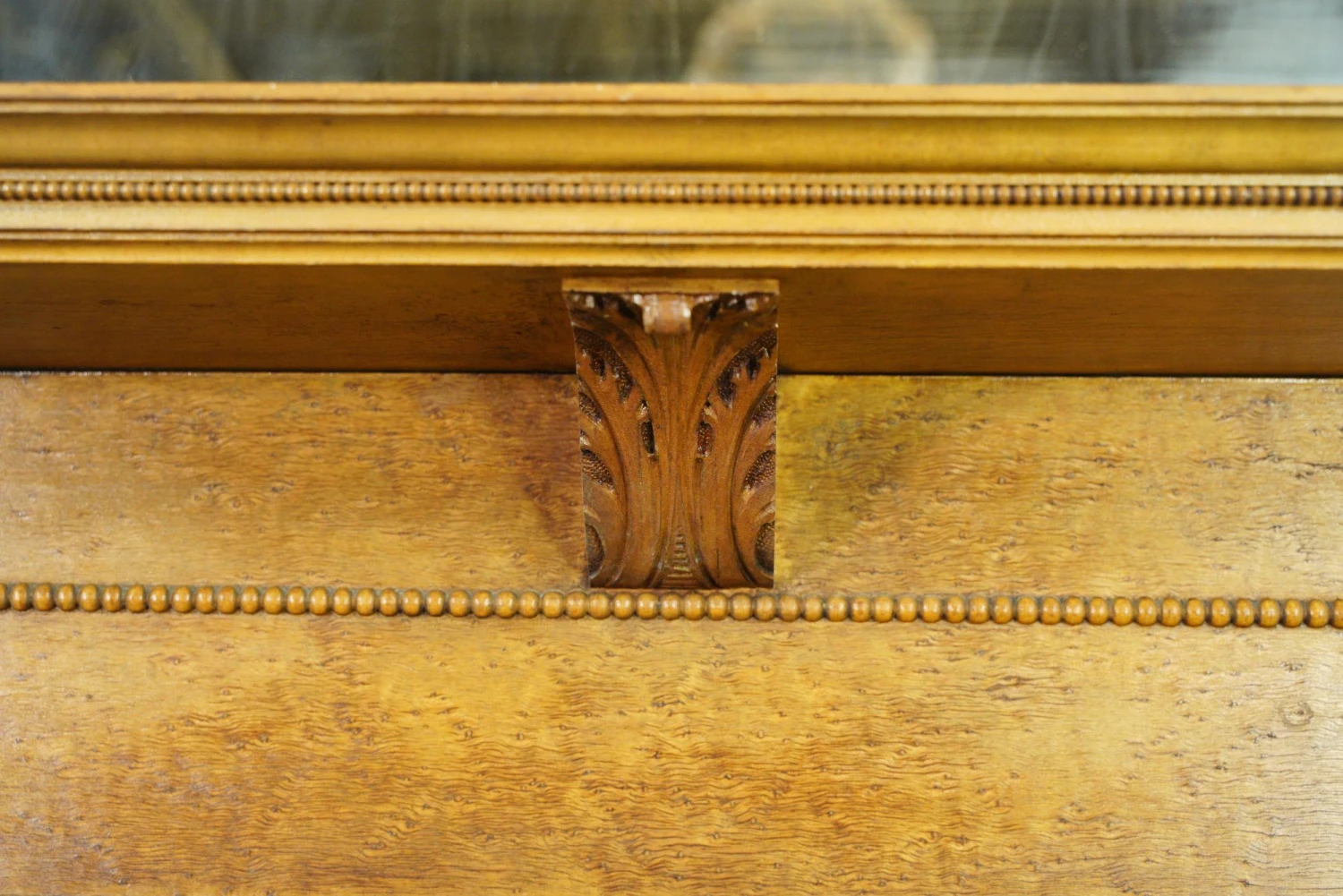 Antique Birds Eye maple mantel with an over mantel beveled mirror and detailed ornate carvings. The mirror displays signs of fading with noticeable age spots. Good condition, with chips and some carvings missing. Please refer to the pictures for a full view of the condition. One available.