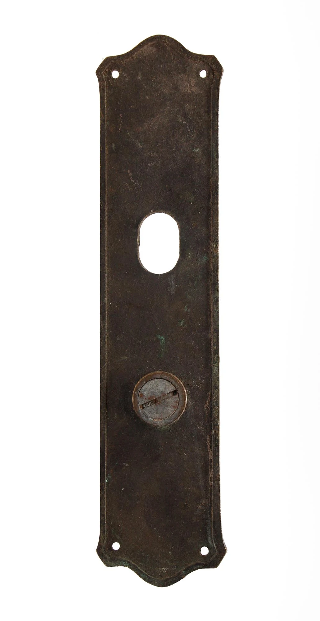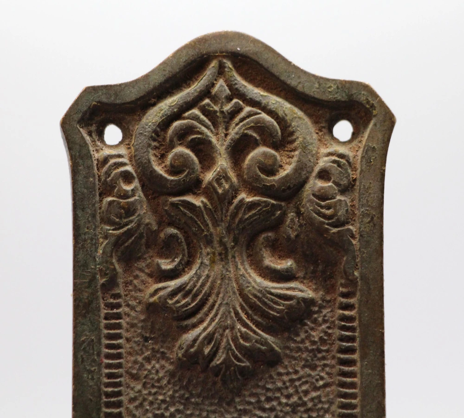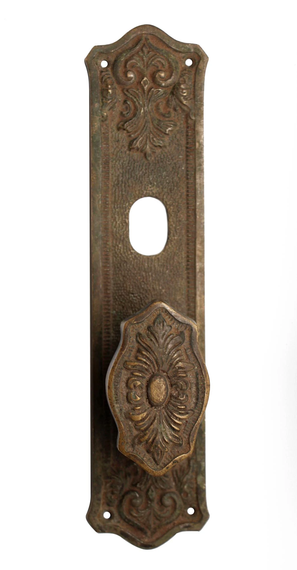 Victorian odd shaped floral oval bronze dummy knob & door plate set. Manufacturer unknown. Good condition with appropriate wear from age. Priced as one door knob and one back plate. One available.