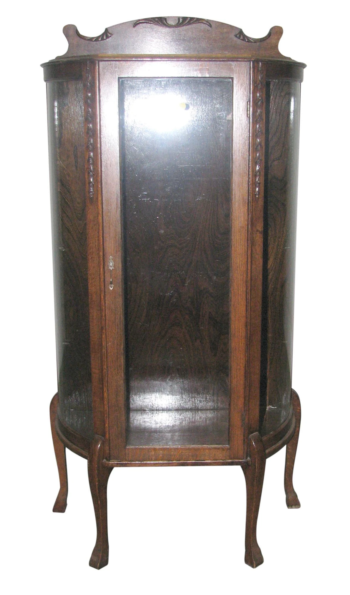 Turn of the century solid oak curio cabinet with carved details. Shelves are not included.