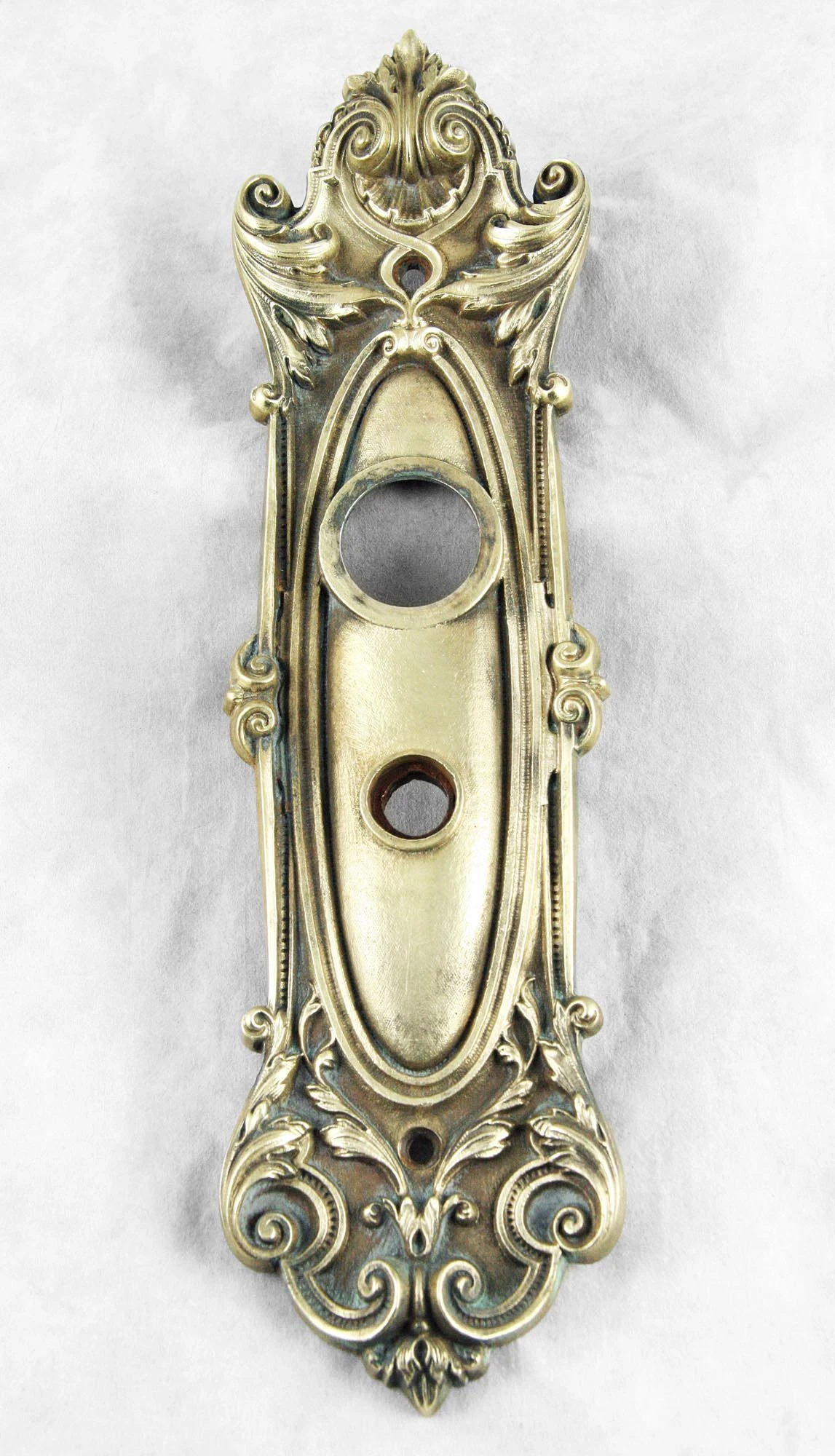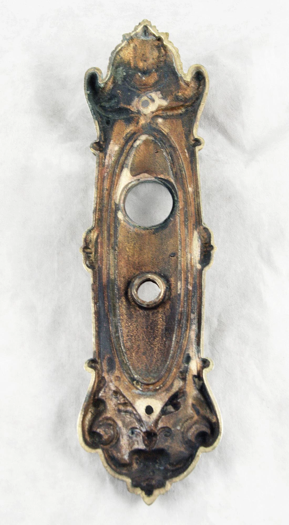 This oval brass entry door knob set was manufactured by Yale & Towne in the 1910 catalog. It is part of the N-13800 Meridian group. Good condition with appropriate wear from age. Priced as one door knob and one back plate. Please contact our hardware sales team to help you complete this into a set.