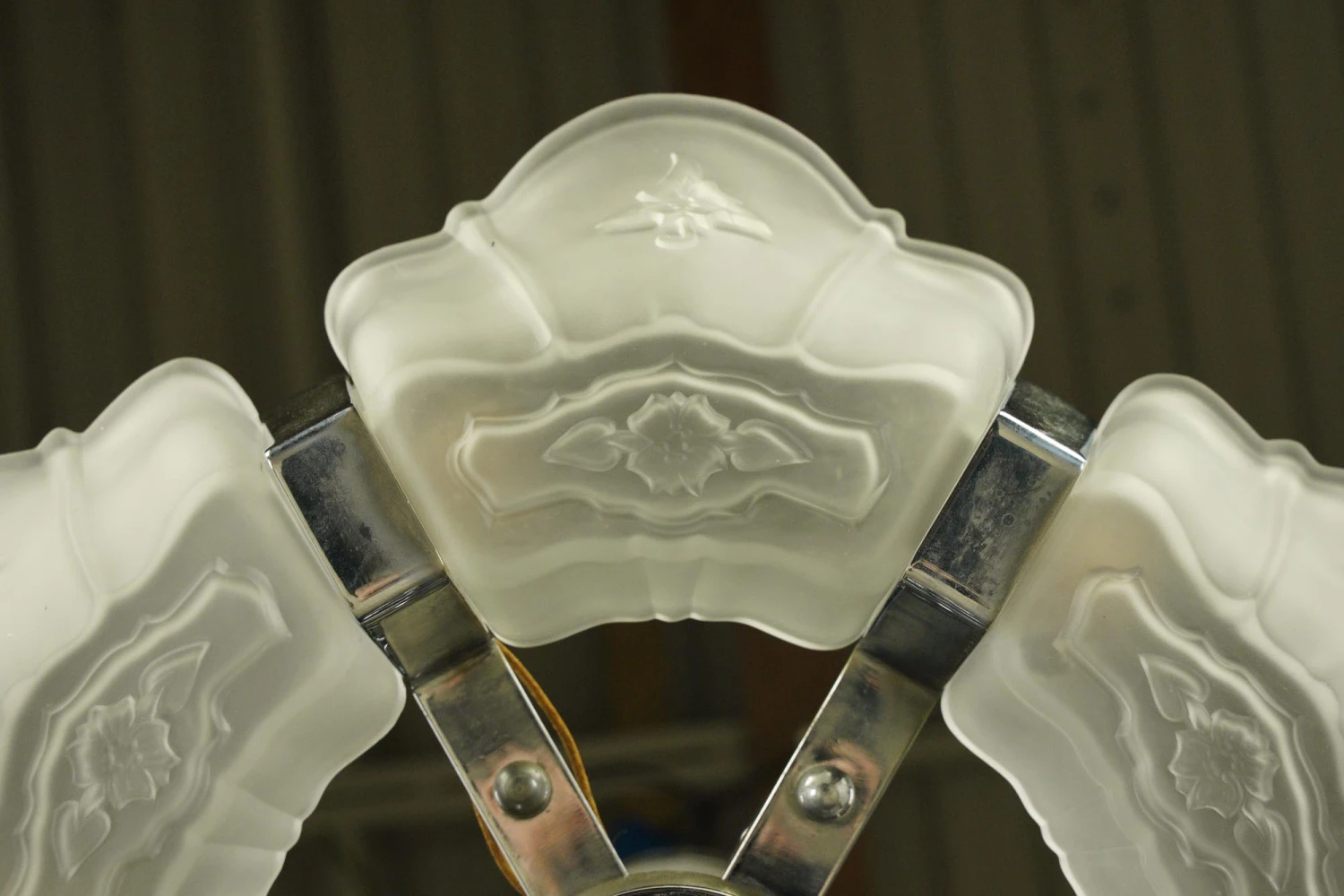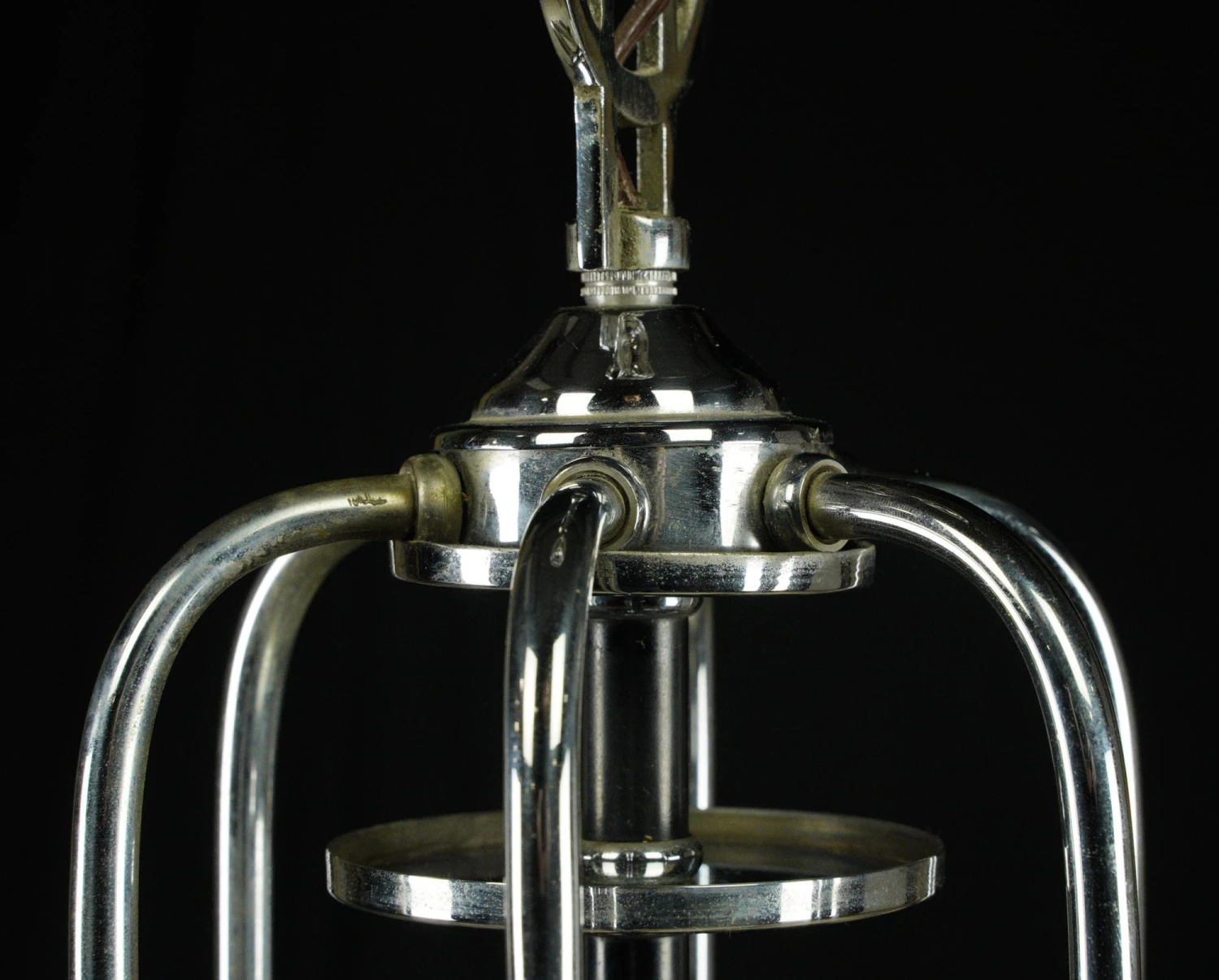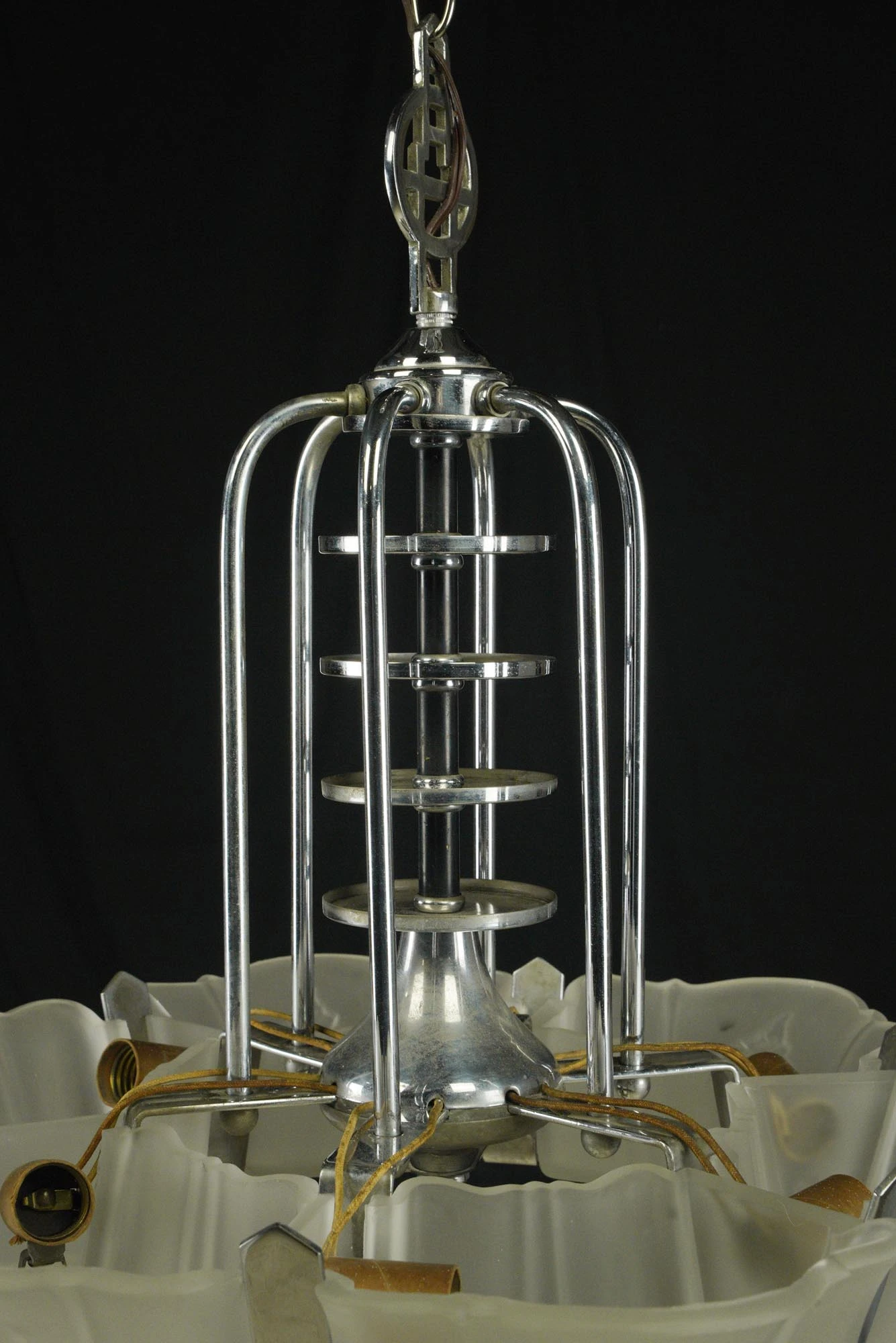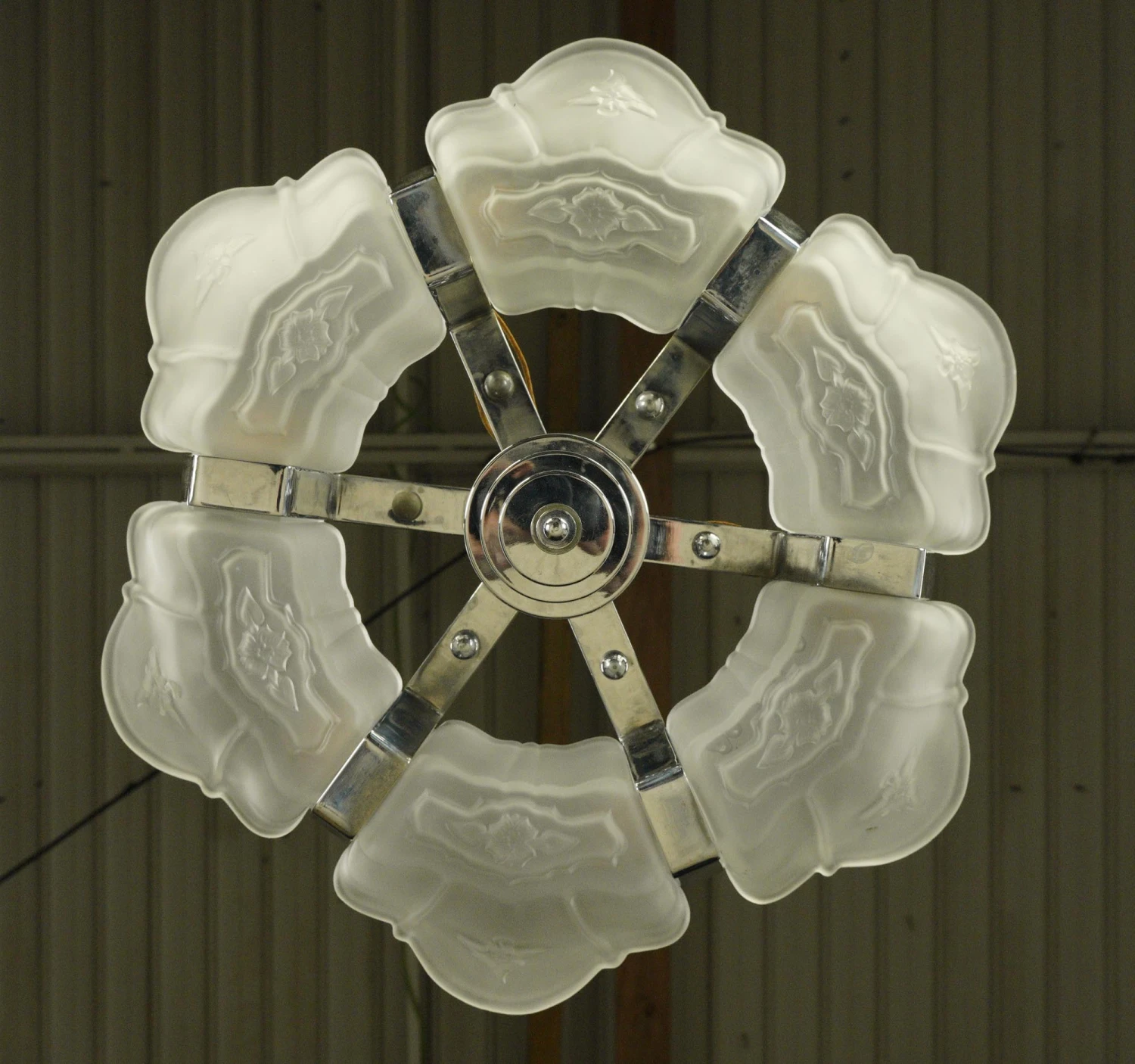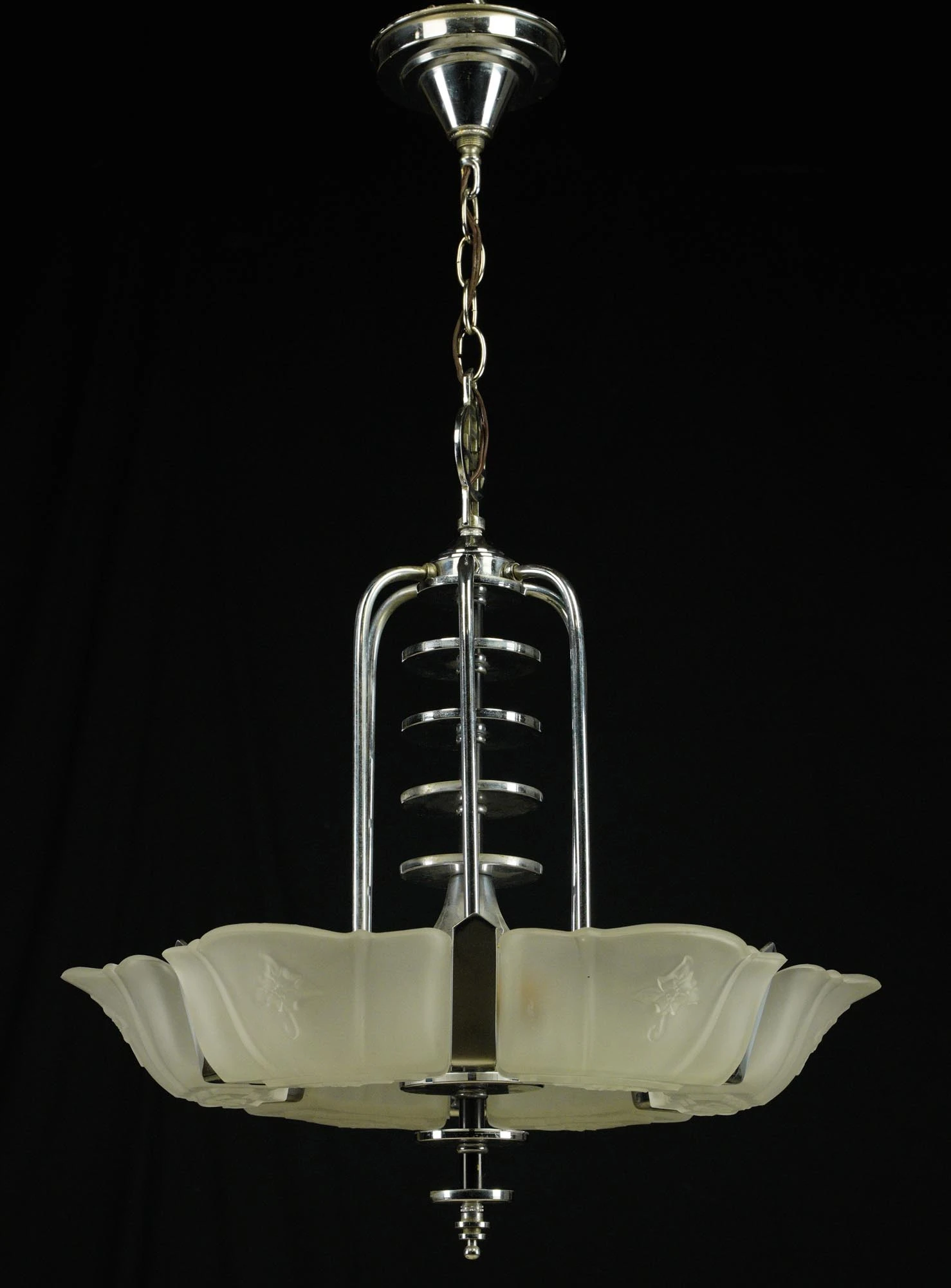 Art Deco nickeled brass chandelier with six cast glass slip shades. This requires six standard medium base bulbs. Good condition with appropriate wear from age, with minor scratches. This light is restored and ready to ship. One available.