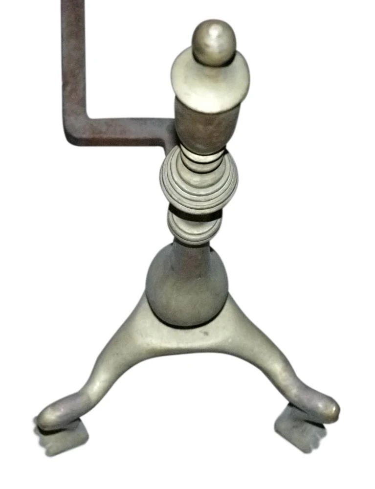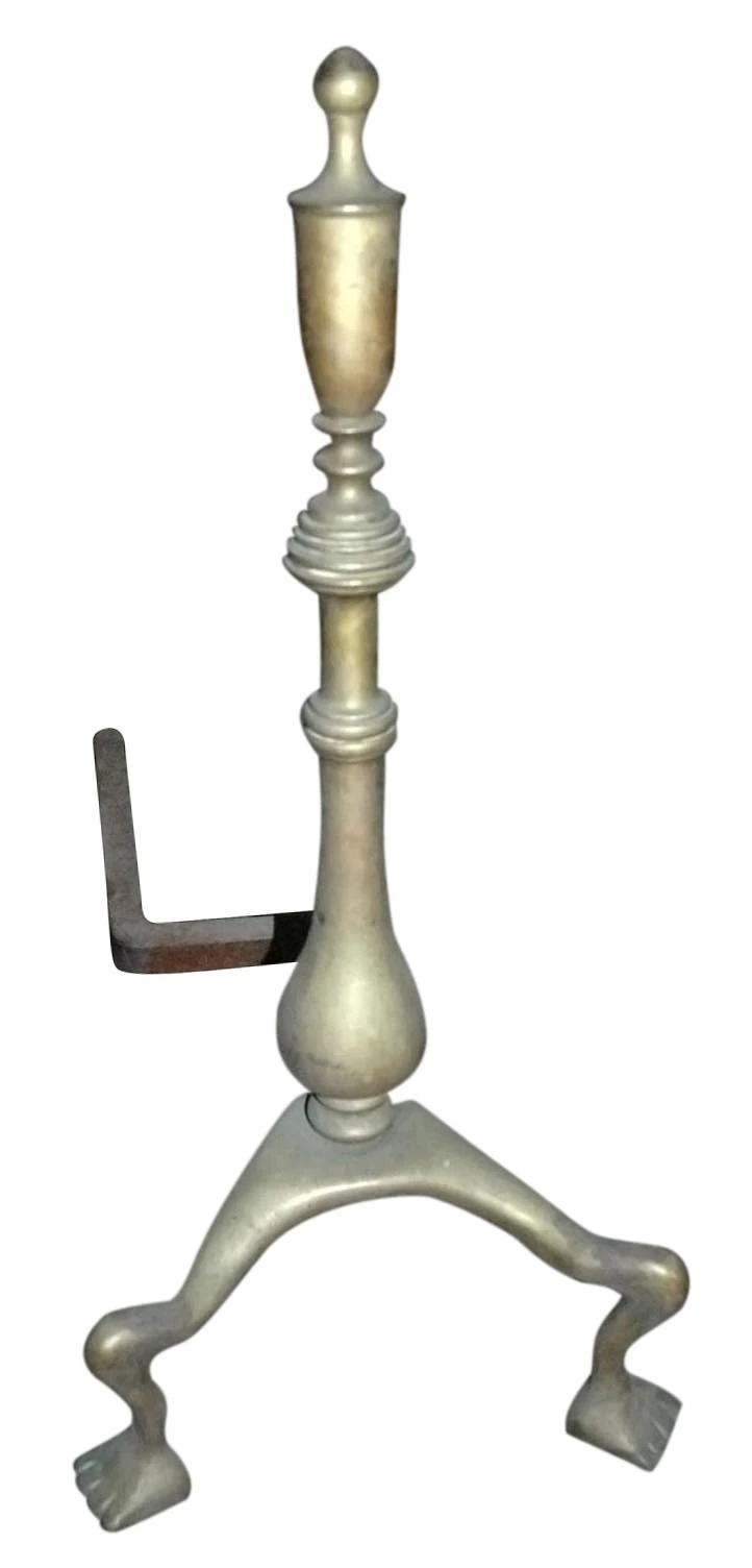 These interesting andirons are from the early 20th century. They are made of brass with a nice patina and interesting details. Priced as a pair. Sold 6/7/22