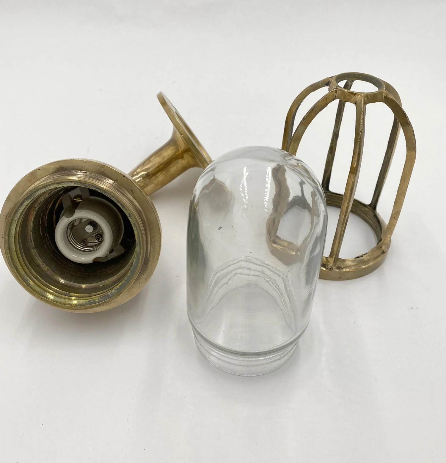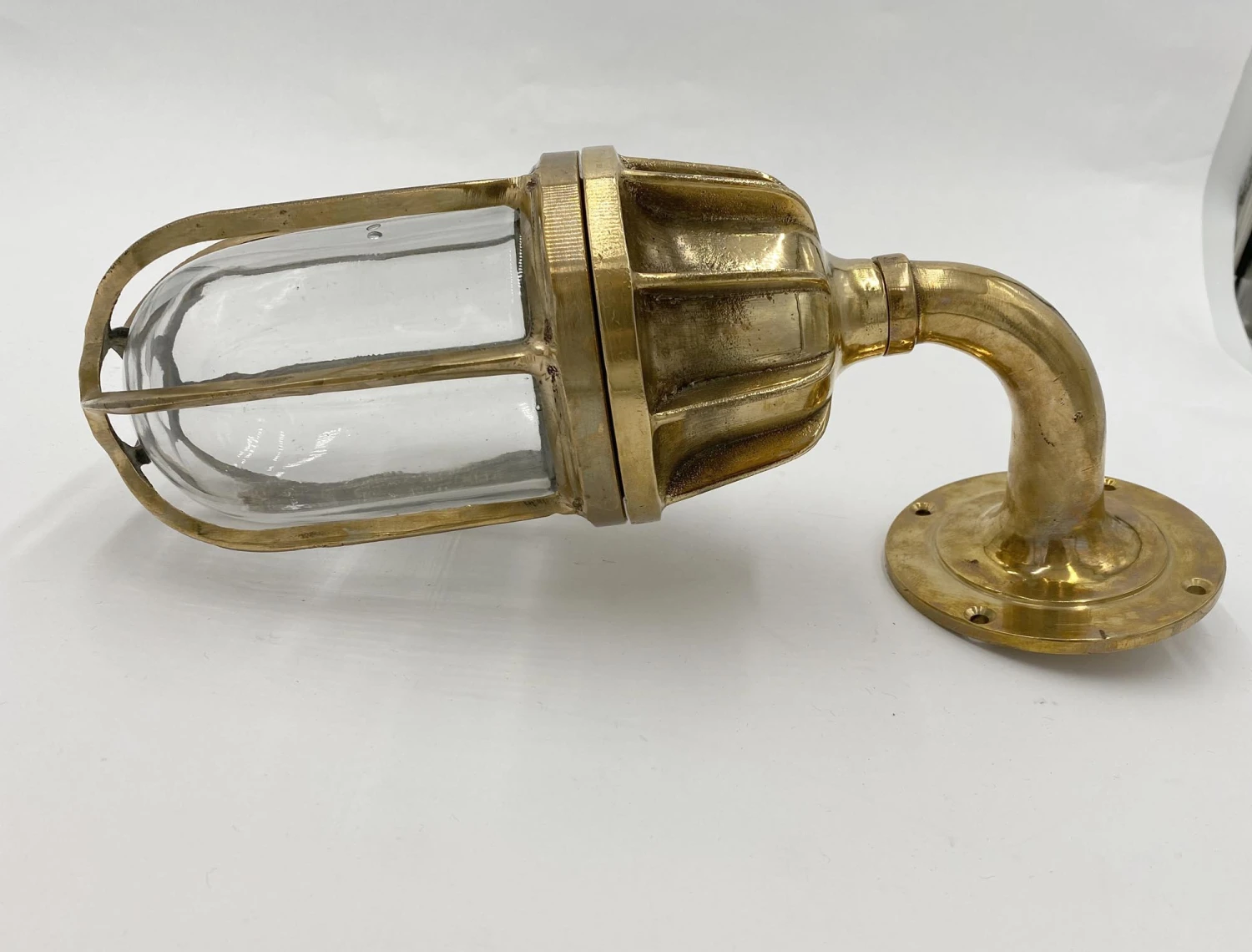 Solid polished brass ship sconce with a thin neck, vane top, and glass globe. Priced each.