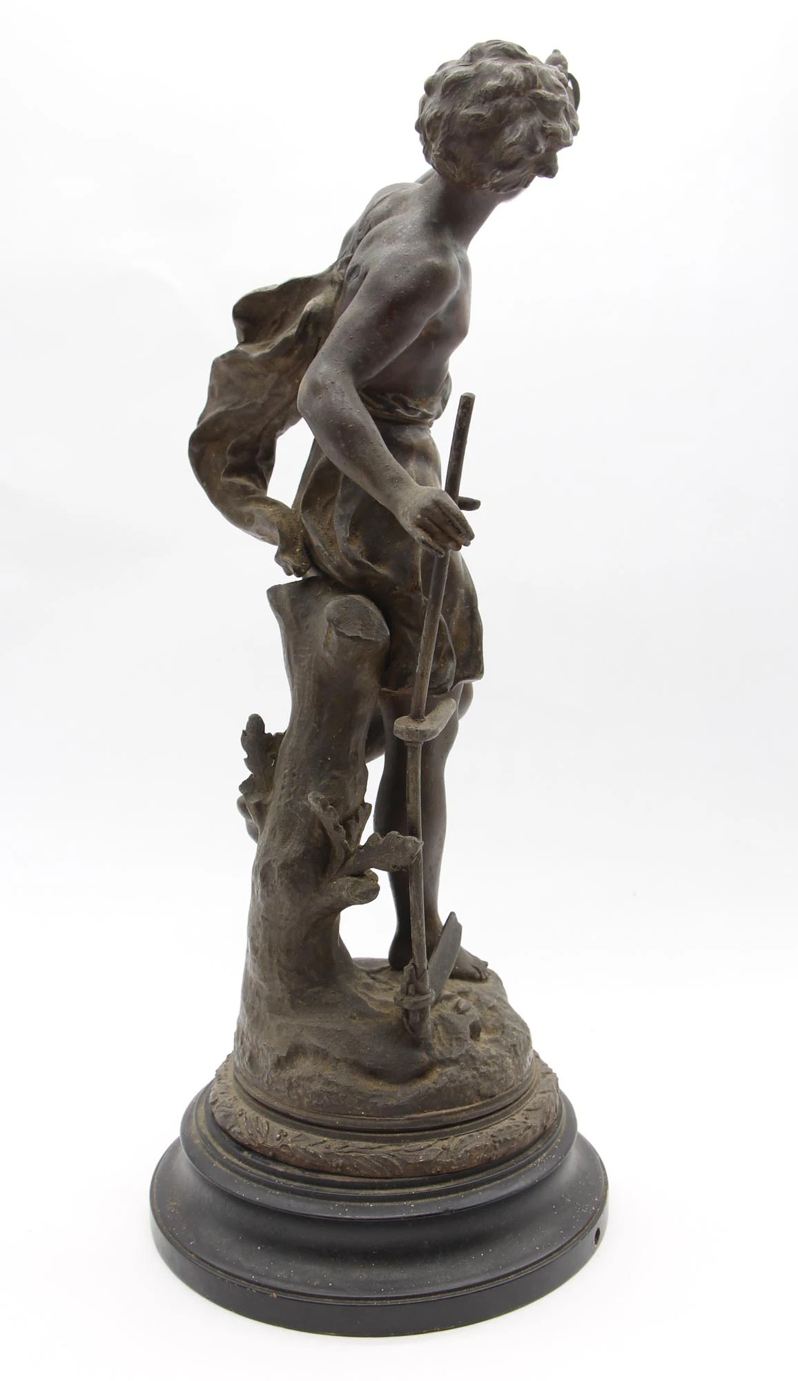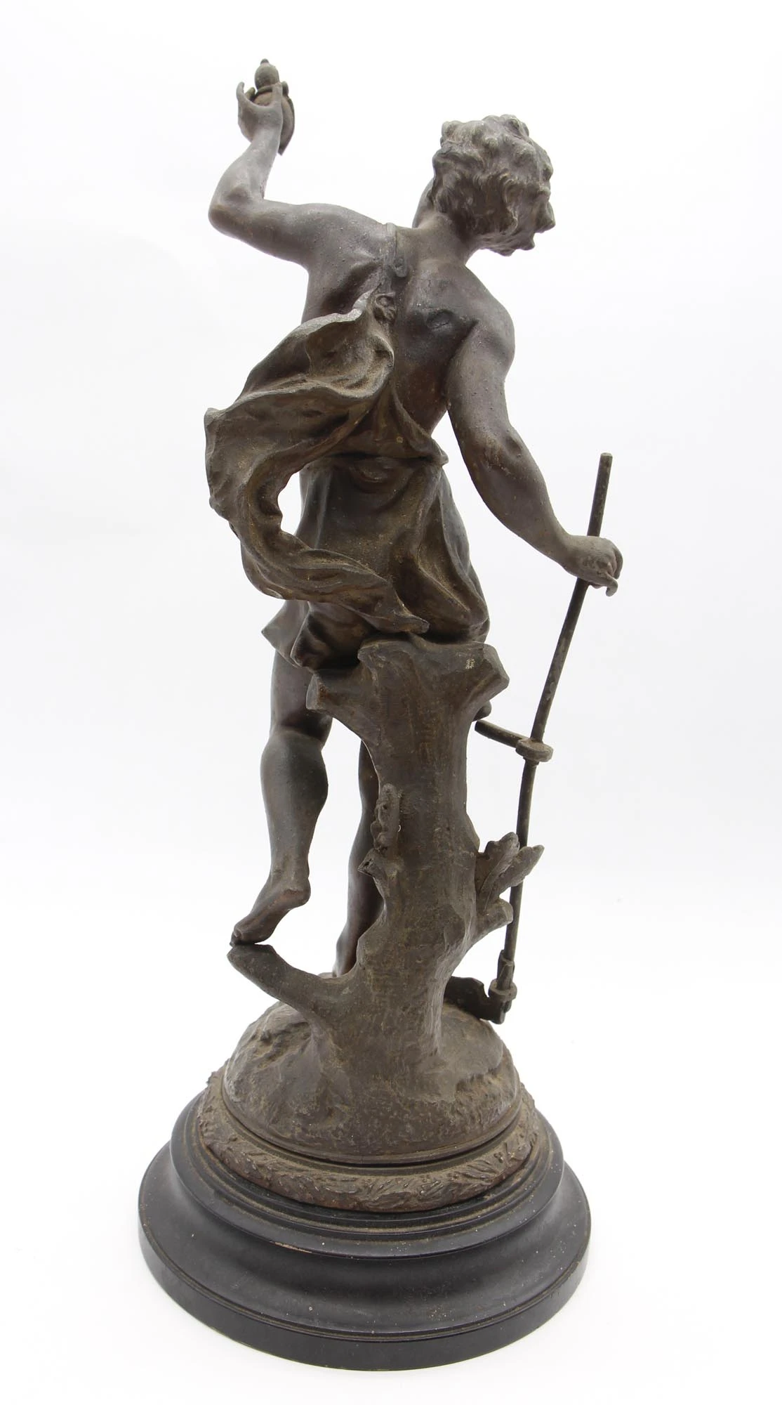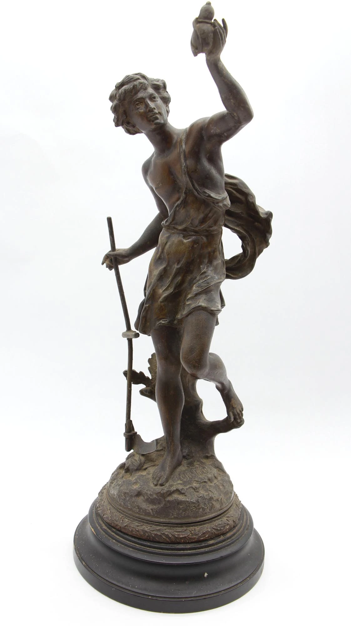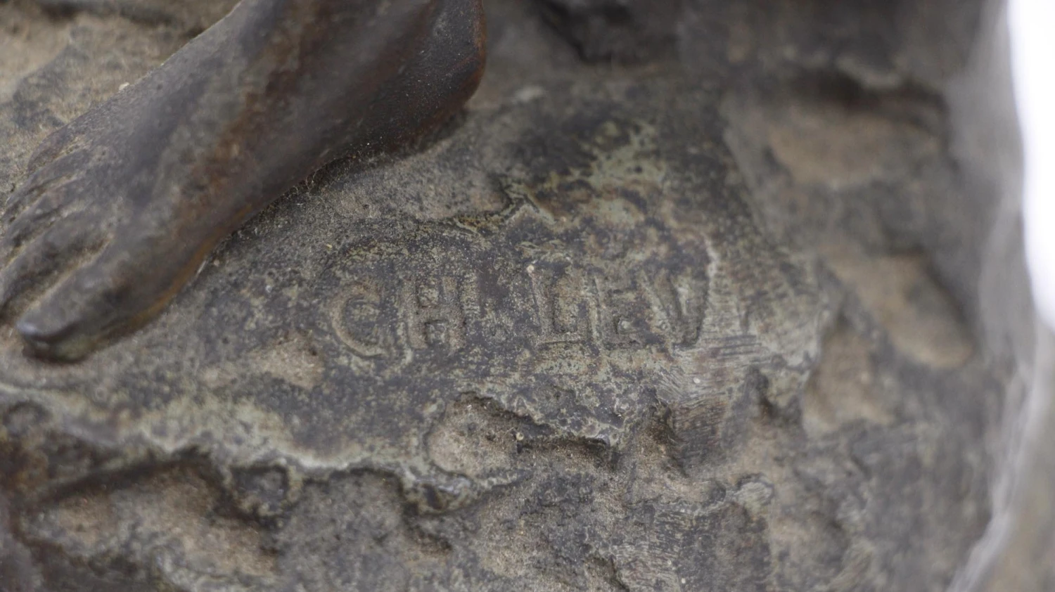 Bronze figural statue of a hunter on a wooden base. Signed C.H Levy.